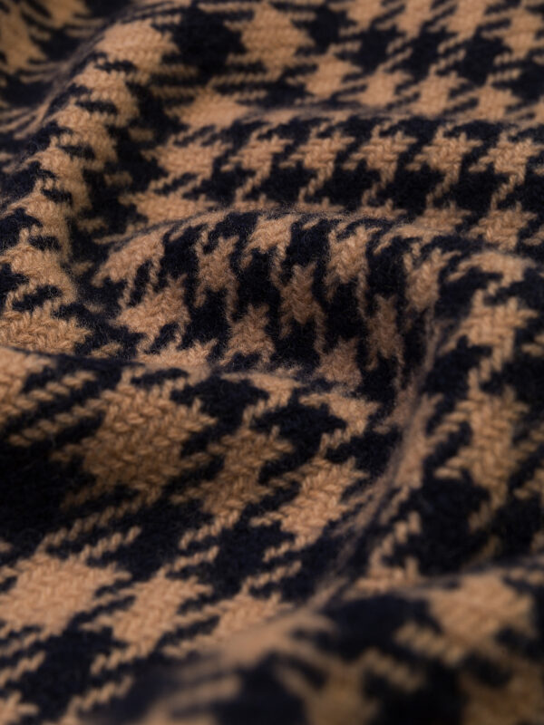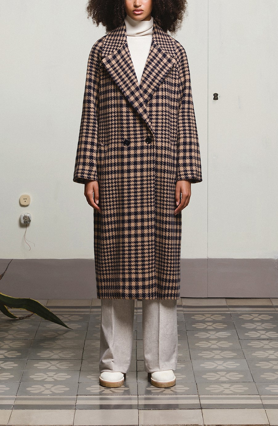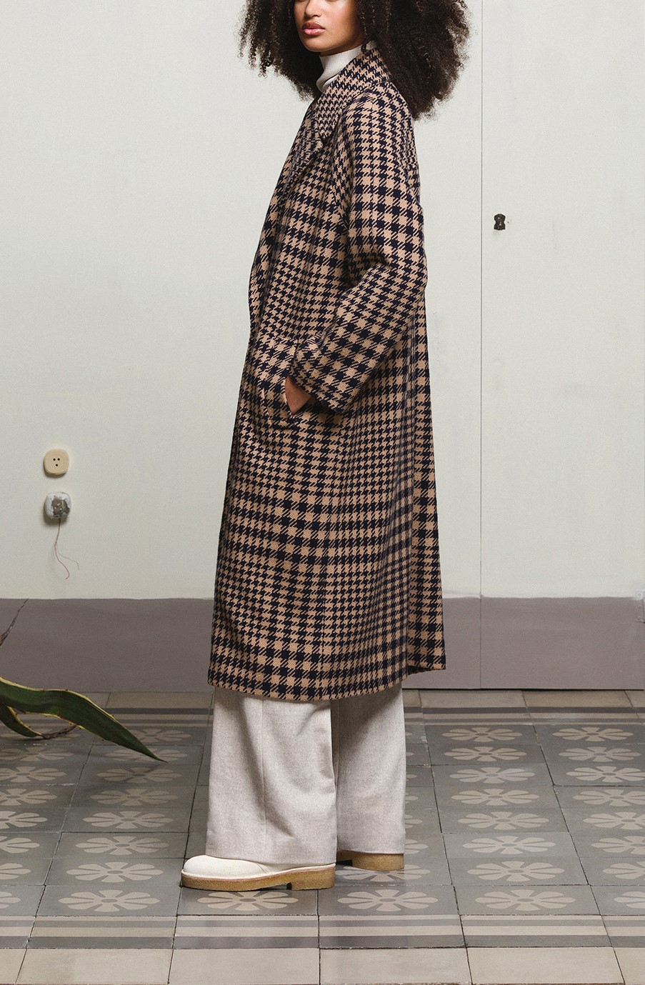 Cappotto raglan in lana vergine macro pied de poule Collo con rever ampio Chiusura doppiopetto due bottoni esterni e uno interno Due tasche a filo Cappotto: lunghezza 114 cm (taglia 40) Materiale: lana vergine Composizione: 100% Lana vergine