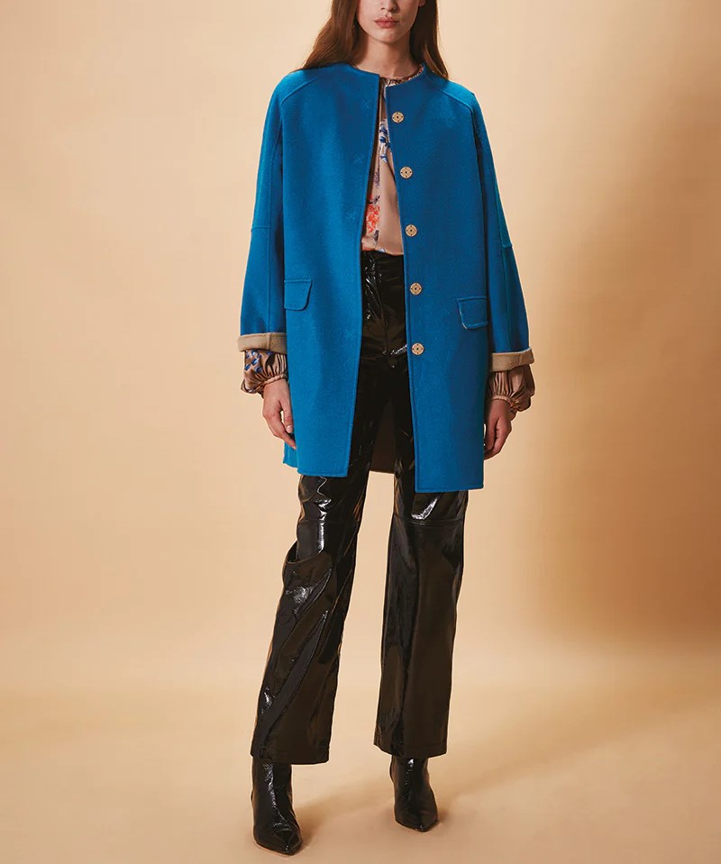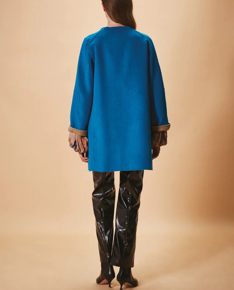 Il Cappotto Victor NENETTE, รจ un cappotto double in misto lana con collo a cratere, cinta per evidenziare il punto vita, chiusura con automatici, tasche sul davanti a pattina.