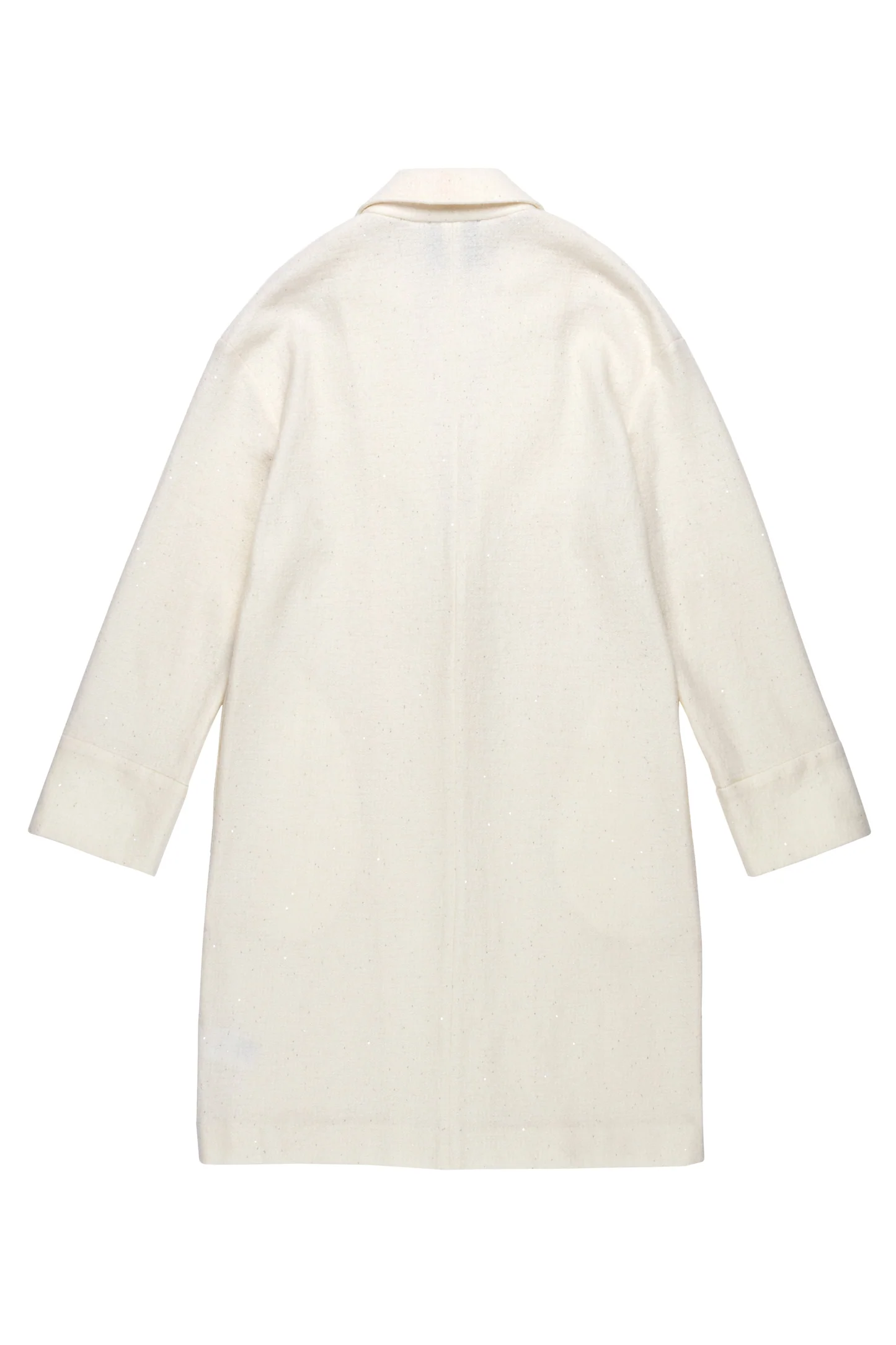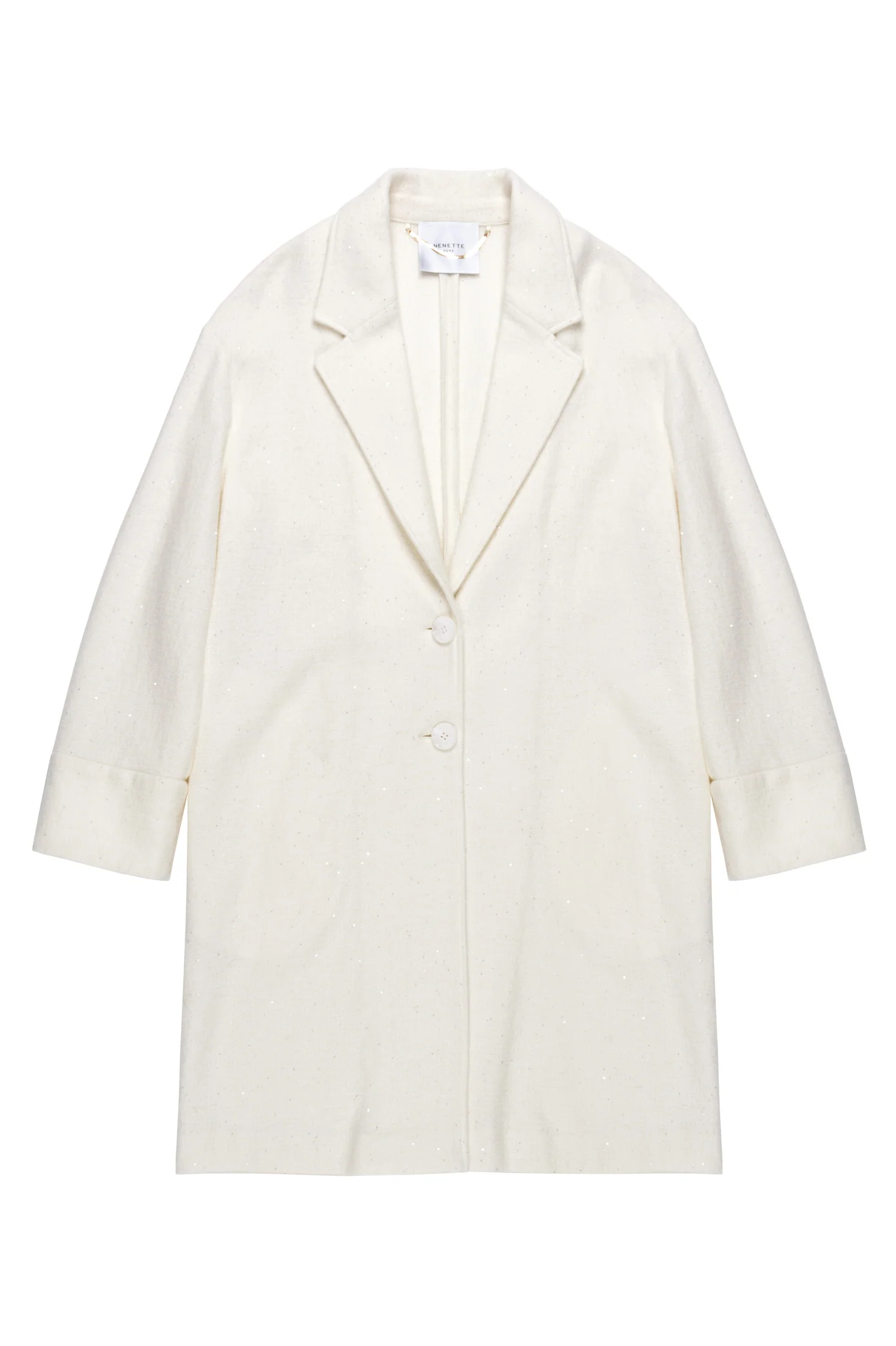 Cappotto Viking Sfoderato in lana cotta Impreziosito da delicate paillettes che donano luce e raffinatezza Revers classico Chiusura a due bottoni Tasche laterali a filo Composizione: 51% Cotone 49% Lana Vergine