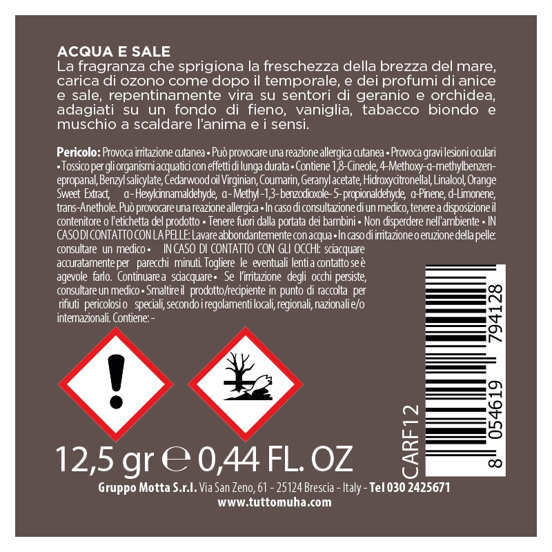 - ACQUA E SALE La fragranza che sprigiona la freschezza della brezza del mare carica di ozono come dopo il temporale e dei profumi di anice e sale, repentinamente vira su sentori di geranio e orchidea adagiati su un fondo di fieno, vaniglia, tabacco biondo e muschio a scaldare lโanima e i sensi.