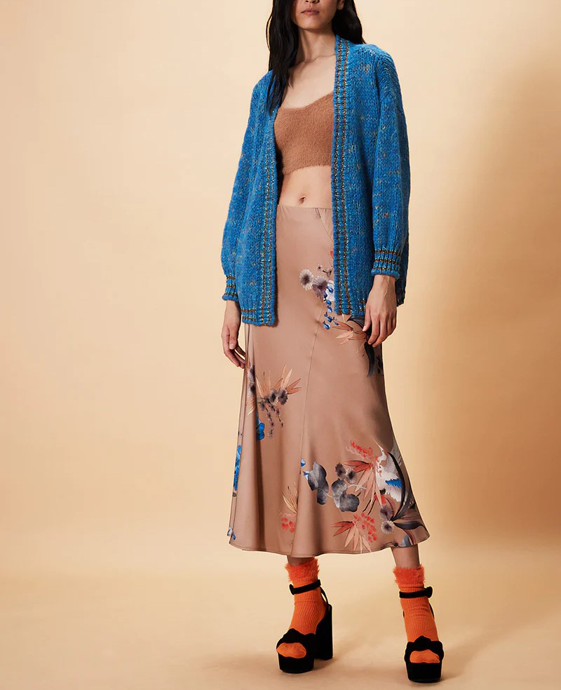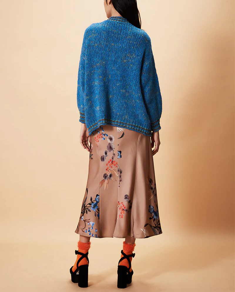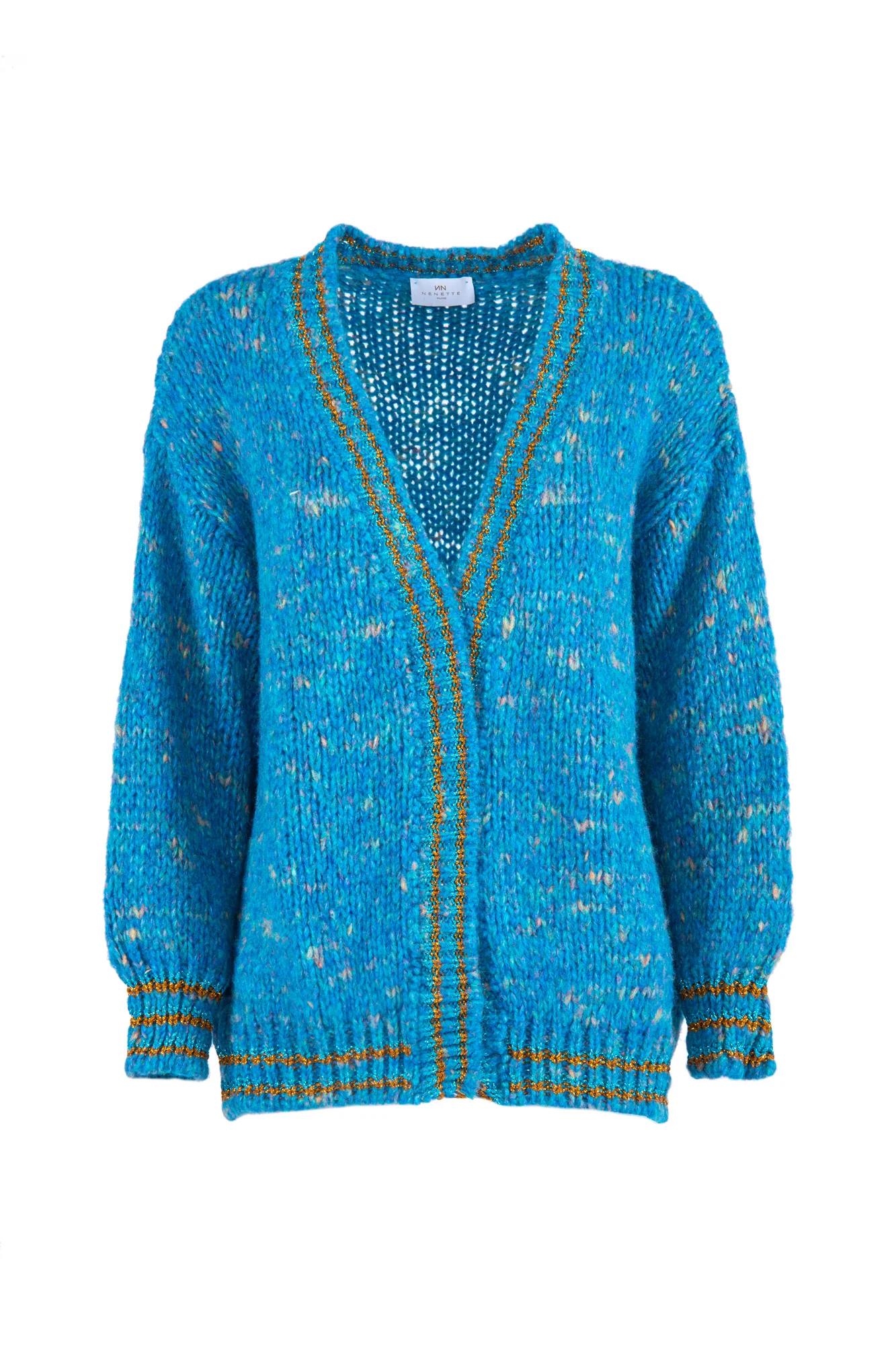 Il Cardigan Chiara NENETTE, รจ un cardigan in misto lana e alpaca, senza bottoni con bordi lurex. Ideale come soprabito.