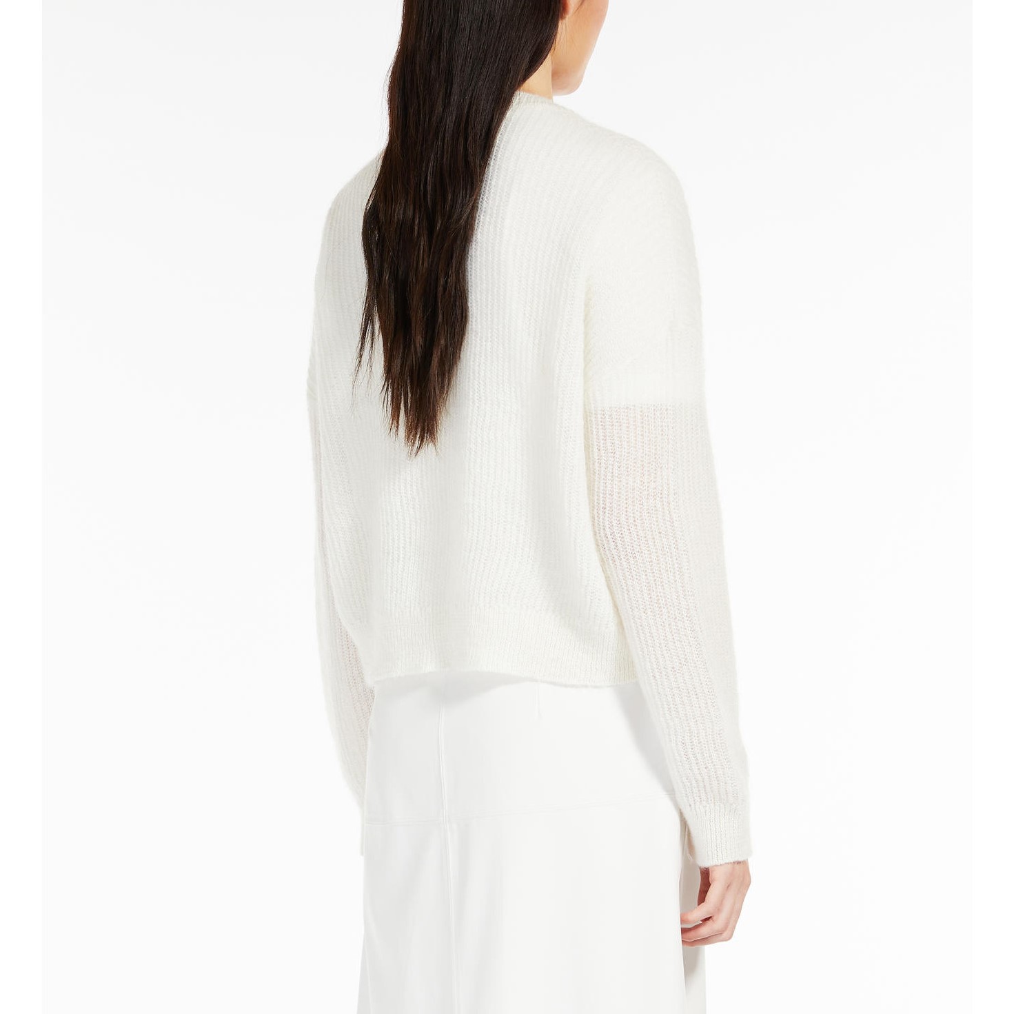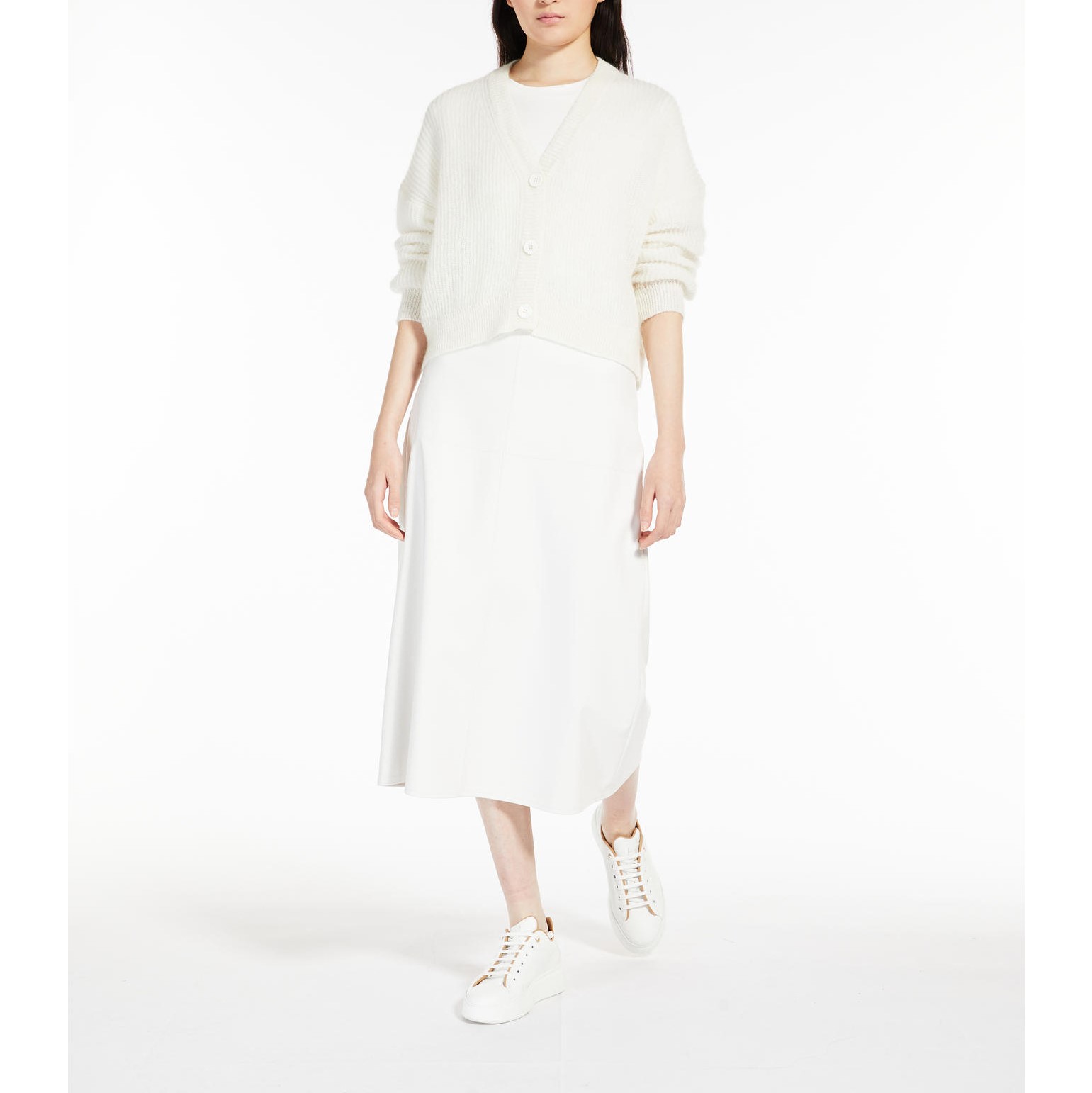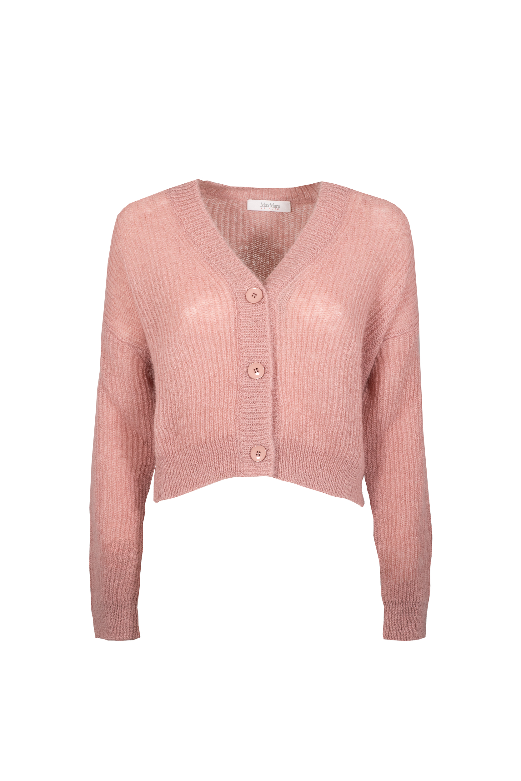 Il Cardigan scollo “V” MAX MARA Leisure, รจ un cardigan con scollo a V in filato di misto mohair, lavorato a costa inglese, con maniche lunghe a giro basso dalla caratteristica forma a “balloon”. La chiusura con bottoni in tinta e il bordo sono rifiniti con una lavorazione a costine. Lunghezza 58 cm.