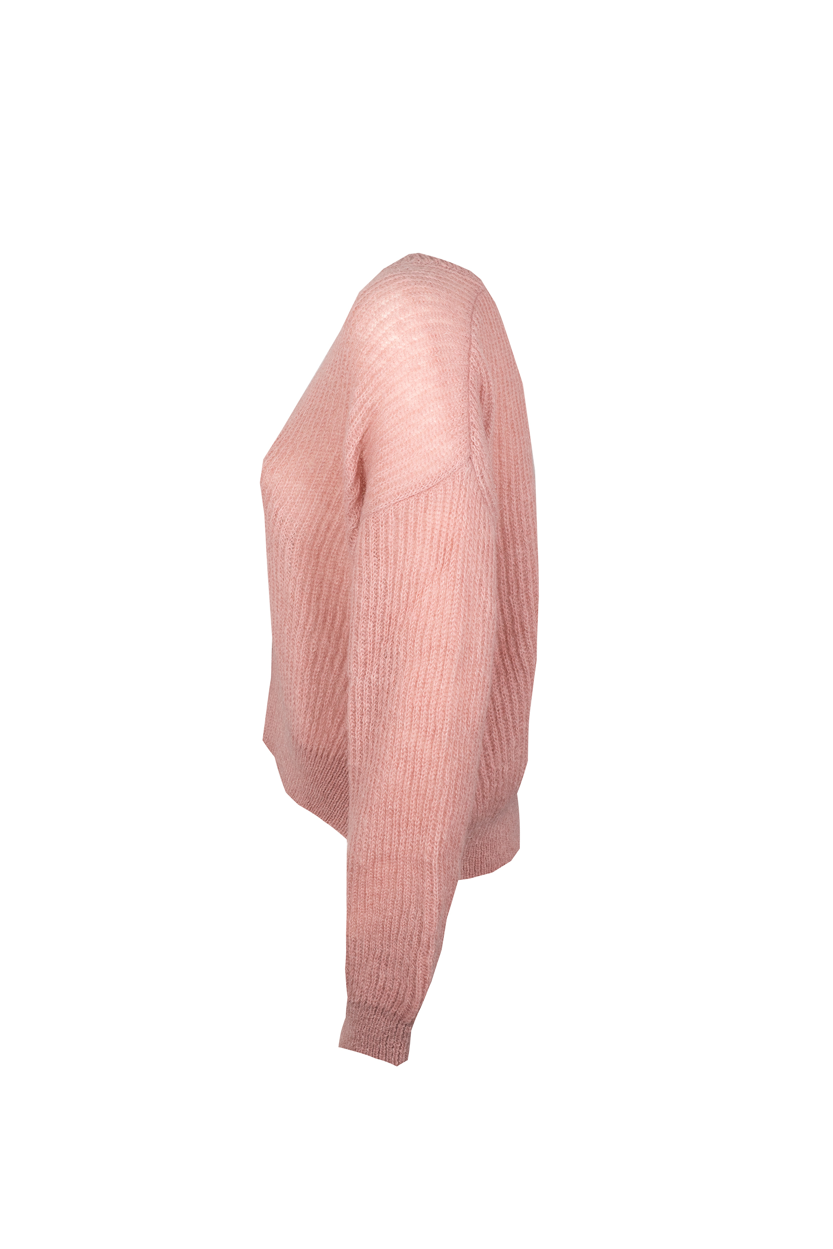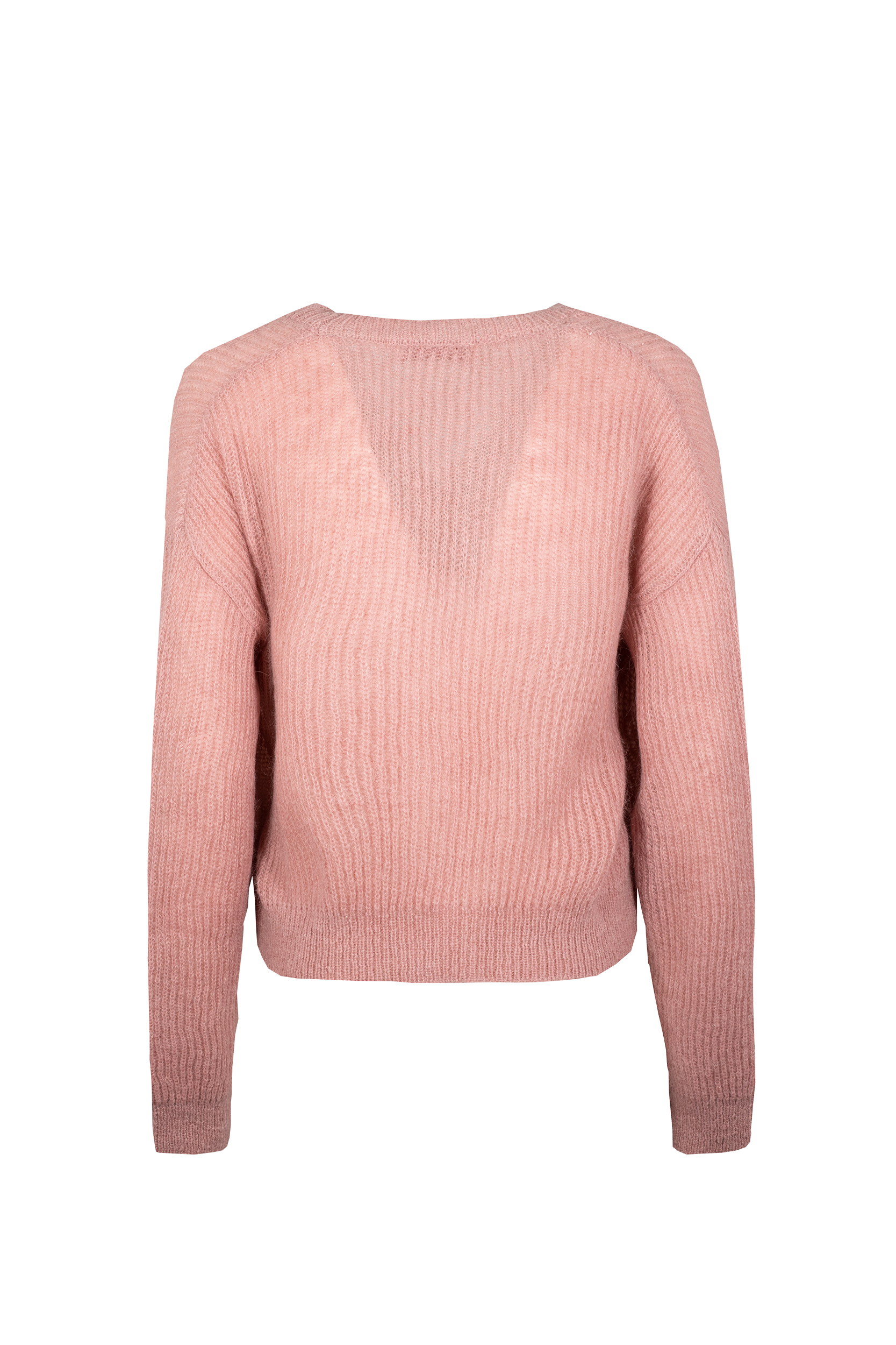 Cardigan con scollo a V Filato di misto mohair Lavorato a costa inglese Maniche lunghe a giro basso dalla caratteristica forma a “balloon” La chiusura con bottoni in tinta e il bordo sono rifiniti con una lavorazione a costine Lunghezza 58 cm Composizione: 48% Mohair, 47% Poliammide, 5% Lana