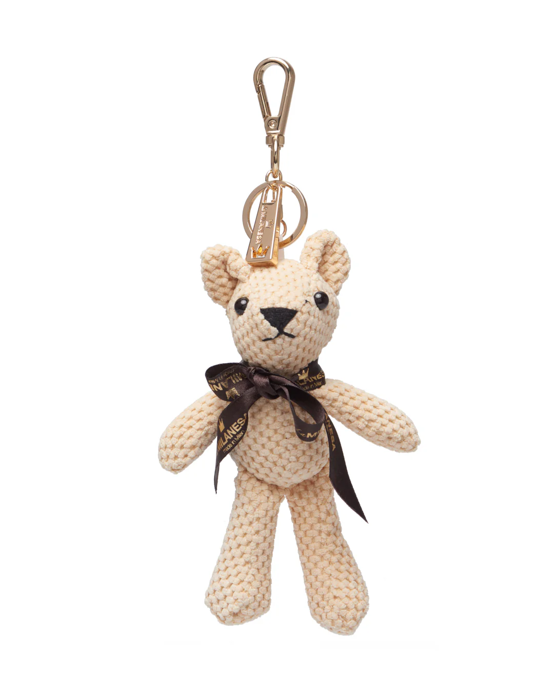 Charm Teddy Beige Portachiavi a forma di orsetto realizzato in velluto beige Occhi e il naso del charm sono realizzati con dettagli delicati Rifinito con un fiocco in raso Arricchito da anello e moschettone dorato con charm logato. Made in Italy