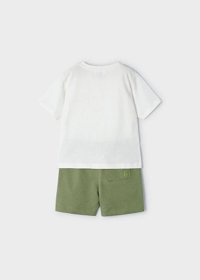Completo 2 pezzi bimbo con t-shirt bianca e stampa, con pantaloncino comodo verde tinta unita.