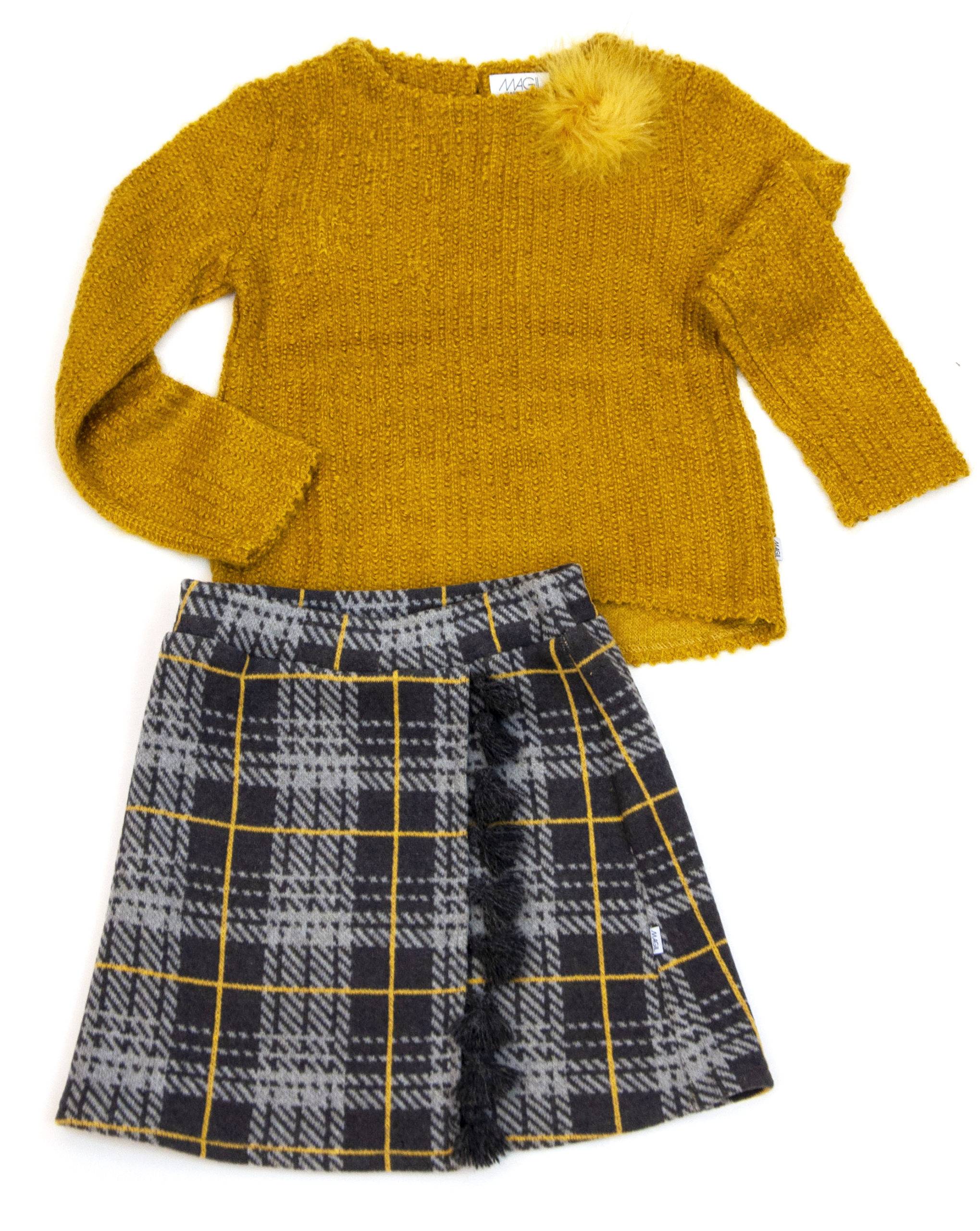 Maglia girocollo senape con applicazione di piuma e chiusura sul retro con bottone. Gonna kilt colore grigio e senape principe di galles con nappine ed elastico in vita.
