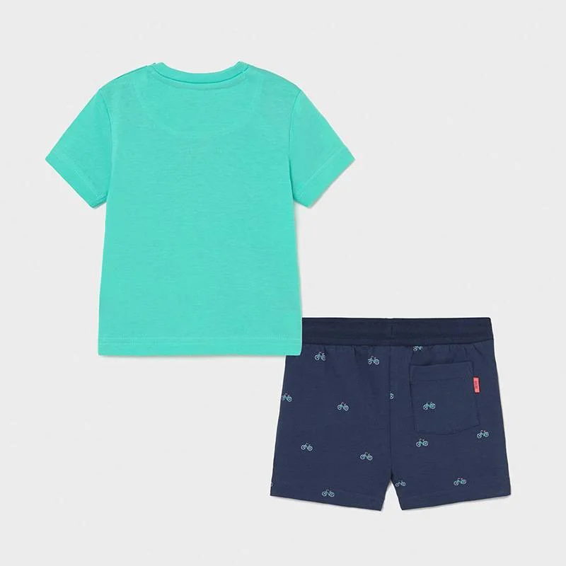 Completo neonato realizzato in morbido cotone, composto da una t-shirt verde manica corta con stampa frontale e un bottone a pressione sulla spalla, e un pantalone corto blu con elastico in vita e laccetto regolabile.