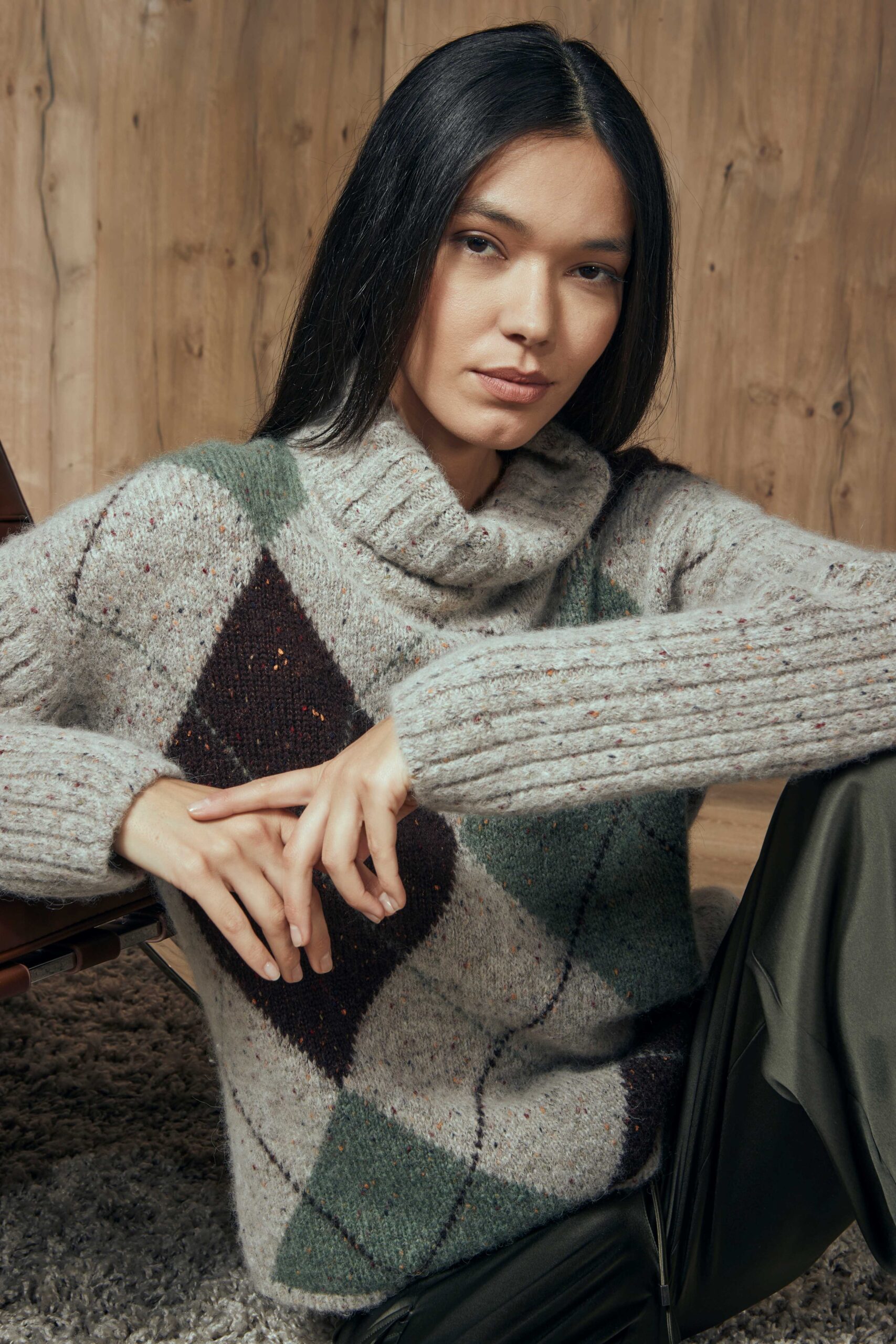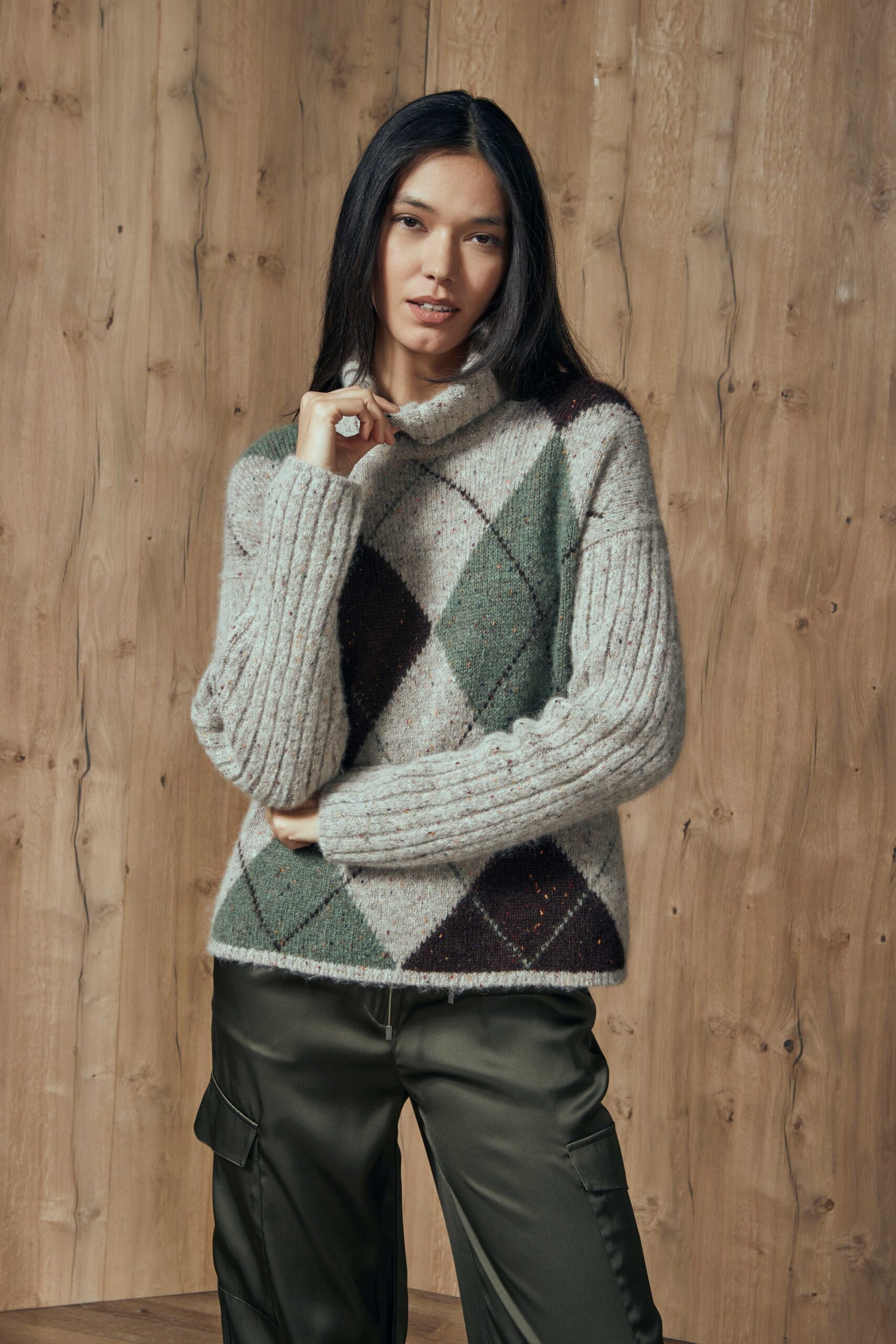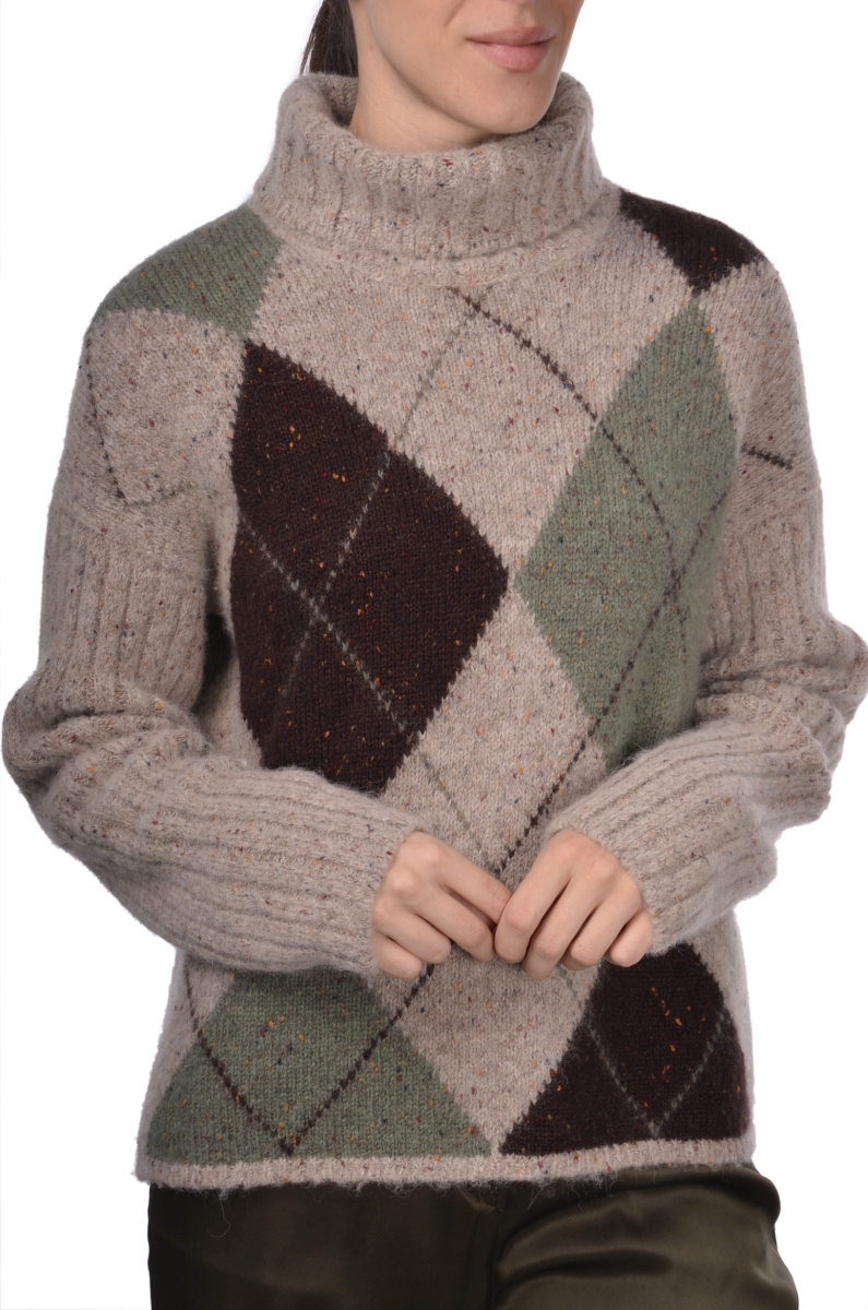 Il Dolcevita a rombi GRAN SASSO, รจ una maglia dolcevita con spalla scesa in alpaca e lana effetto bottonato con lavorazione ad intarsio e fantasia a rombi in contrasto colore. Il collo e le maniche sono a coste. Un classico del guardaroba invernale femminile, perfetto per comporre ogni outfit desiderato, dal casual con jeans al raffinato da ufficio.