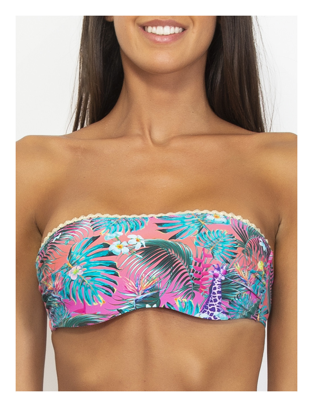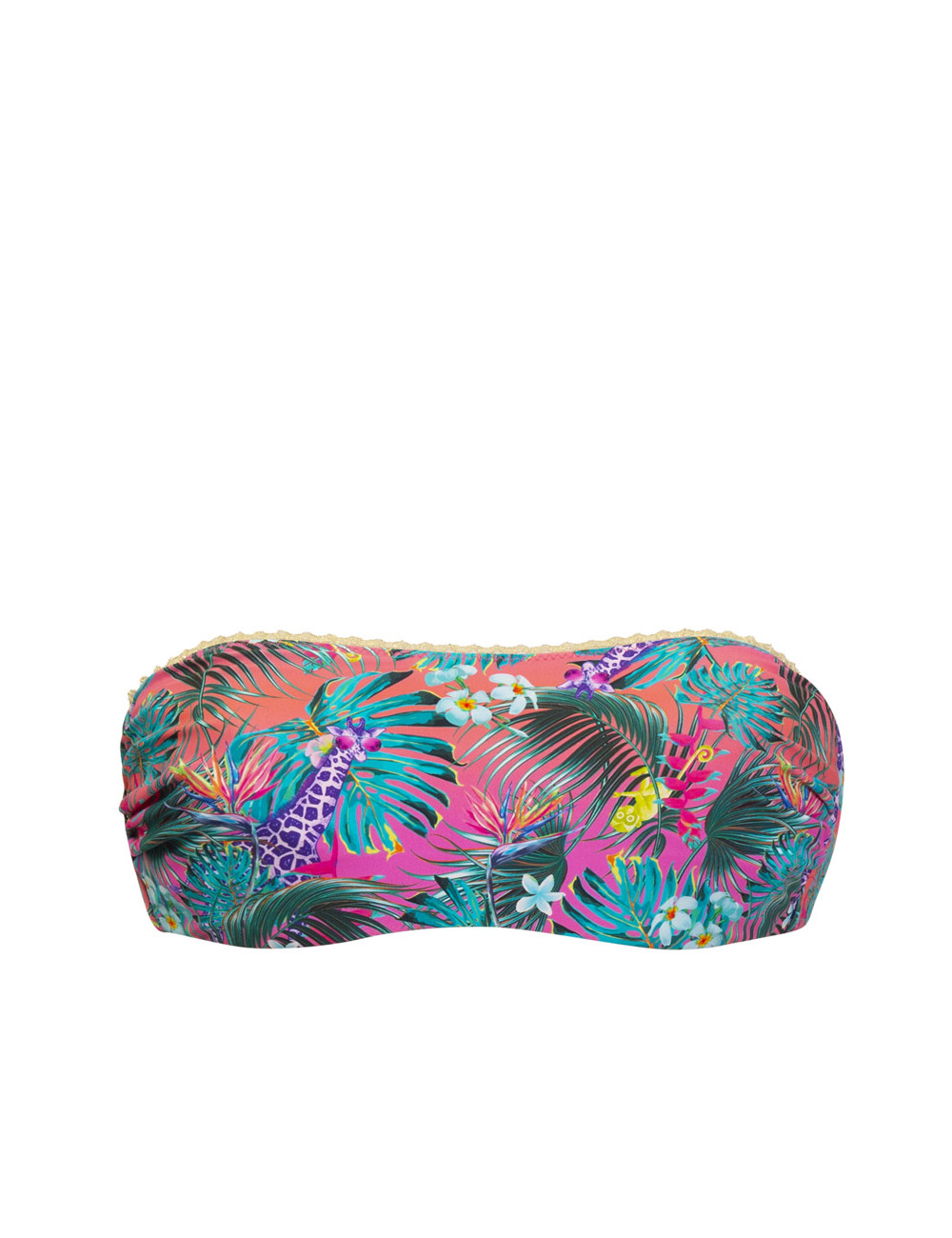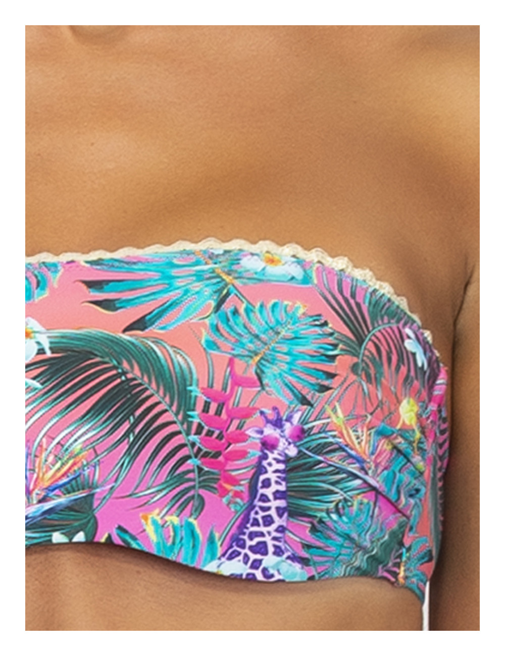 La Fascia new jungle VERDISSIMA, รจ un bikini topย a fascia dal taglio dritto con ferretto invisibile. La stampa jungle รจ reinterpretata in chiave fantasy tingendosi di colori psichedelici e disegni originali. Simpatiche scimmiette colorate e giraffe con occhiali da sole super cool si nascondono dietro foglie e fiori su fondo rosa e azzurro. Fascia arricchita da sottile passamaneria in lurex con motivo a onda che dona un tocco di luce. Dotata di balenette laterali che aiutano a sostenere e spallina removibile.