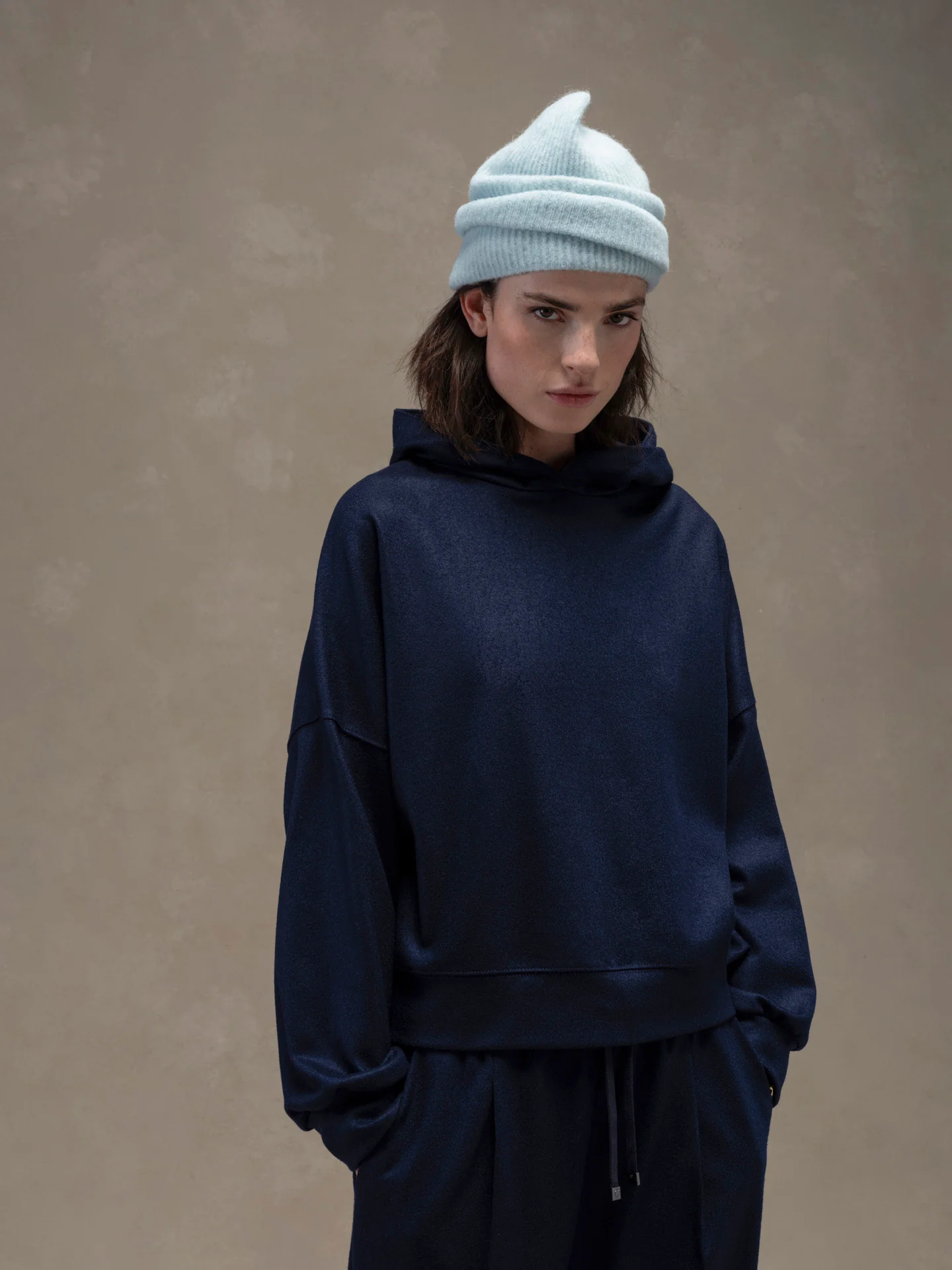 La Felpa cappuccio CIRCOLO 1901, รจ una felpa in lana con cappuccio con balza e polsini elasticizzati.