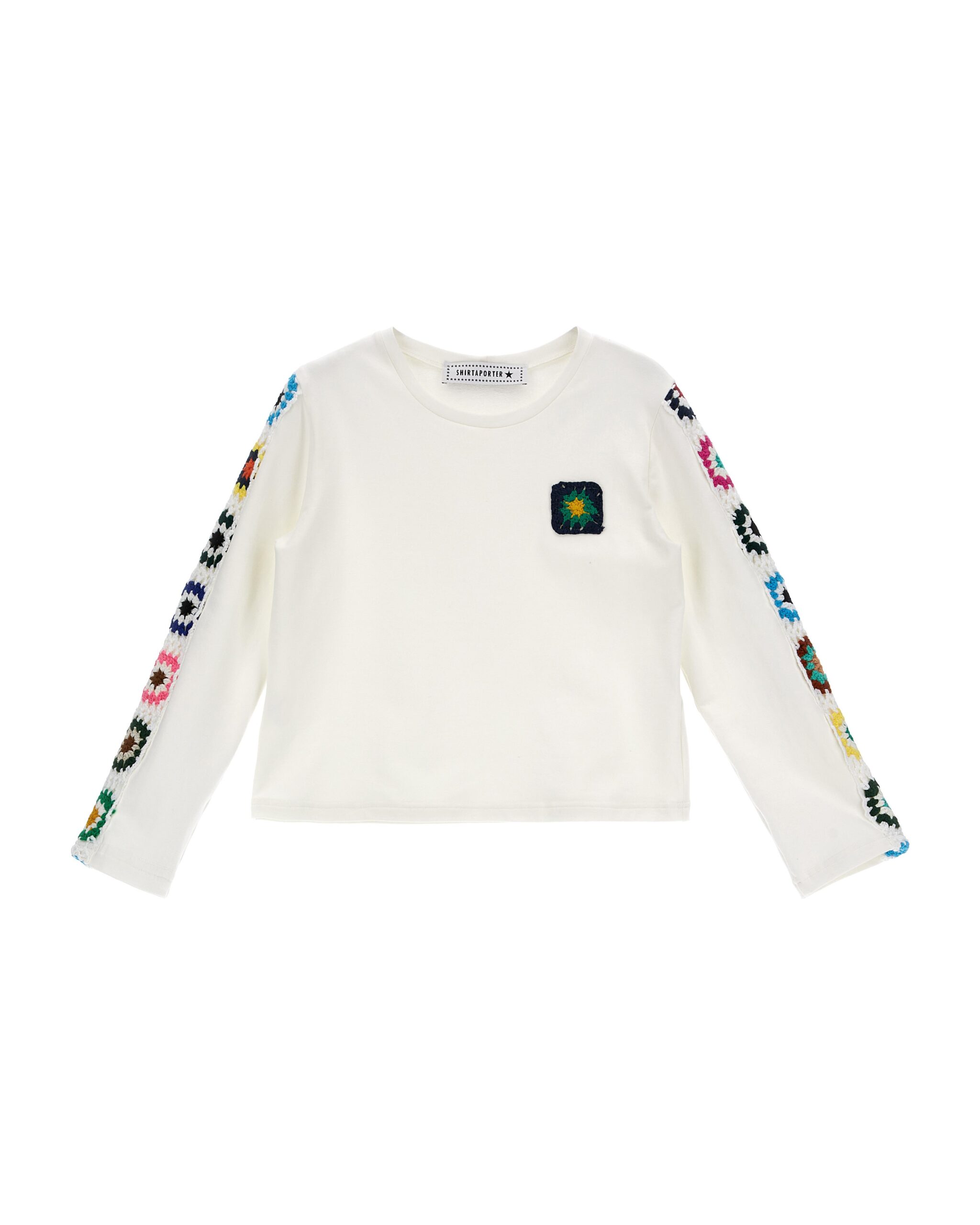 La felpa crochet SHIRTAPORTER, รจ una felpa a girocollo con crochet sul petto e sulle maniche