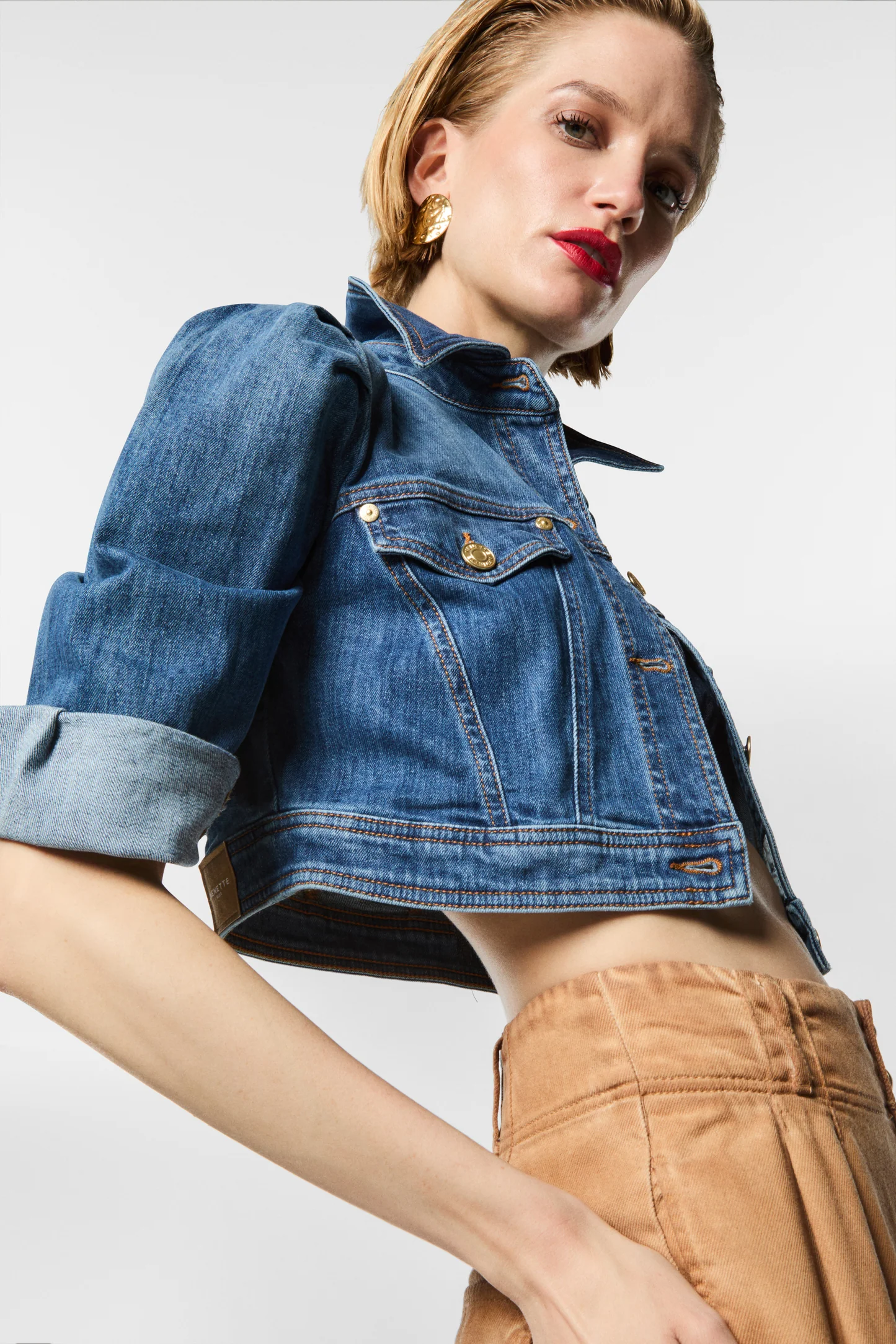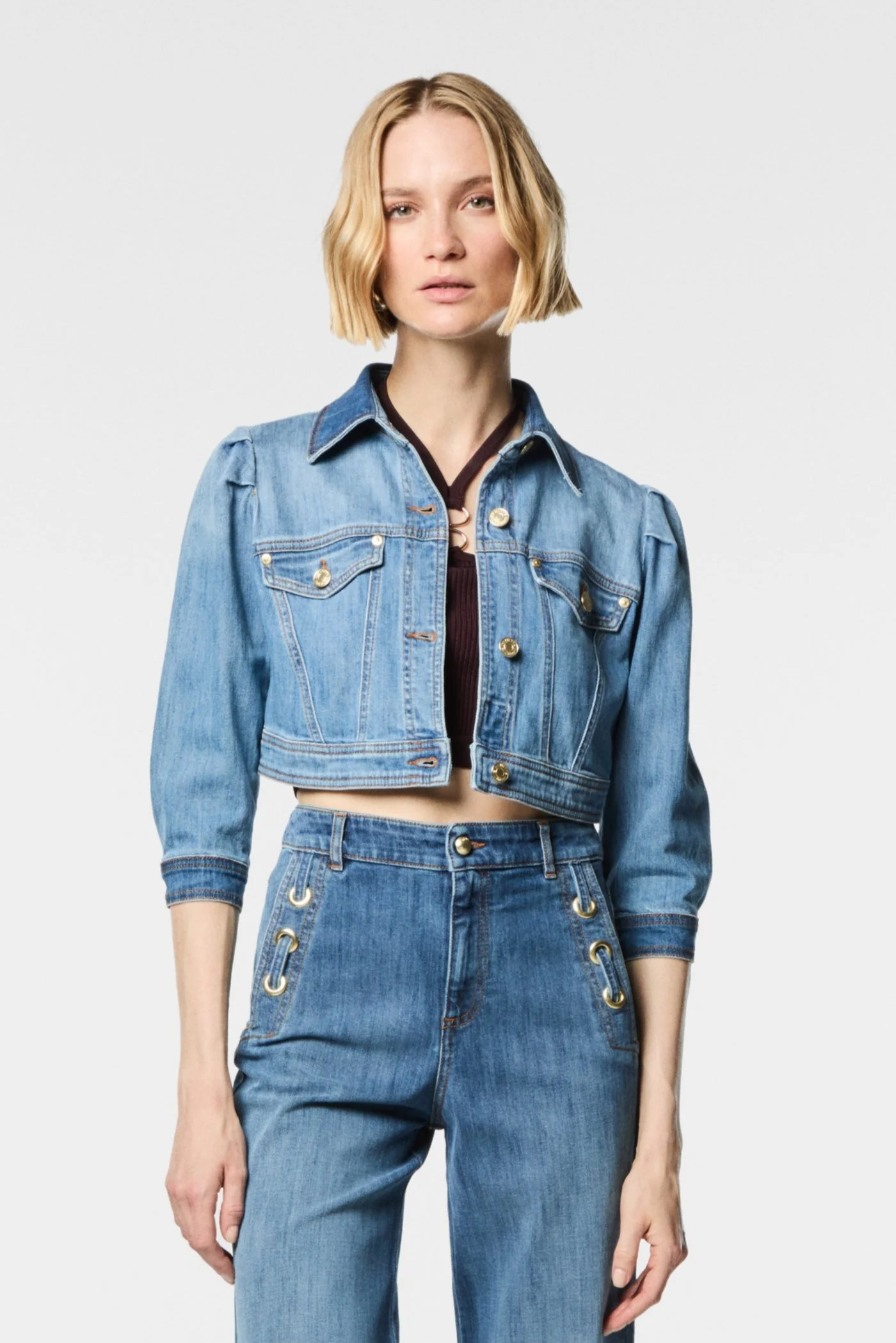Giacca cropped in denim comfort Lunghezza corta Tessuto elasticizzato garantiscono una vestibilitร perfetta e grande libertร di movimento Ideale per completare look quotidiani con un tocco moderno e dinamico Composizione: 98% Cotone 2% Elastan