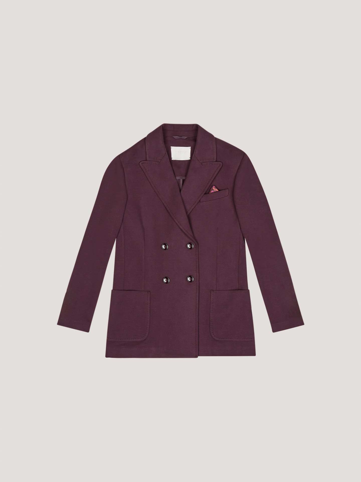 La Giacca doppiopetto CIRCOLO 1901, รจ una giacca doppiopetto in tinto light. Rever a lancia, quattro bottoni, bottone interno, polsini con bottoni, due tasche a toppa ed una a filo.