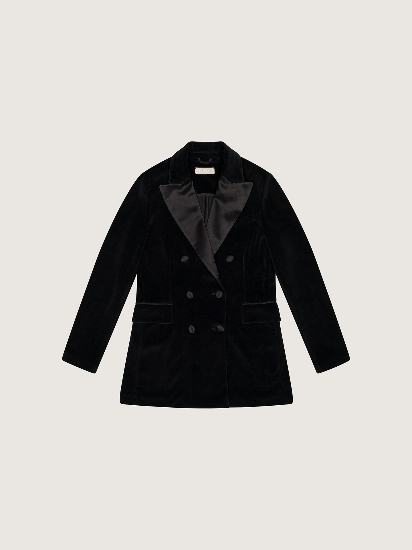 Giacca doppiopetto smoking in velluto liscio Rever a lancia rifinito in raso Chiusura a sei bottoni in raso Polsini con bottoni in raso Due tasche a patta e una a filo Completo con il pantalone masculine FD 2816 Composizione: 80% Cotone 20% Poliestere