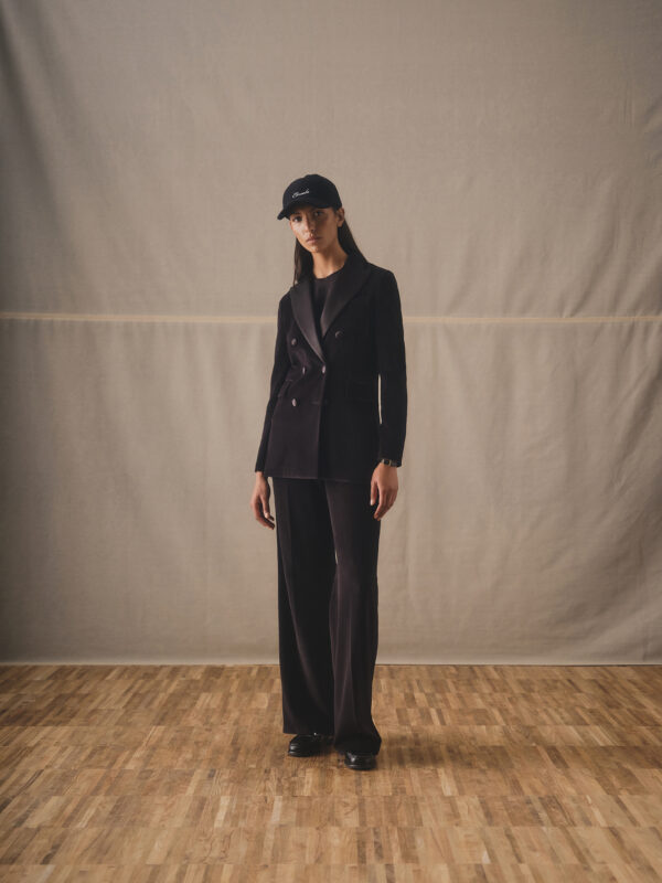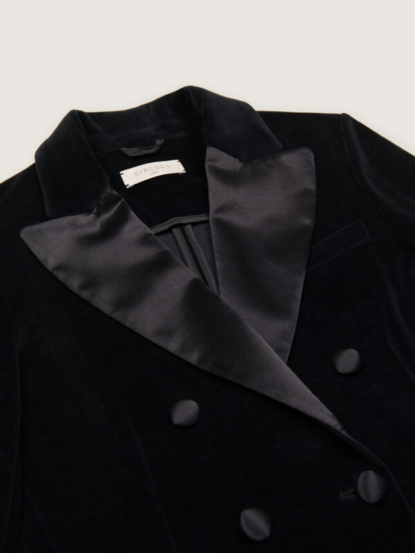 La Giacca doppiopetto smoking CIRCOLO 1901, รจ una giacca doppiopetto in velluto liscio. Rever a lancia rifinite in raso, chiusura a sei bottoni in raso, polsini con bottoni, due tasche a patta e una a filo. Completo con il pantalone masculine FD 2816.