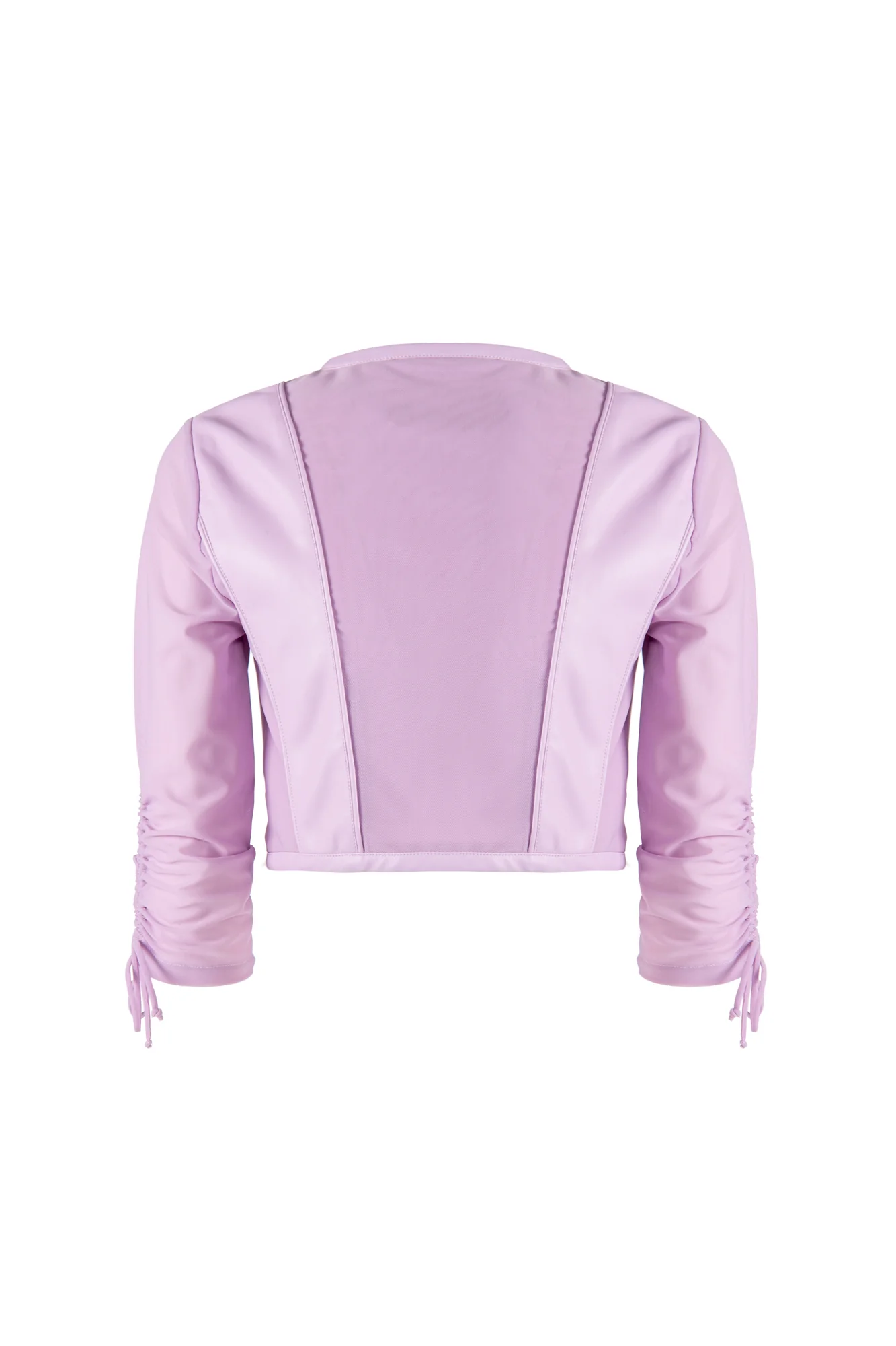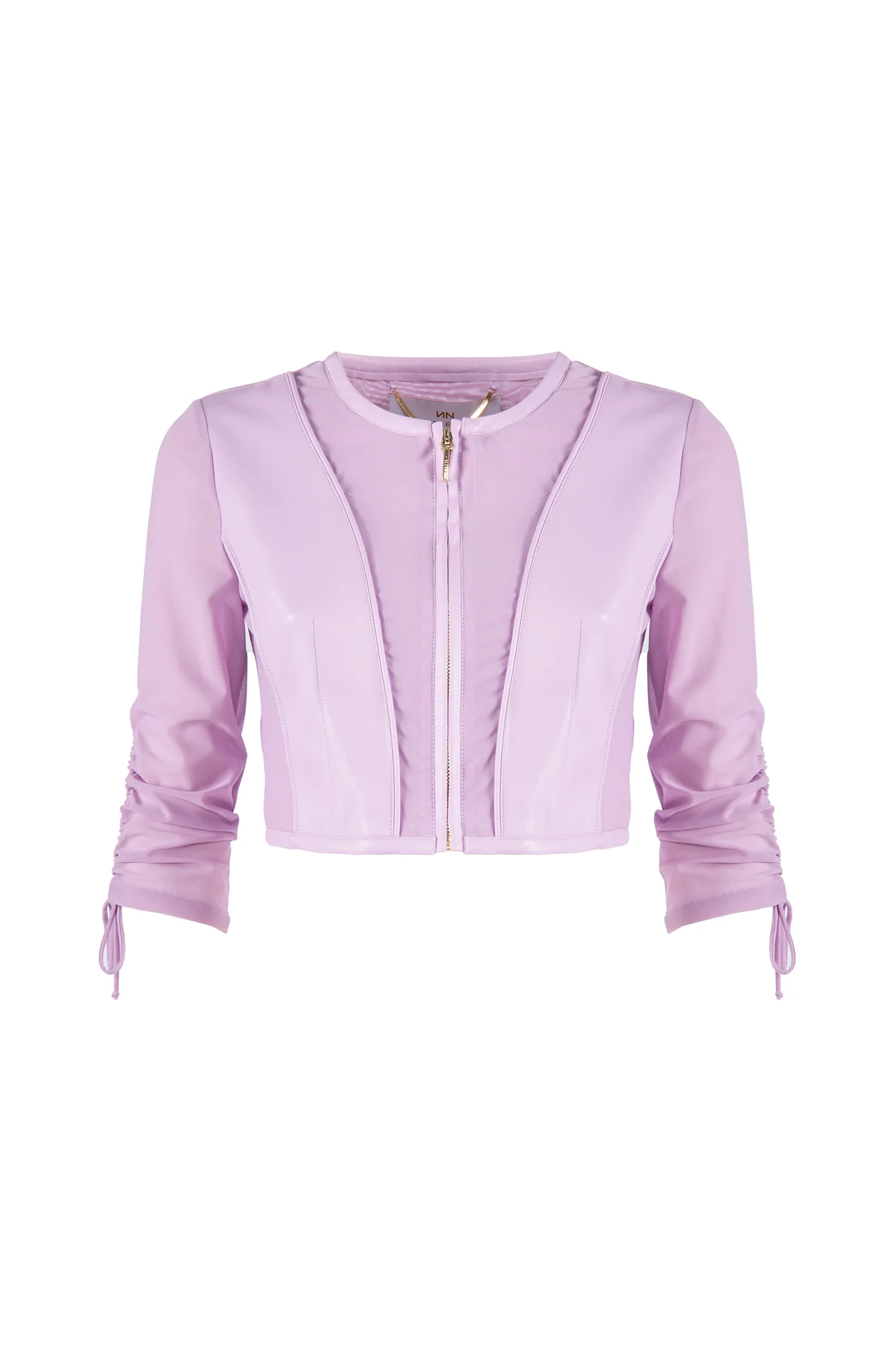 La Giacca ecopelle Nelly NENETTE, รจ una giacca corta in ecopelle con inserti di tessuto trasparente, zip centrale come chiusura e coulisse alle maniche per regolarne la lunghezza.