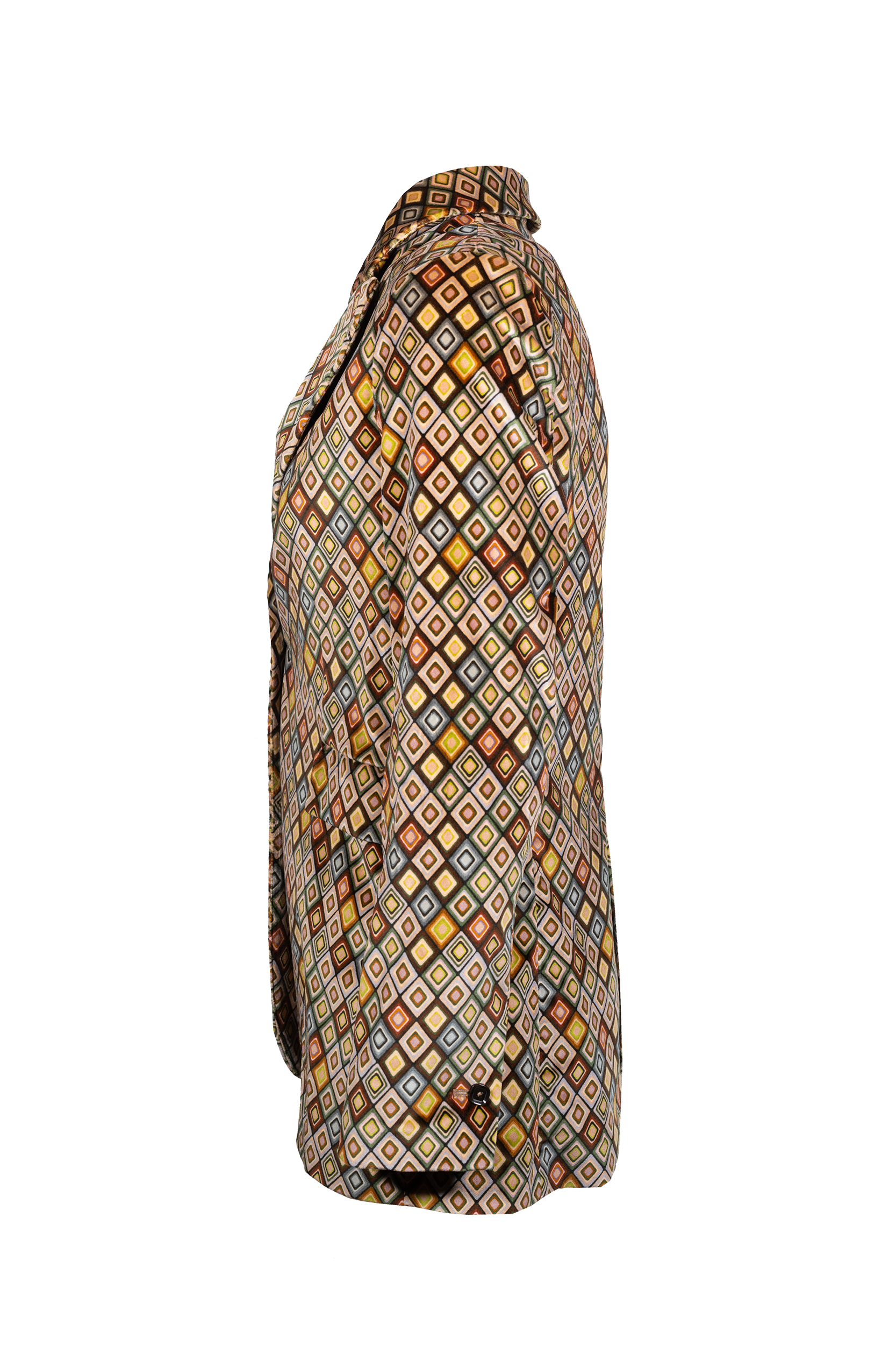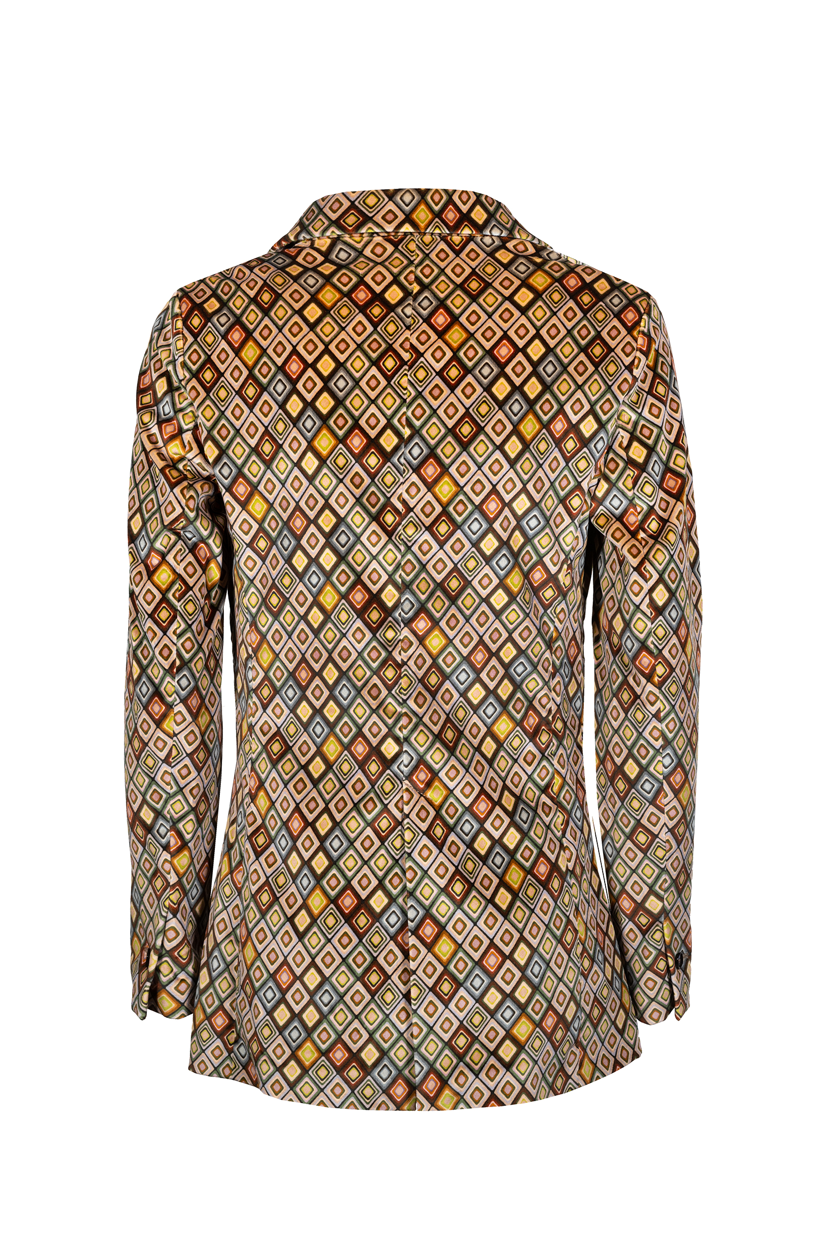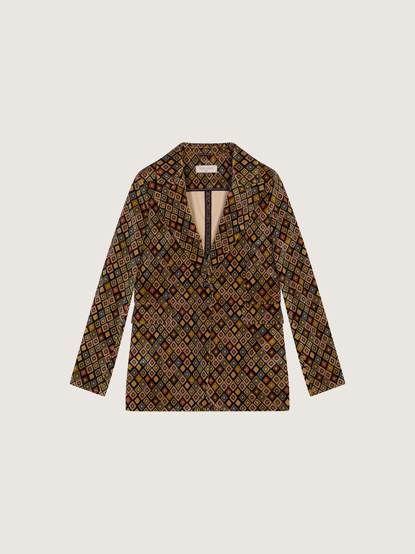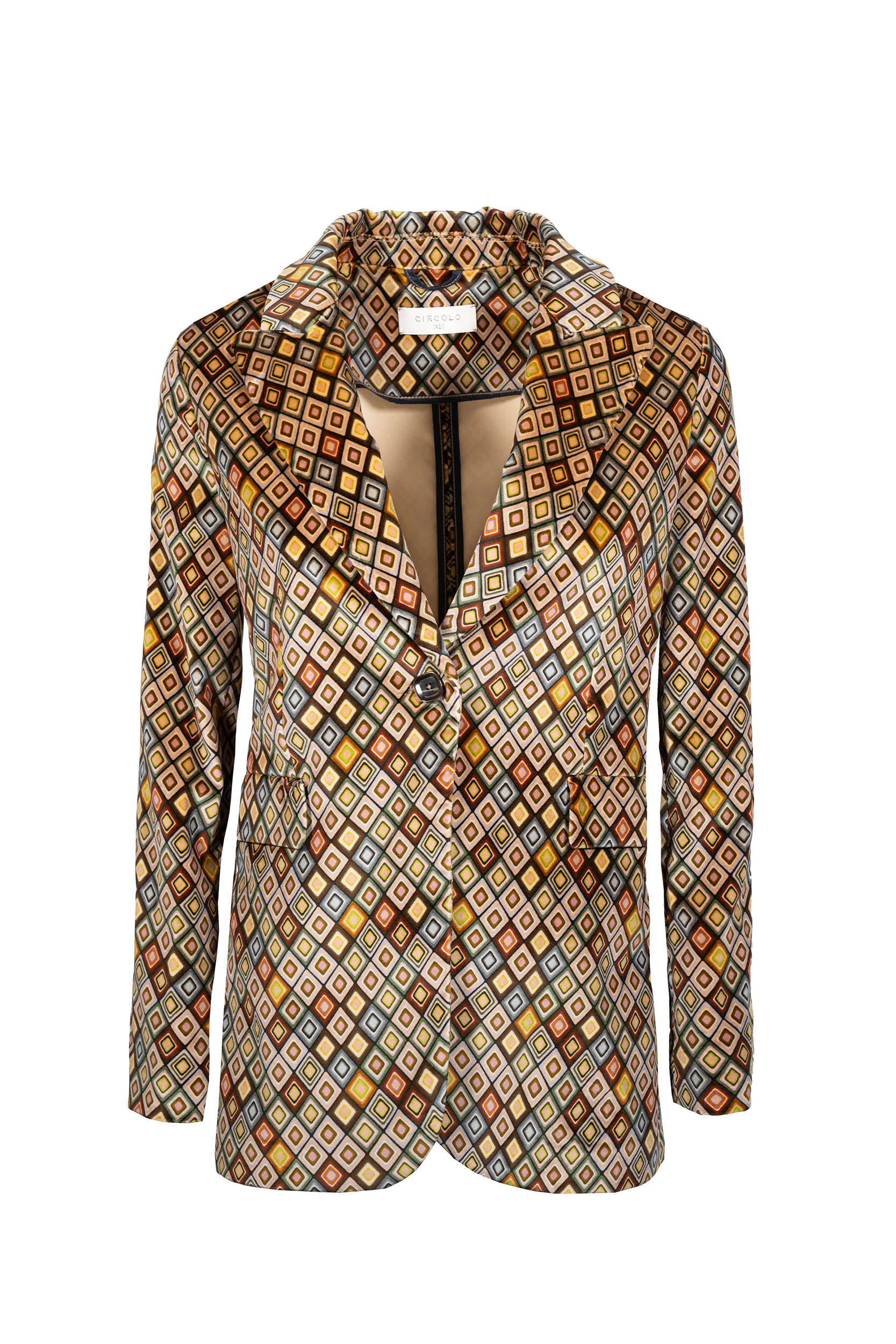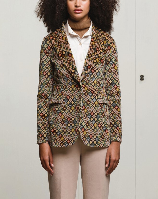 La giacca slim long vintage diamonds CIRCOLO 1901, รจ una giacca in velluto fantasia. Revers a lancia, chiusura un bottone, polsini con bottoni due tasche a patta.