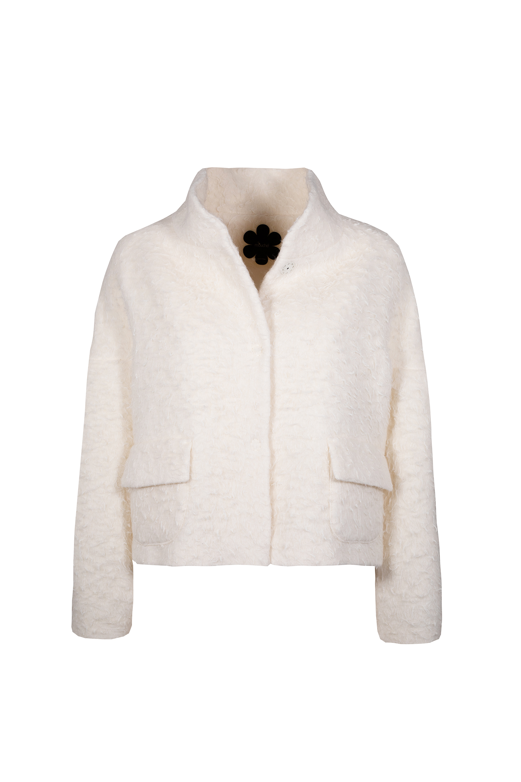 Il Giaccone lana effetto infeltrito MOUCHE, รจ una giaccone in alpaca e lana vergine, corta, con collo alto, chiusura anteriore con bottoni a pressione coperti, due tasche con patta, spalla scesa, fodera, vestibilitร over.
