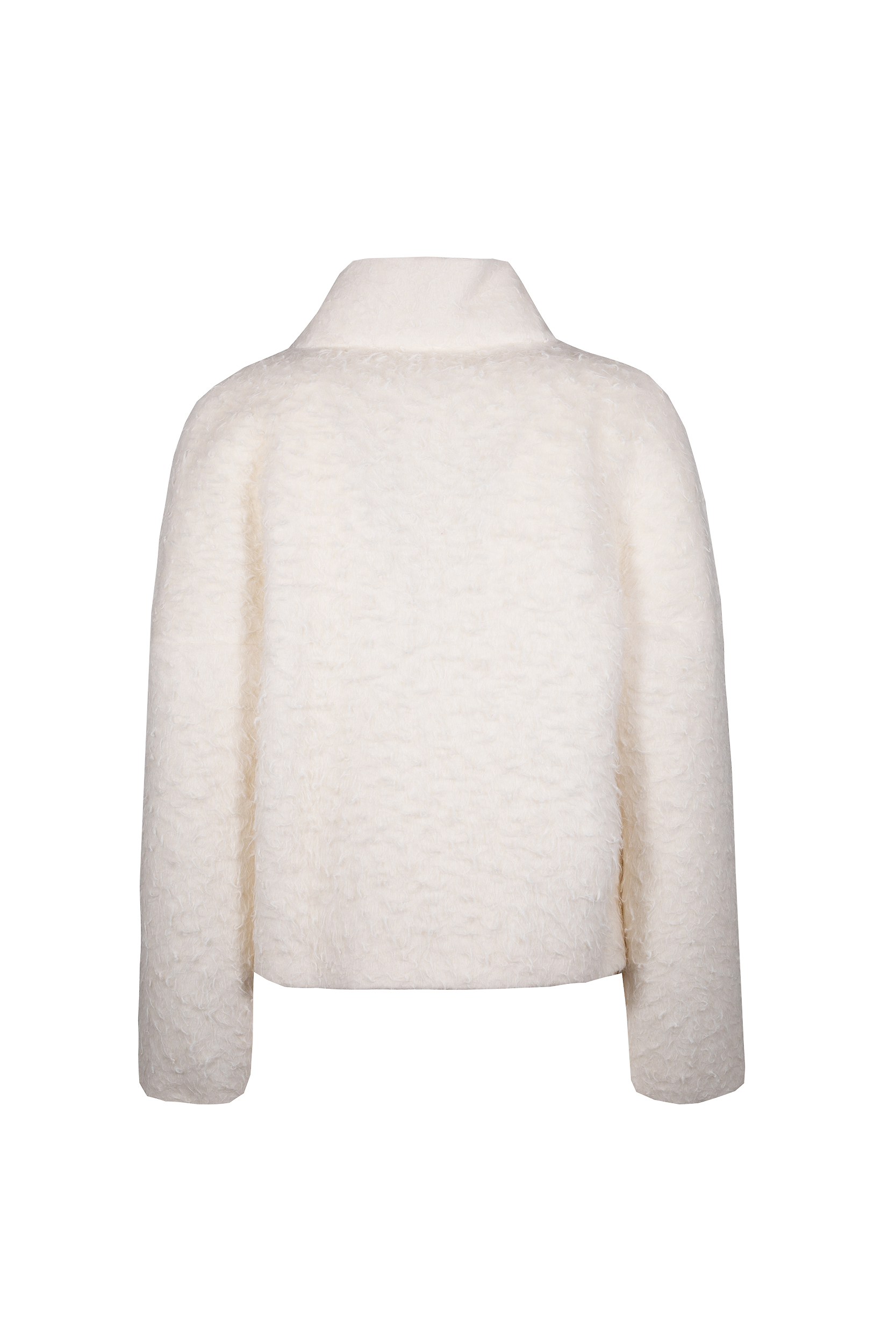 Giaccone corto in alpaca e lana vergine effetto infeltrito Collo alto Chiusura anteriore con bottoni a pressione coperti Due tasche con patta Spalla scesa Fodera Vestibilitร over Composizione: 62% Alpaca 38% Lana Vergine Made in Italy