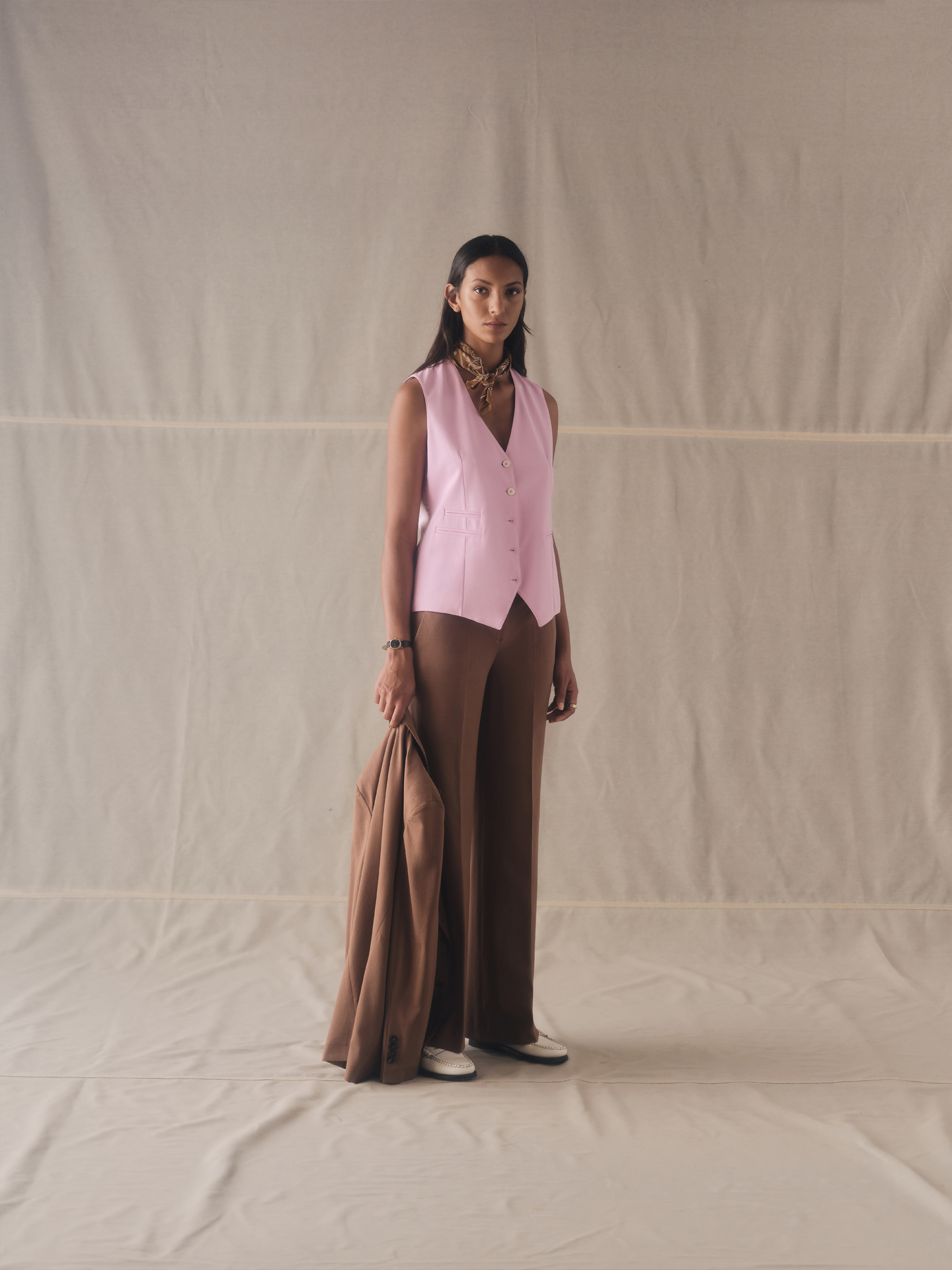 Il Gilet CIRCOLO 1901, รจ un gilet in piquet filo di Scozia tinto light. Collo a v, chiusura a cinque bottoni, tre tasche a filo. Completo con il pantalone FD3014 e la giacca FD 3015.