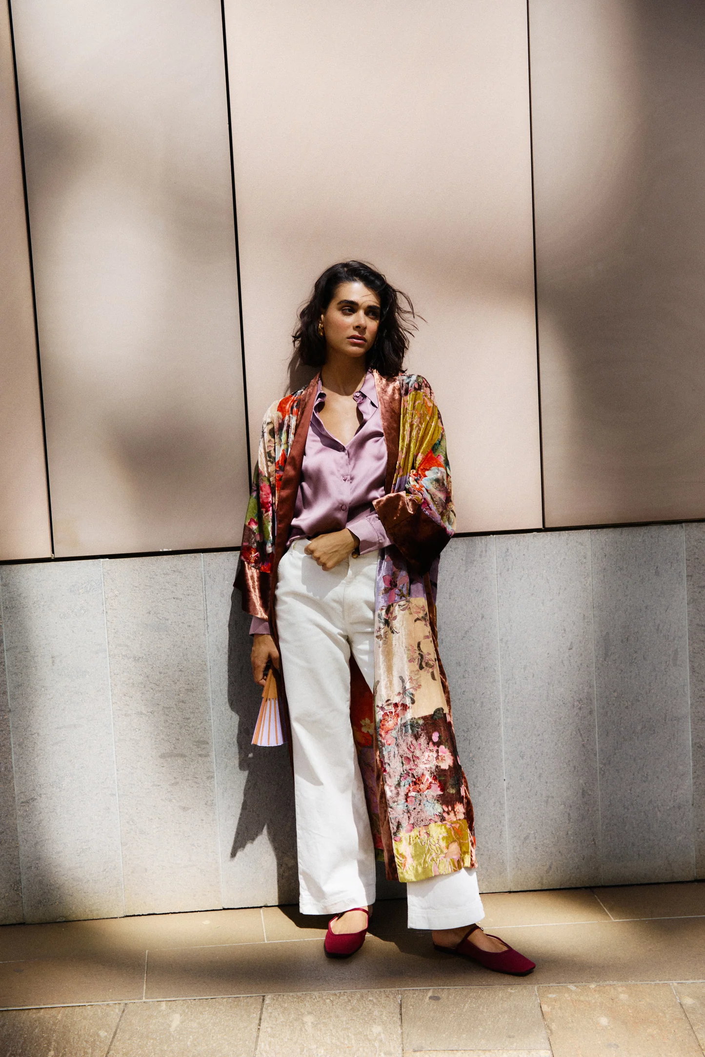 Giacca Kimono Vappone Giacca kimono lunga in velluto stampato devorรฉ Tessuto ricco di texture e dettagli esclusivi Completo con il pantalone Eki Composizione: 70% Viscosa 30% Poliammide