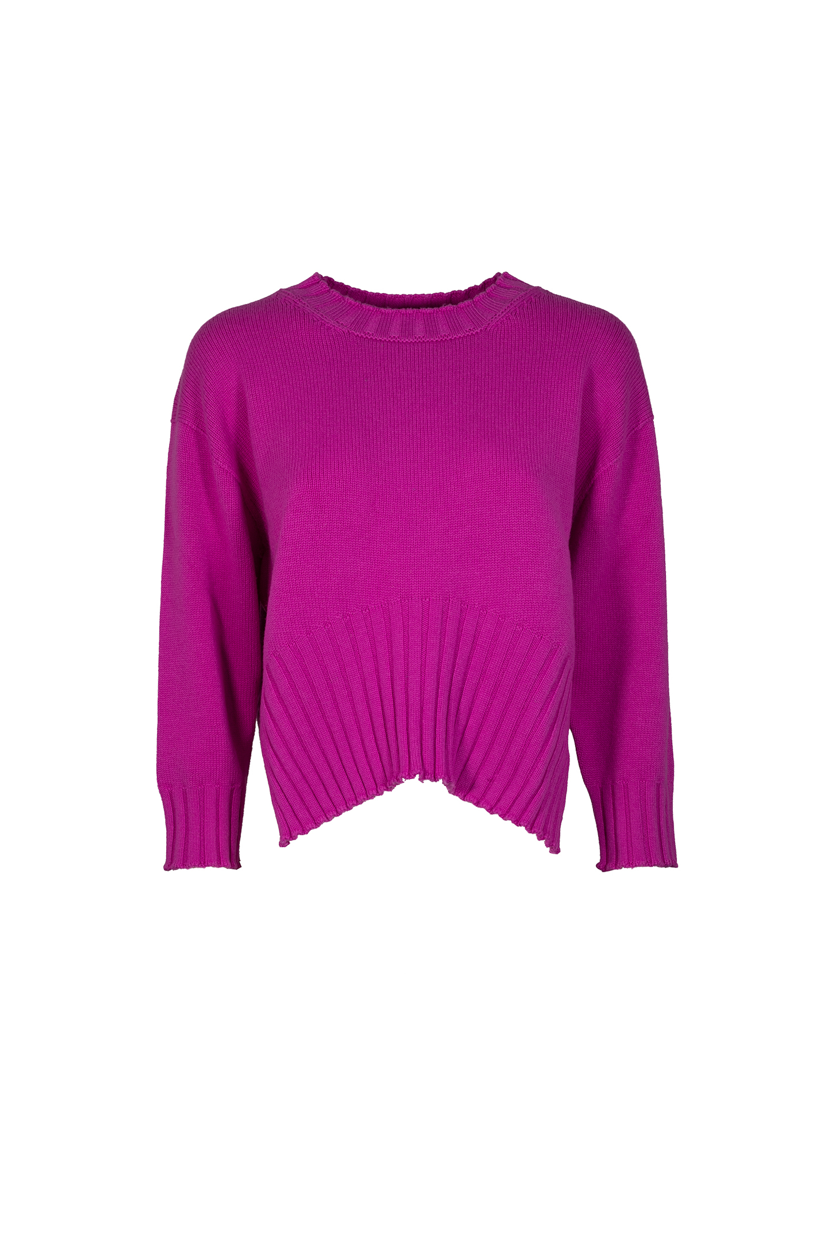 Maglia in cashmere riciclato Girocollo Maniche lunghe Spacchetti laterali Logo cucito in basso a sinistra Collo, polsini e fondo bordati a coste Lunghezza crop Composizione: 50% KASHMIR 50% POLIAMMIDE Made in Italy