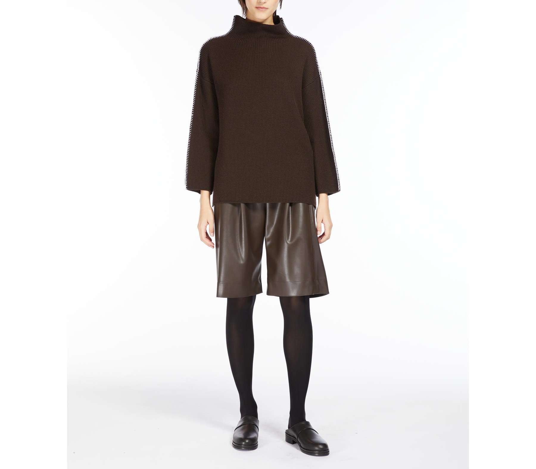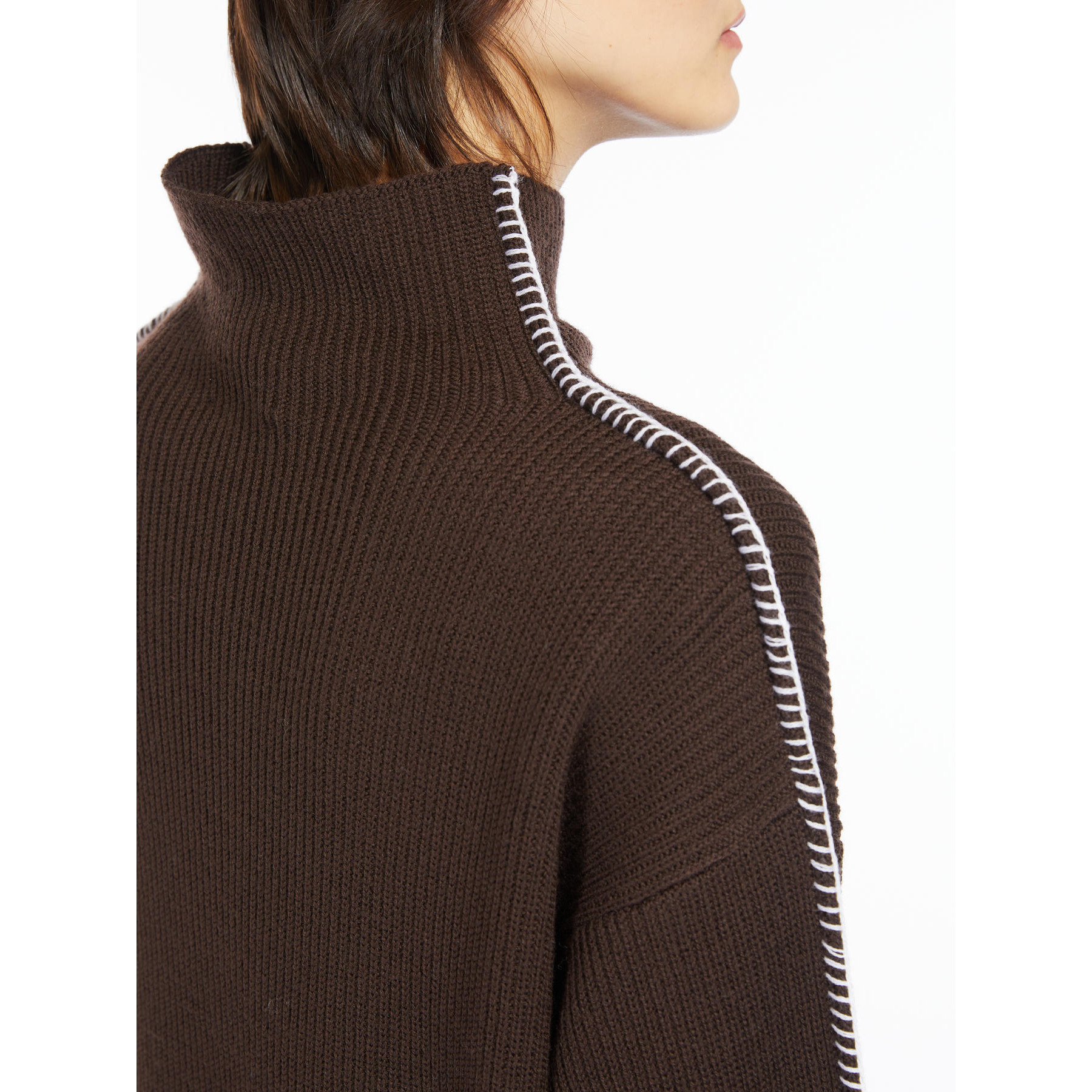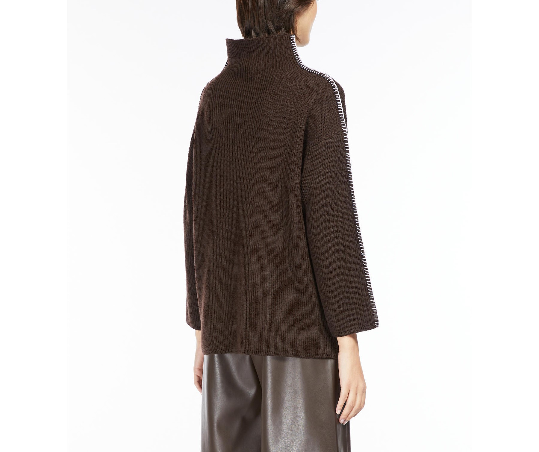 Maglia in pregiato filato di pura lana Silhouette boxy Collo a cratere Maniche lunghe a giro basso Piccoli spacchi laterali al fondo Lavorazione a coste inglesi Rifinita con dettagli di ricami a contrasto che impreziosiscono il capo Composizione: 100% Lana vergine