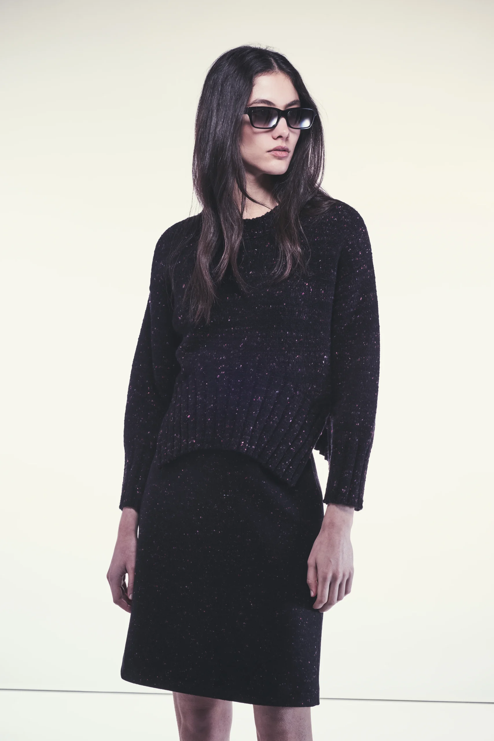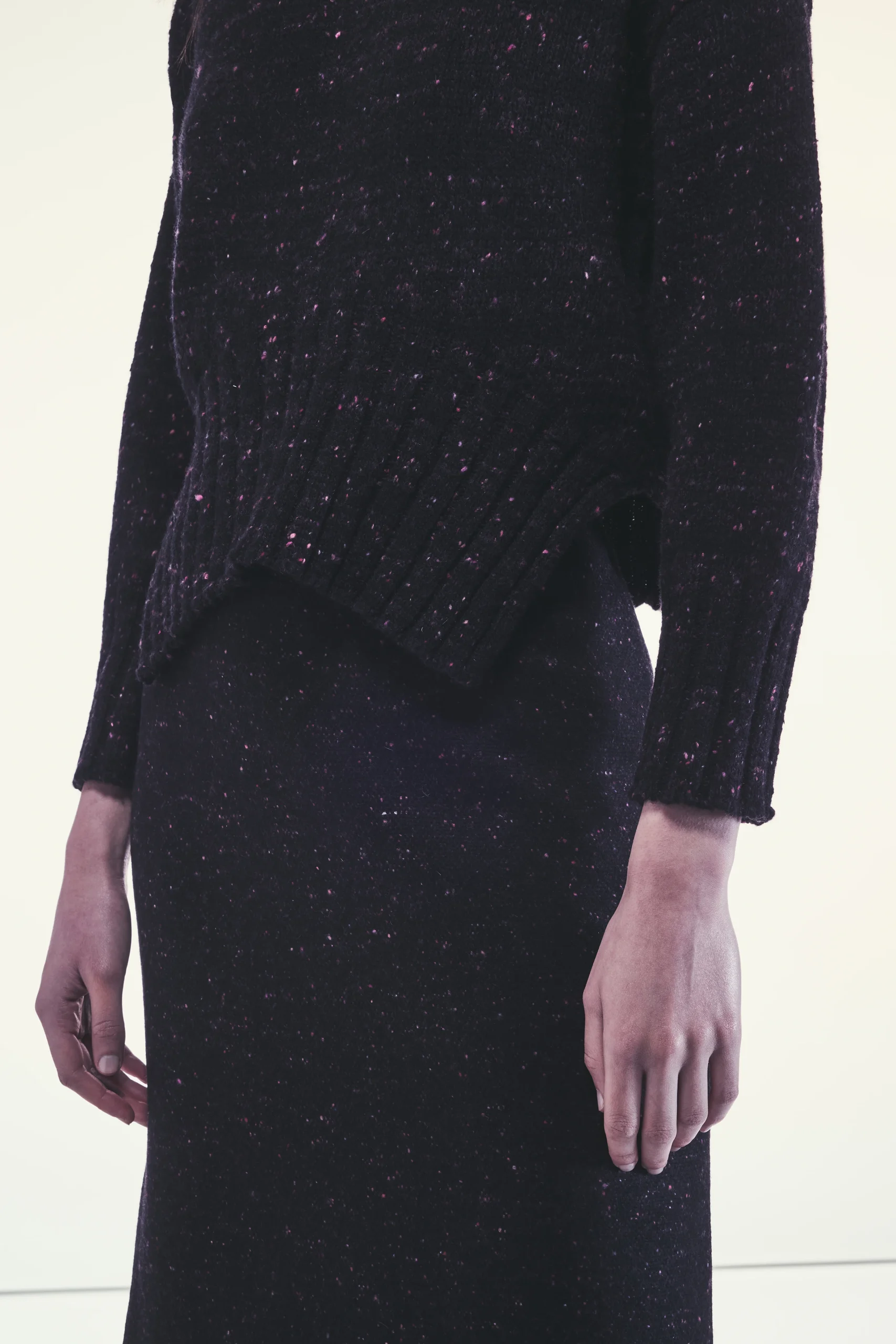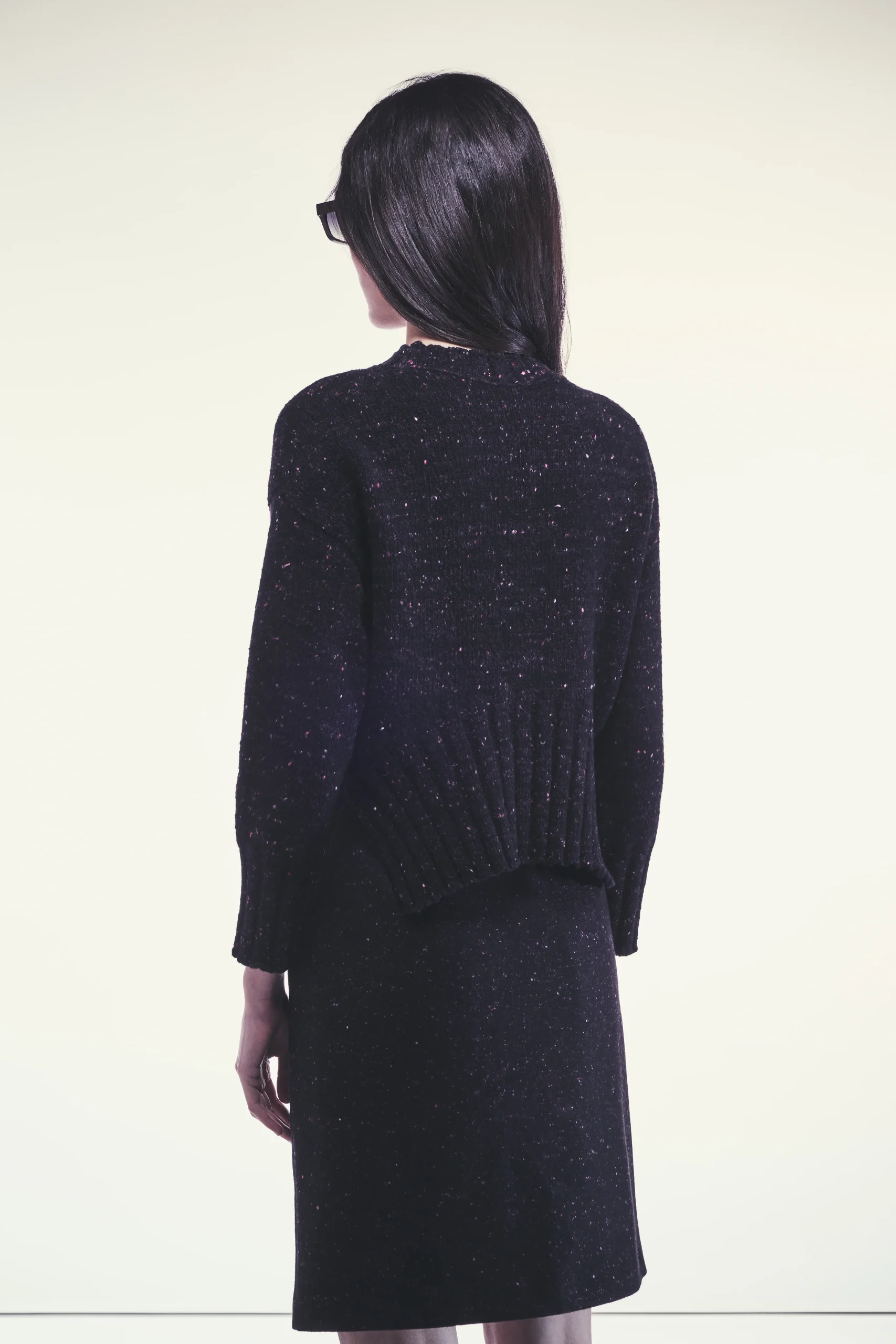 Maglia Gemma Girocollo in cashmere dalla linea morbida Maniche lunghe Texture melange Orlo elasticizzato con effetto tirato che accorcia il davanti rispetto al dietro Lunghezza cropped sopra i fianchi Composizione: 58% Cashmere 42% Poliammide Made in Italy
