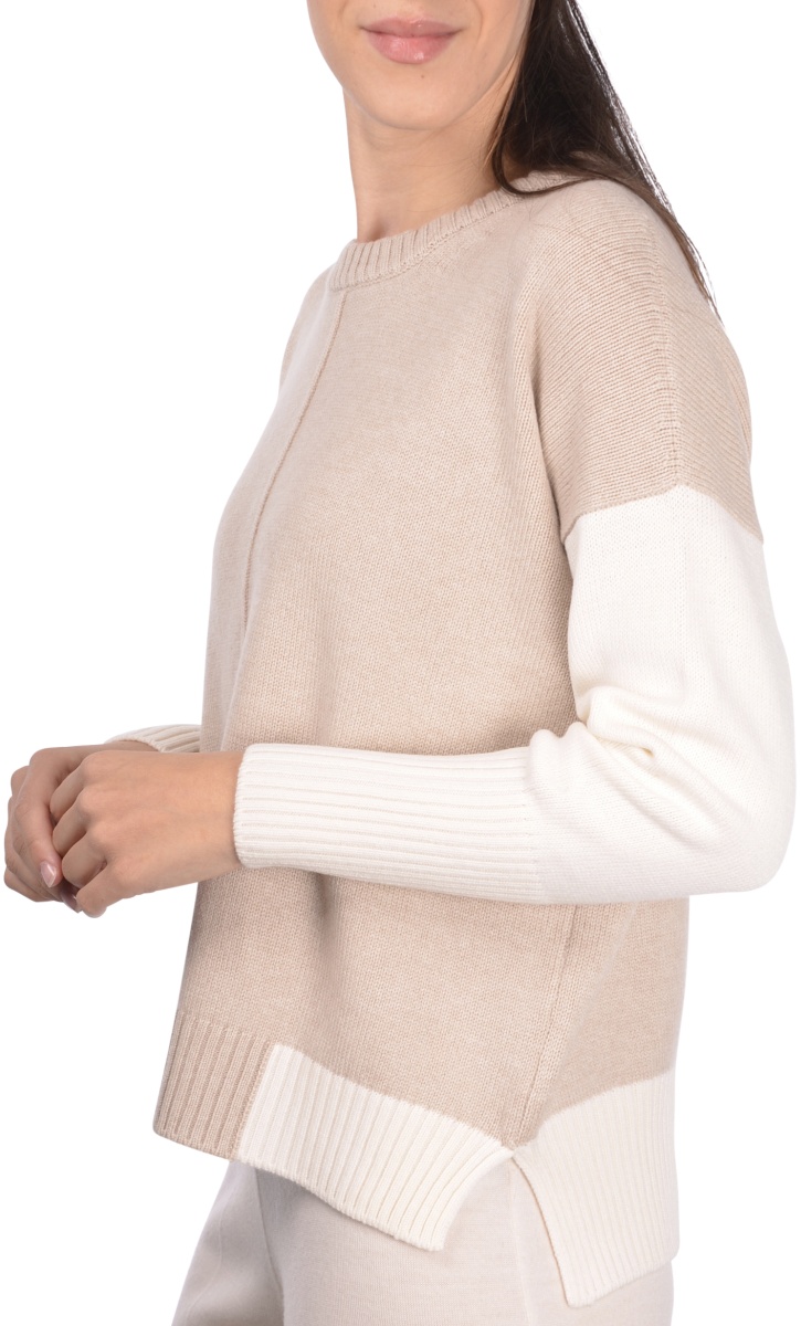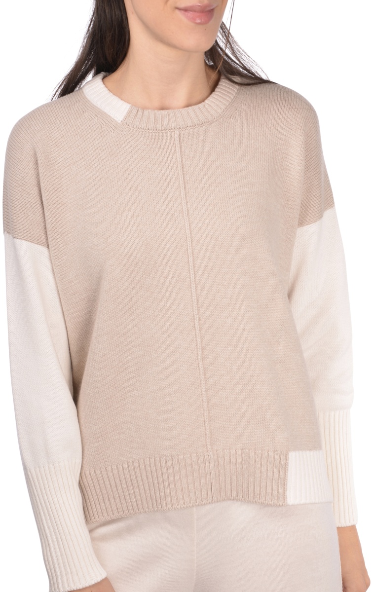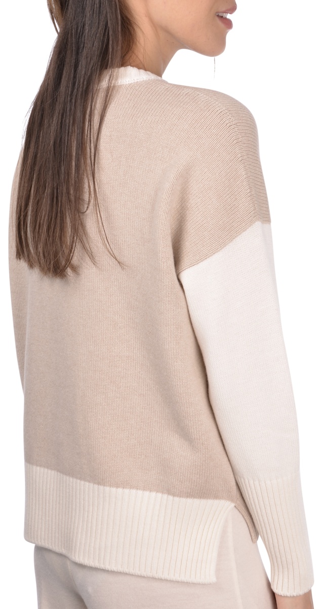 Maglia a girocollo in misto cashmere a 2 fili con lavorazione bicolore Spalla scesaย e nervatura centrale Composizione: 70% LANA – 20% VISCOSA – 10%CASHMERE Made in Italy