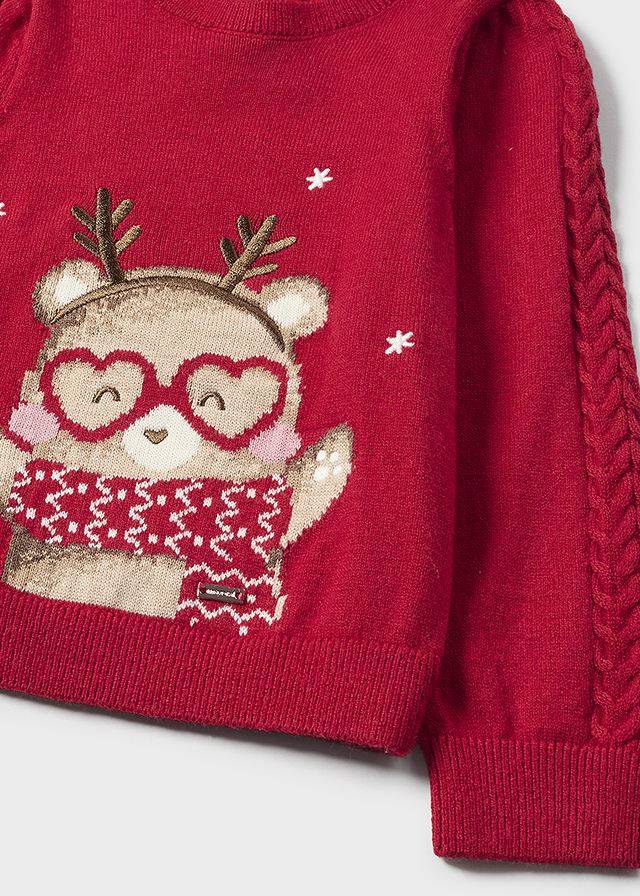 Maglia jacquard rossa a manica lunga per bimba della linea Mayoral in morbido e caldo tessuto. Chiusura con bottoni sulla spalla per facilitare il cambio.