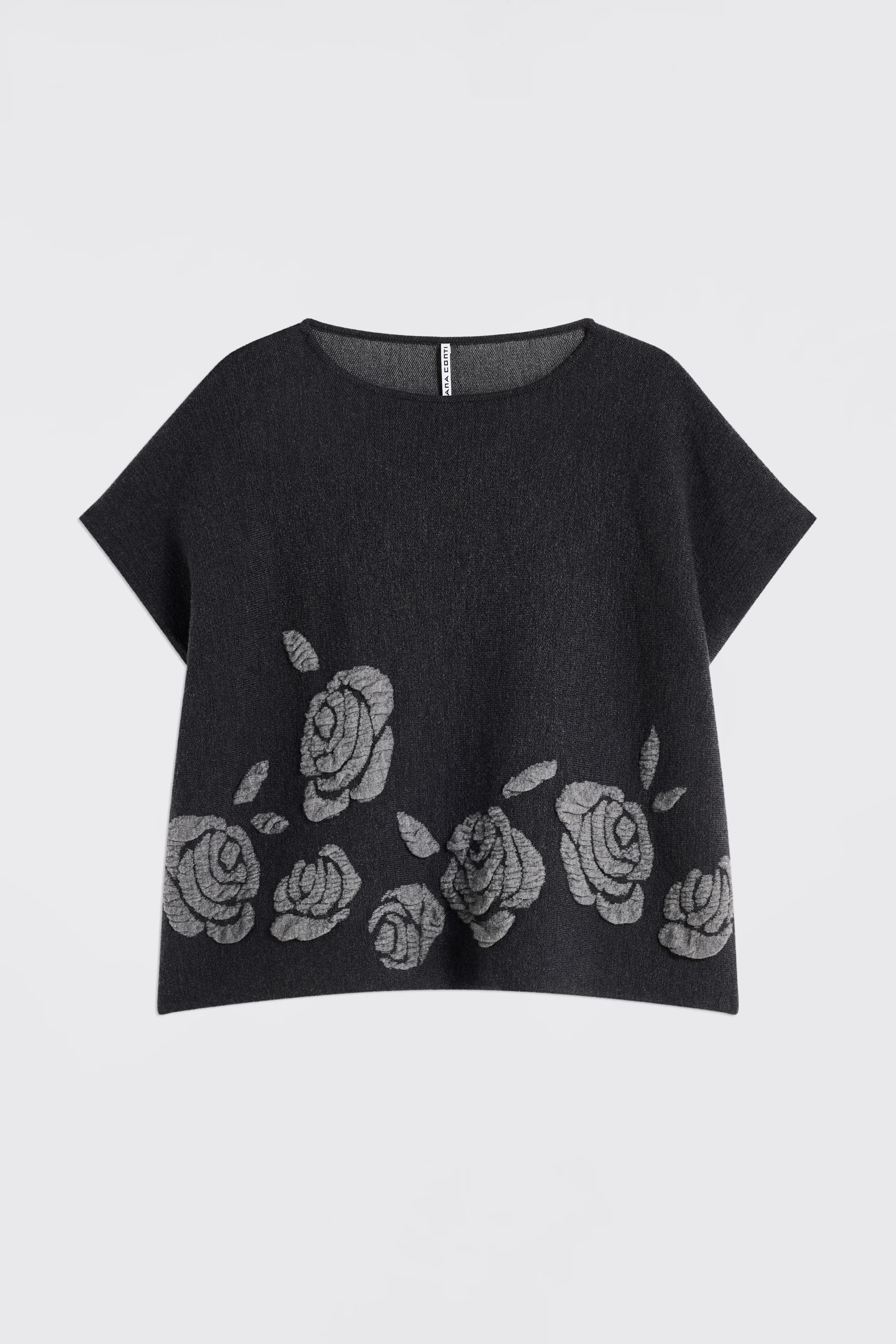 La Maglia Maggie LIVIANA CONTI, รจ una maglia a maniche corte in lana infeltrita, lunga fino alla vita. Motivo rosa jaquard tono su tono. Dettaglio rimovibile con rosa in volant sul lato destro. Linea leggermente over.