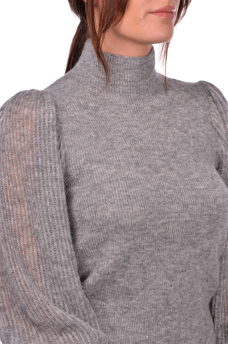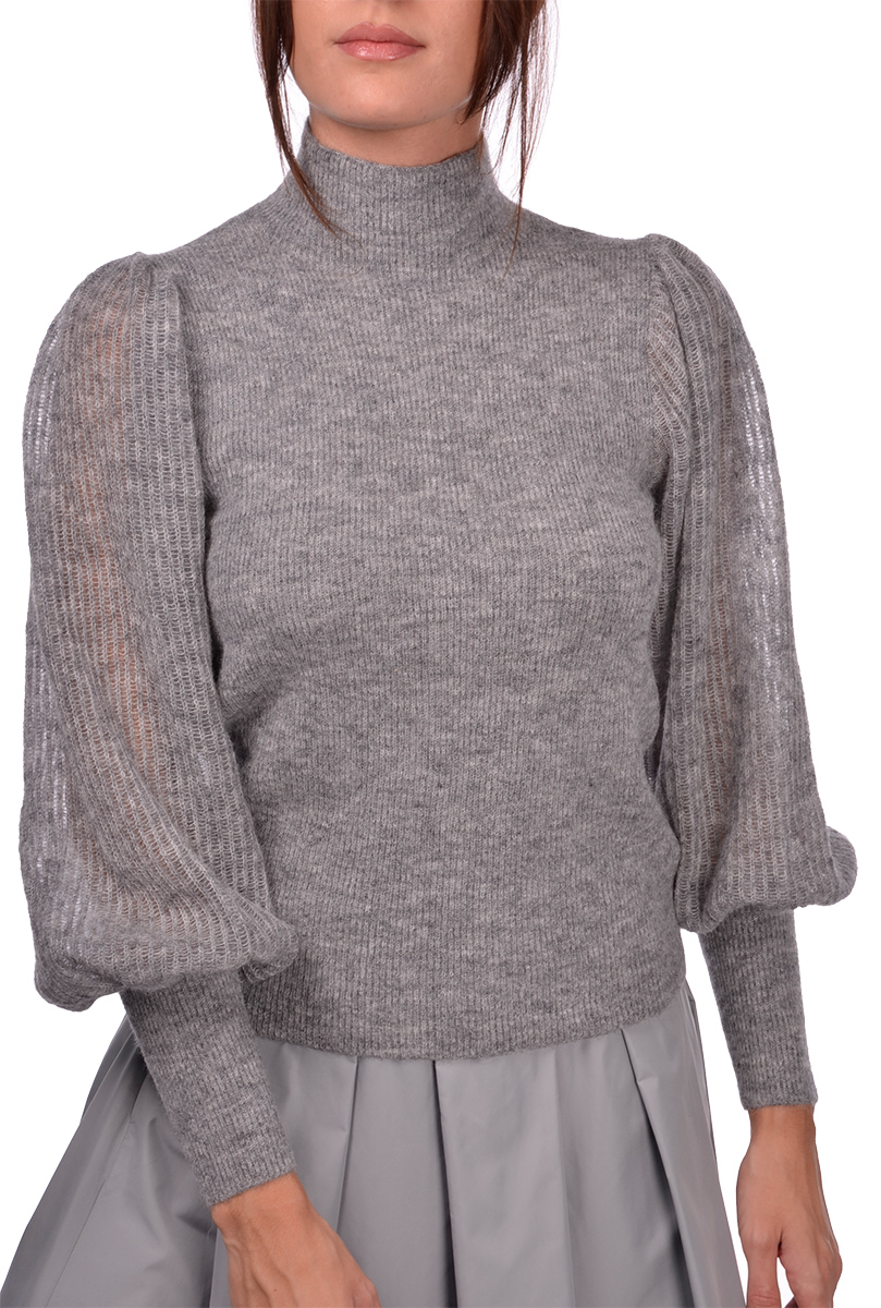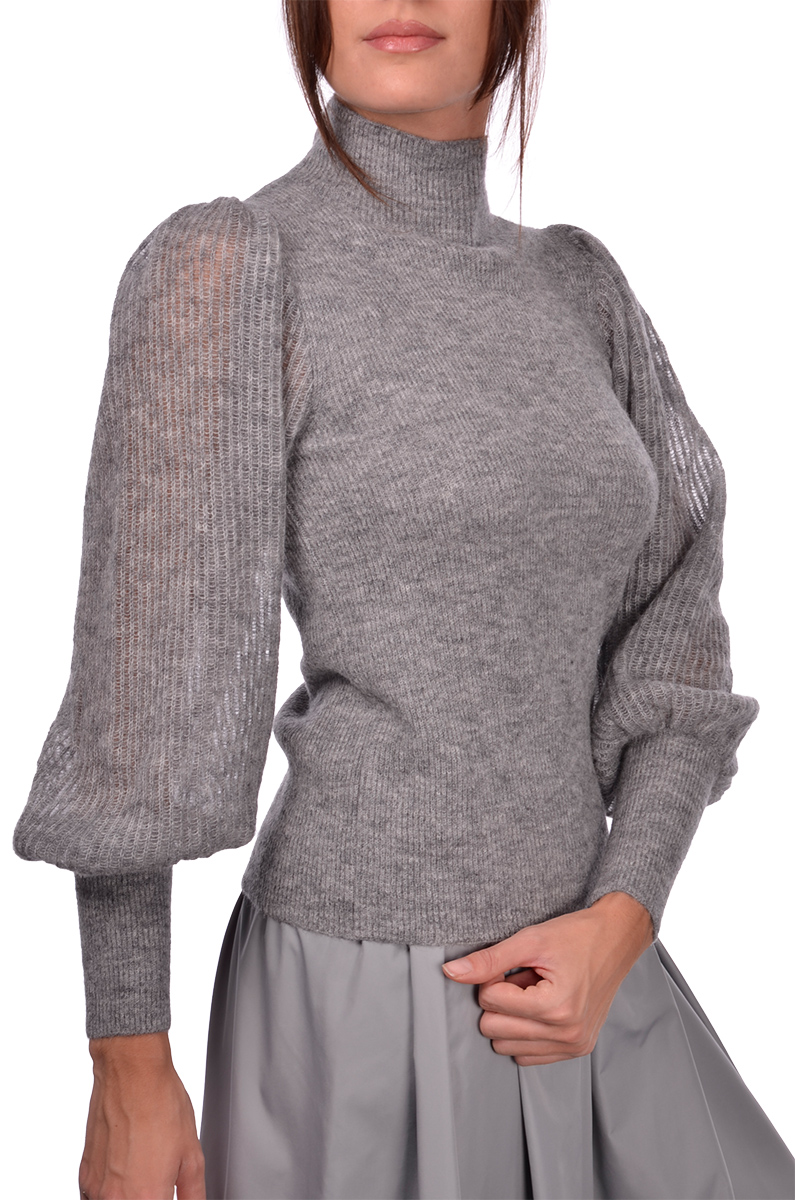 Maglia lupo in misto alpaca con lavorazione maglia inglese Leggera trasparenza delle maniche a sbuffo Composizione: 53% Alpaca 10% Lana 32% Poliammide 5% Poliestere Made in Italy