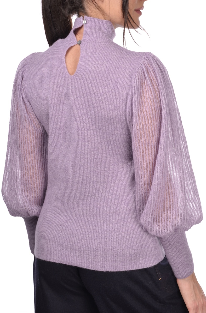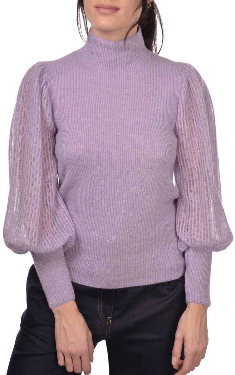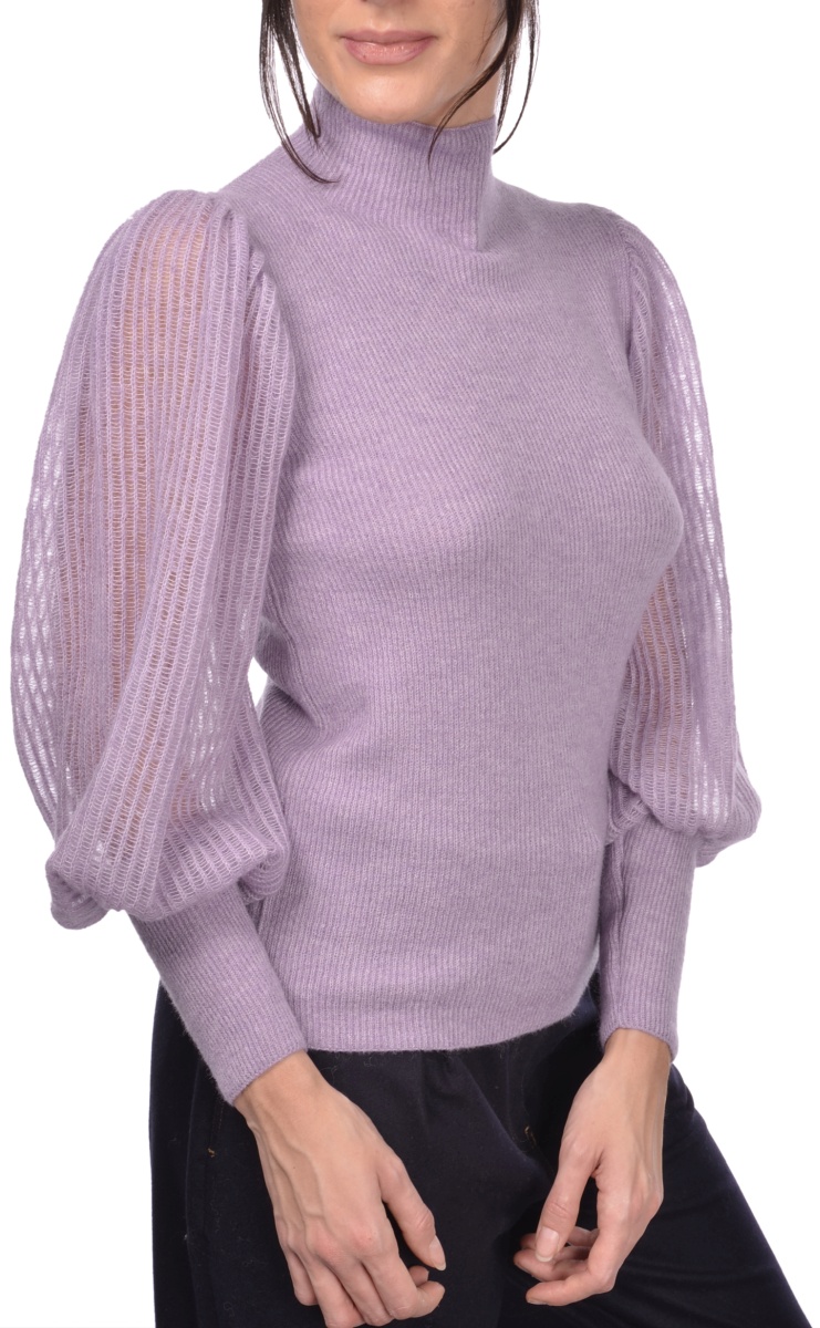 Maglia lupo in misto alpaca con lavorazione maglia inglese Leggera trasparenza delle maniche a sbuffo Composizione: 53% Alpaca 10% Lana 32% Poliammide 5% Poliestere Made in Italy