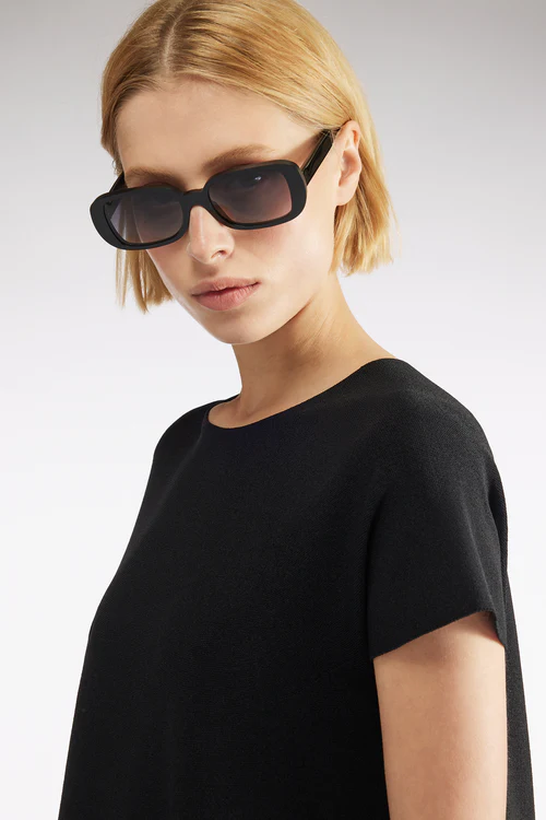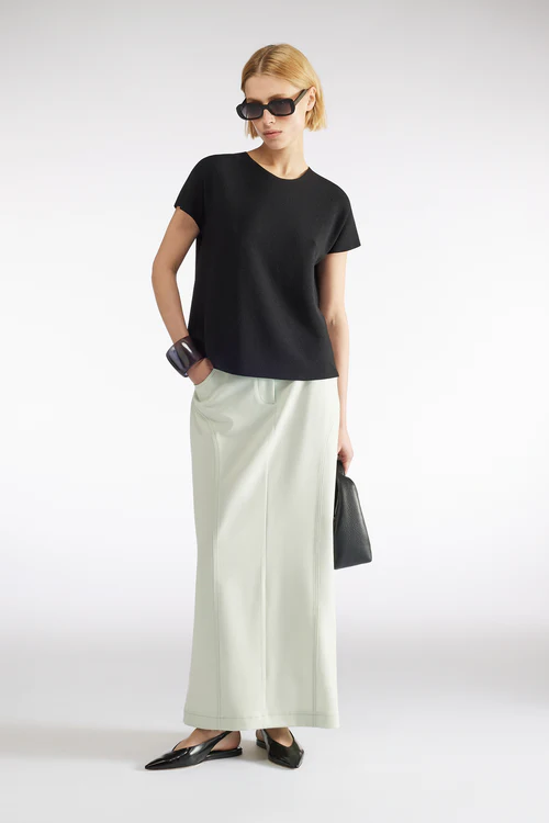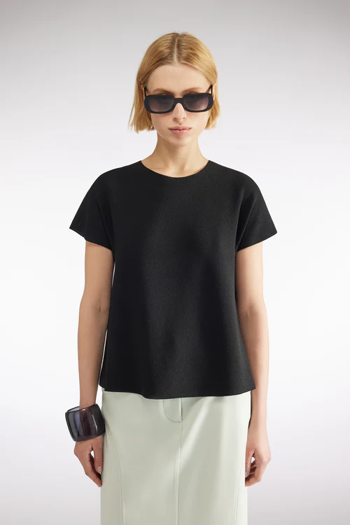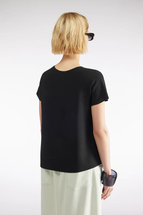 La Maglia Maniche corte LIVIANA CONTI, รจ una maglia in viscosa stretch, girocollo, maniche corte a kimono, lavorazione punto Linz, svasata al fondo, orlo dritto.
