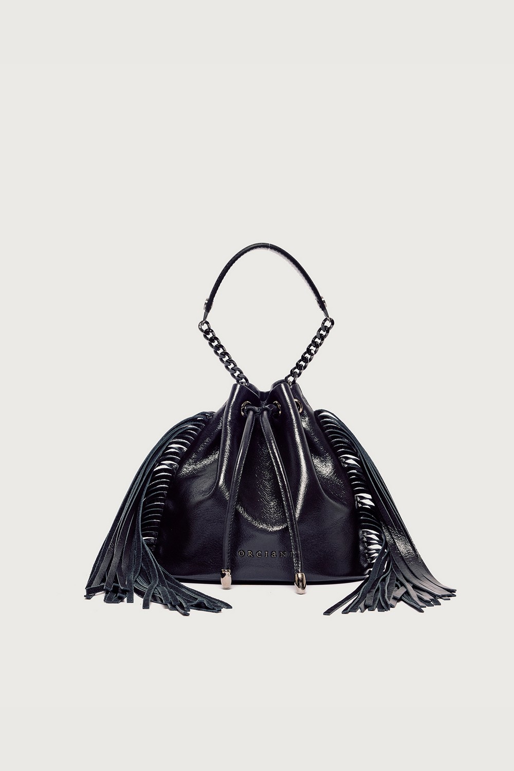 Il Mini Secchiello Gotham ORCIANI, รจ un secchiello in pelle lucida con frange.
