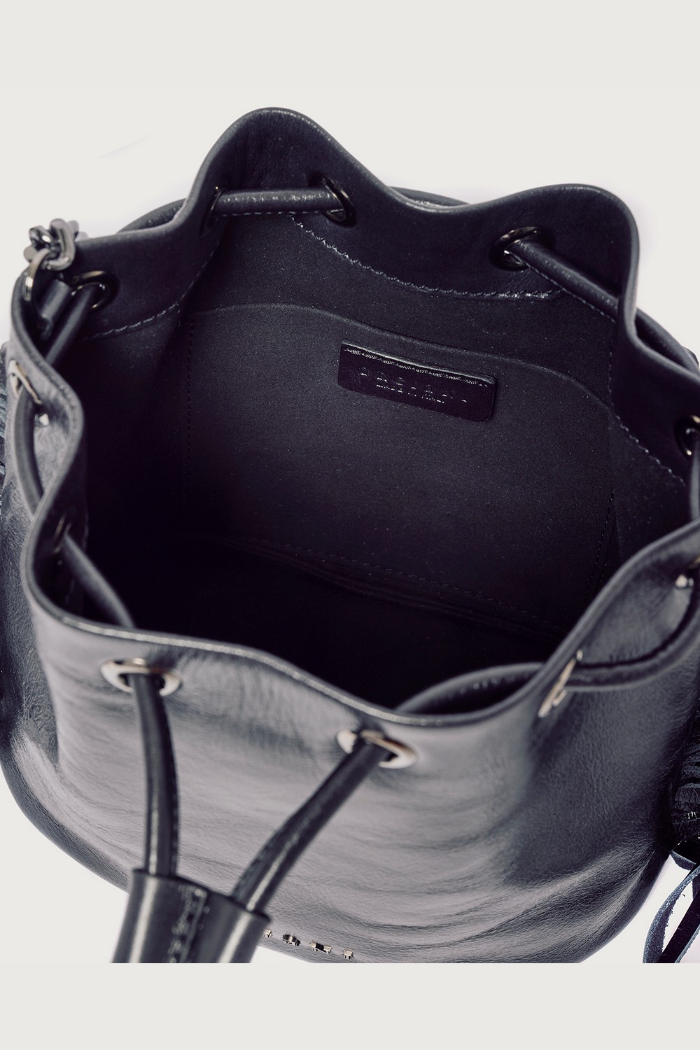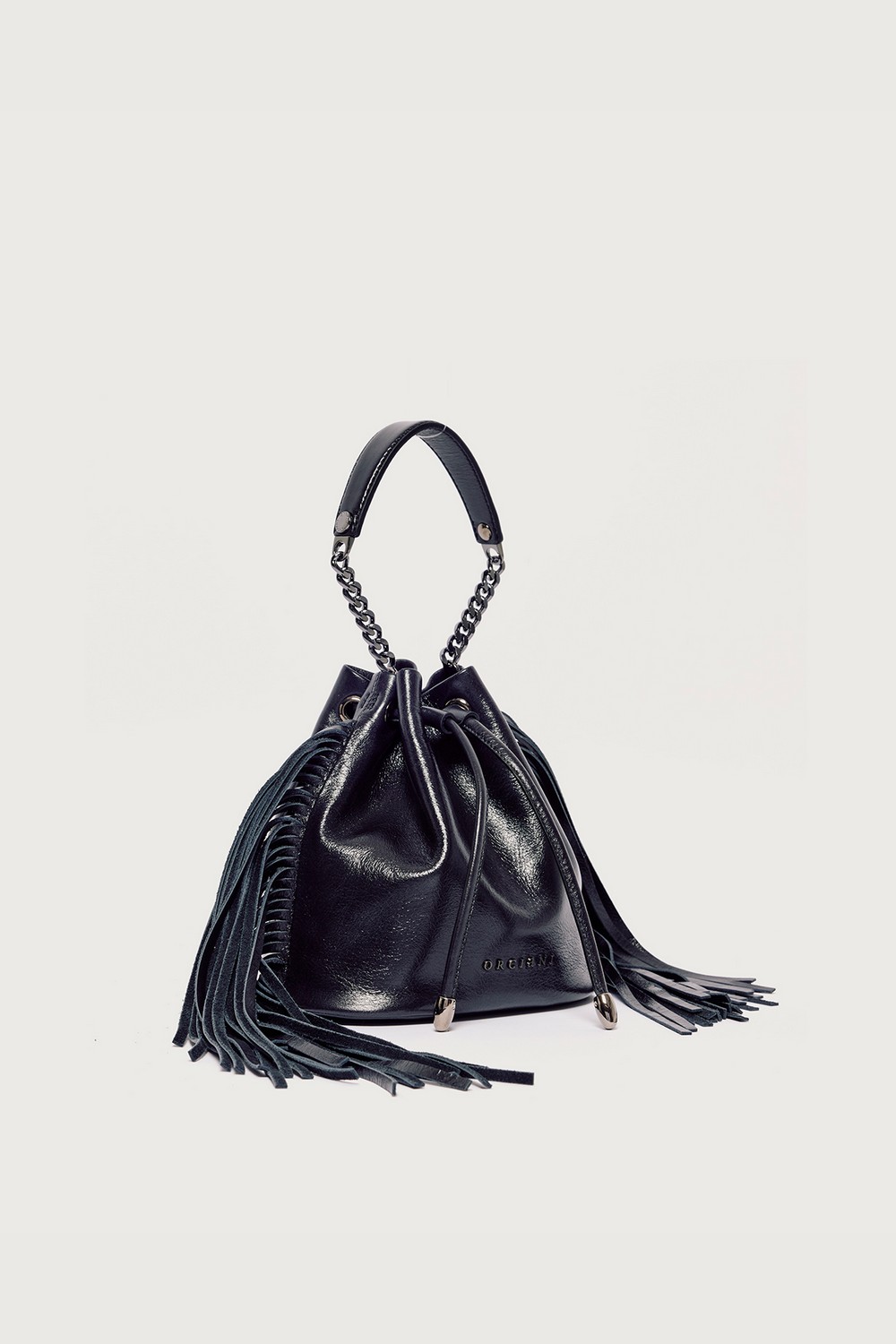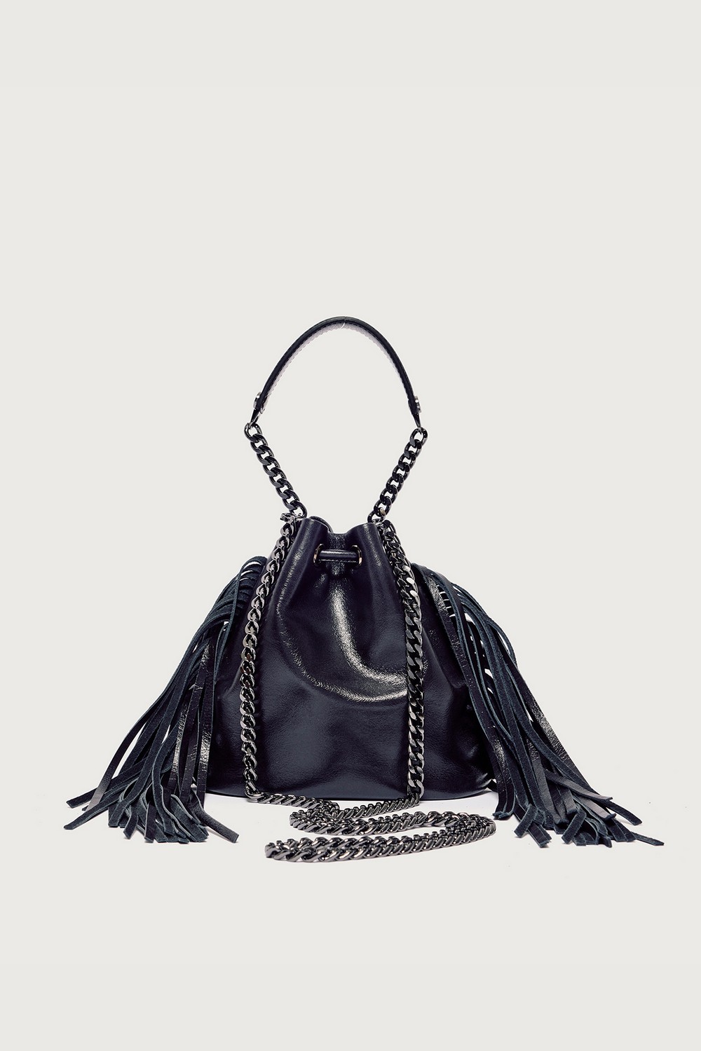Mini secchiello Gotham Dimensioni: Larghezza: 18 cm / Altezza: 18 cm / Profonditร : 8 cm Tasche: taschino interno aperto Chiusura: con laccetto Funzionalitร : a mano, tracolla aggiuntiva in catena Materiale: pelle finish lucido con dettaglio frange Dettagli: metallerie finitura canna di fucile Made in Italy