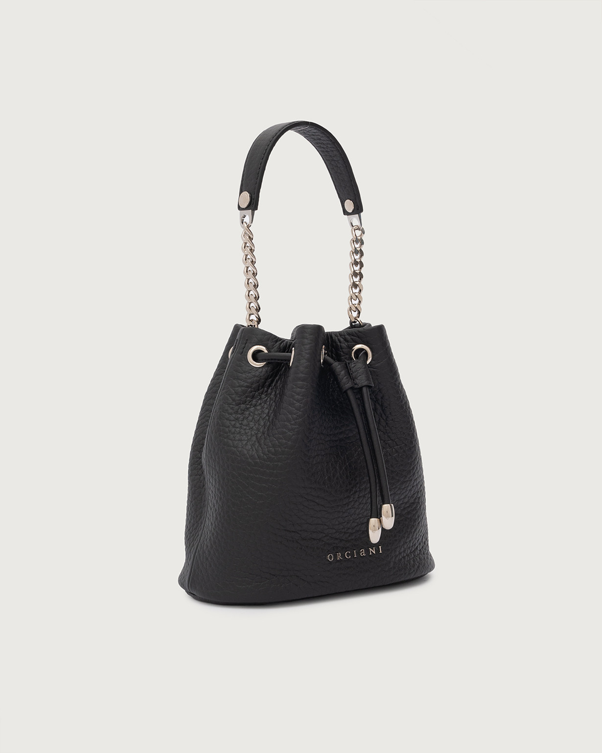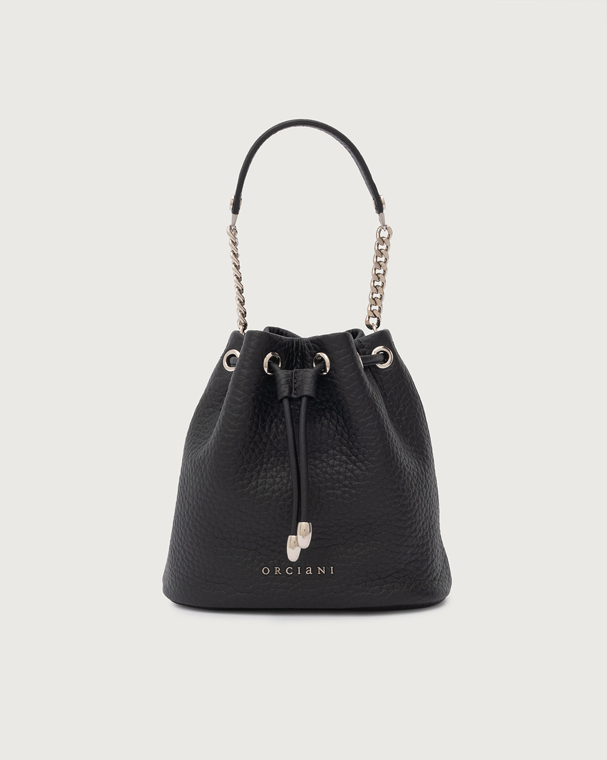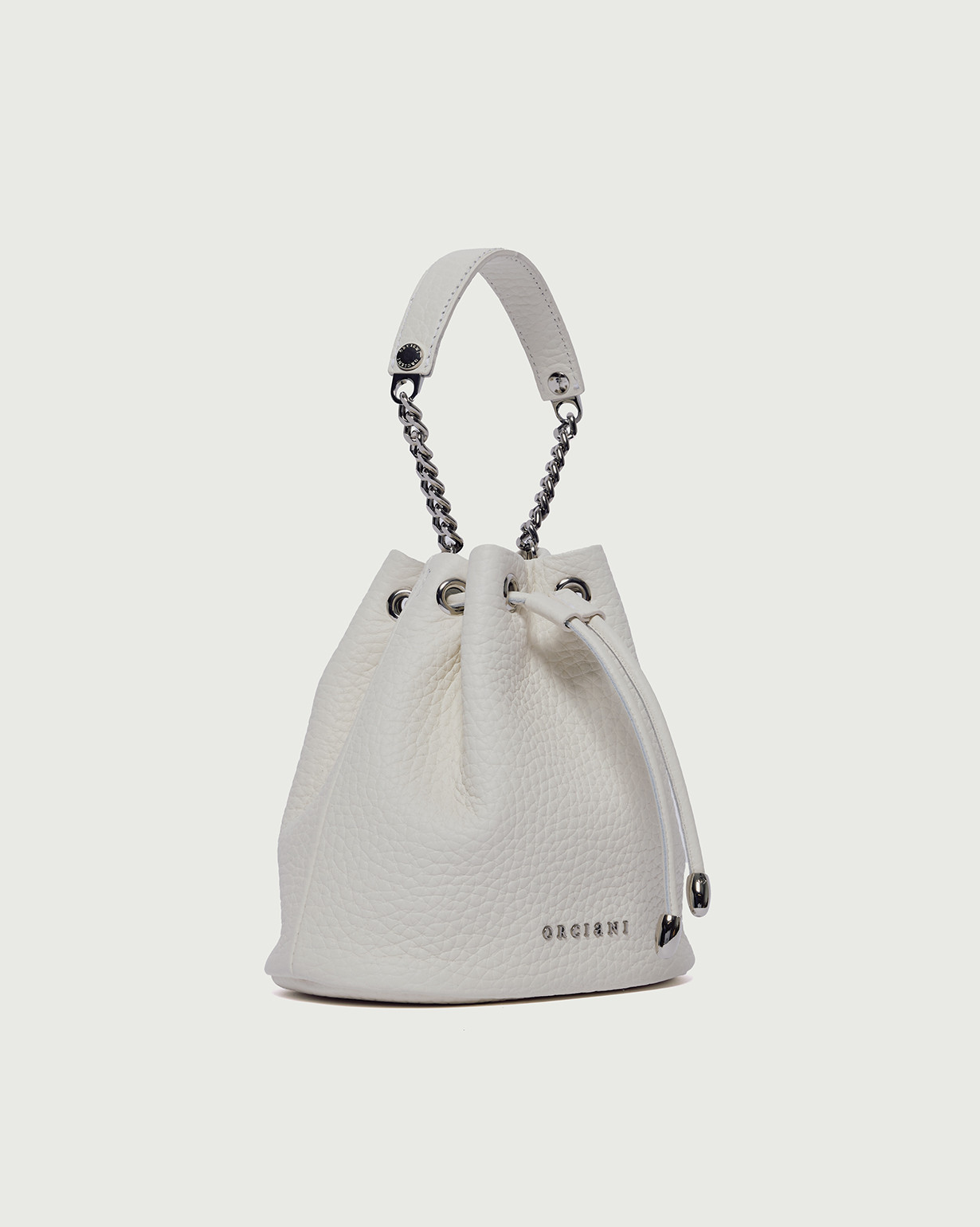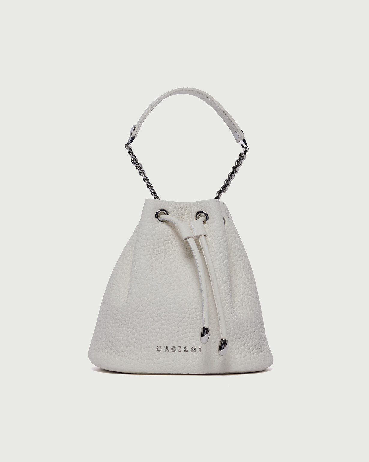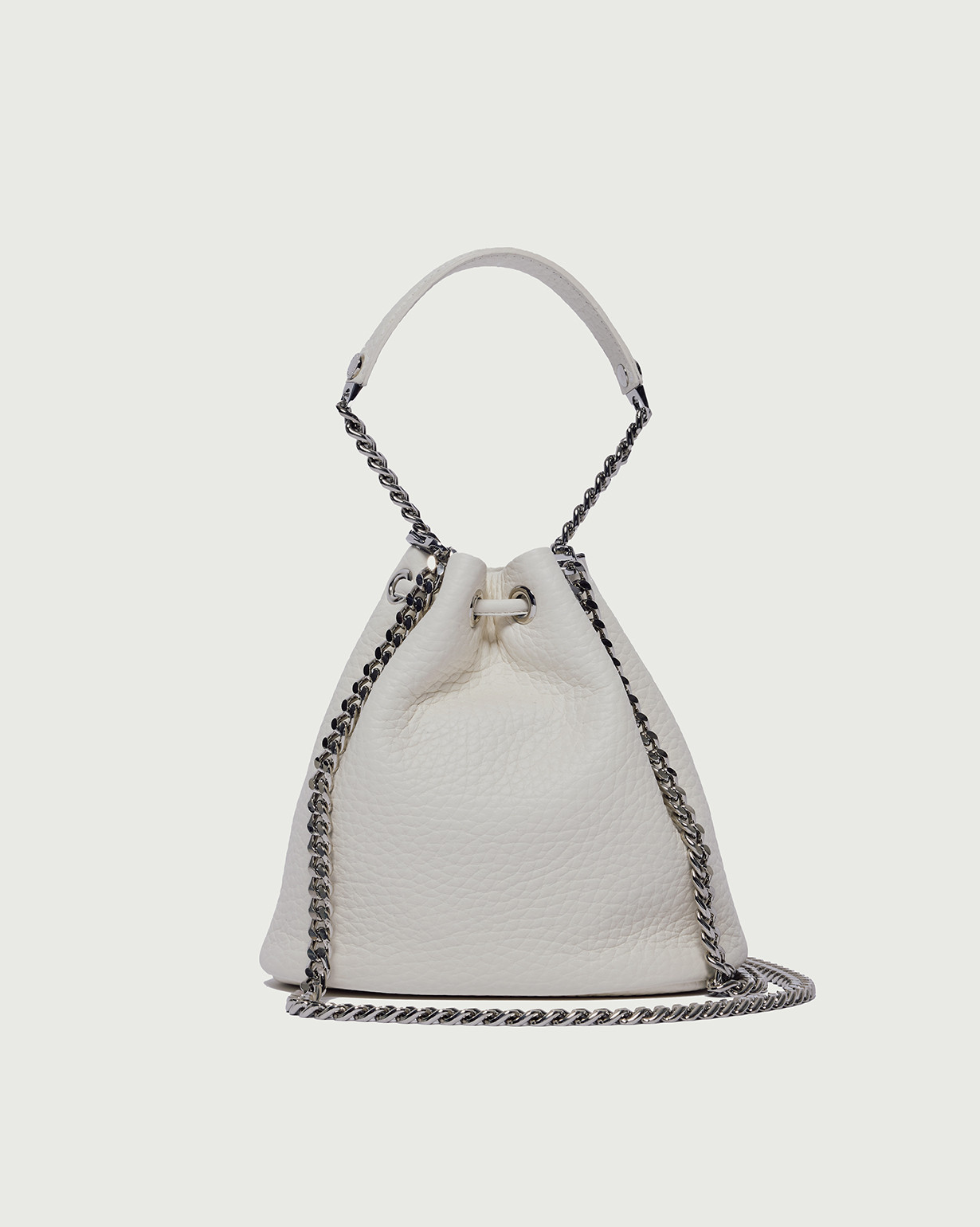 Il Mini Secchiello Nest Soft ORCIANI, รจ una borsetta in pelle martellata con laccetto, rifiniture palladio con tracolla a catena aggiuntiva.