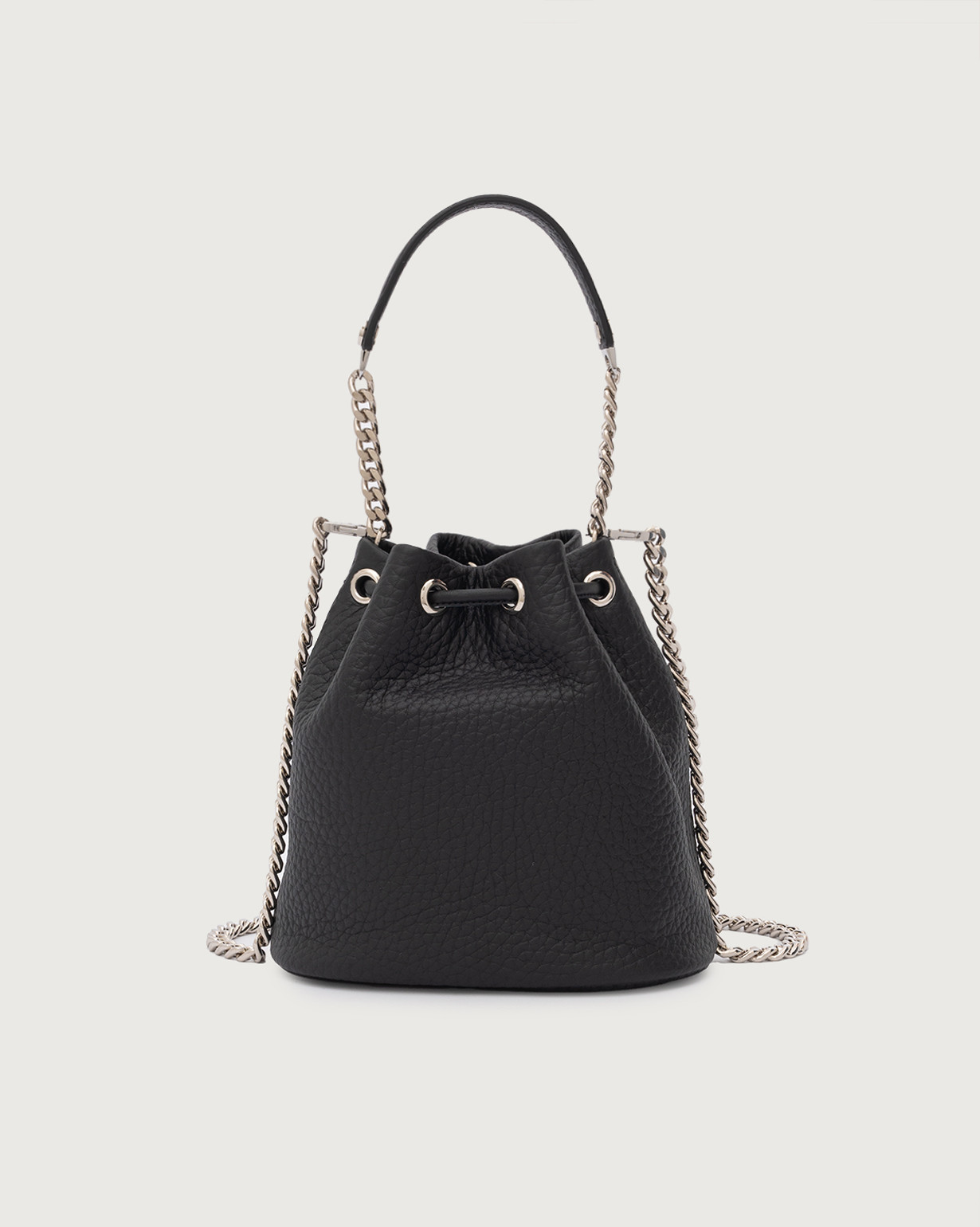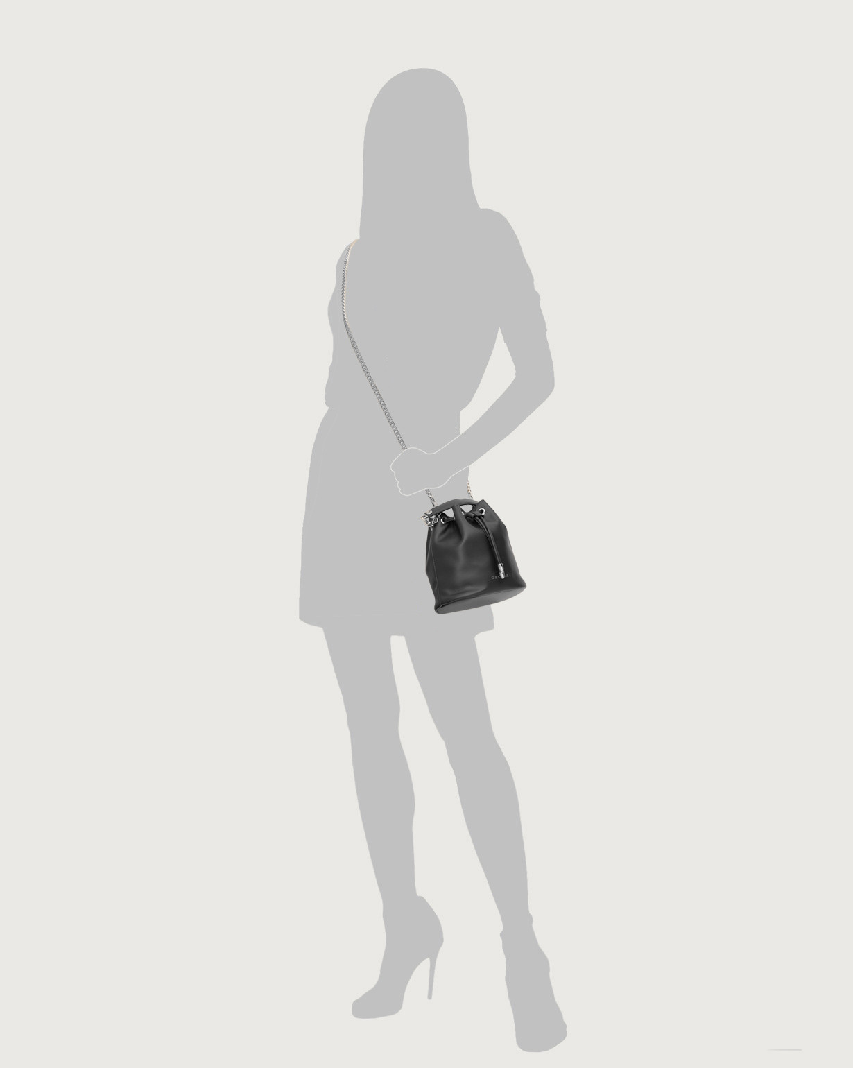 Mini Secchiello con manico e tracolla in pelle soft Dimensioni: Larghezza: 18 cm / Altezza: 18 cm / Profonditร : 8 cm Tasche: taschino interno aperto Chiusura: con laccetto Funzionalitร : a mano, tracolla aggiuntiva in catena Dettagli: finitura palladio Made in Italy