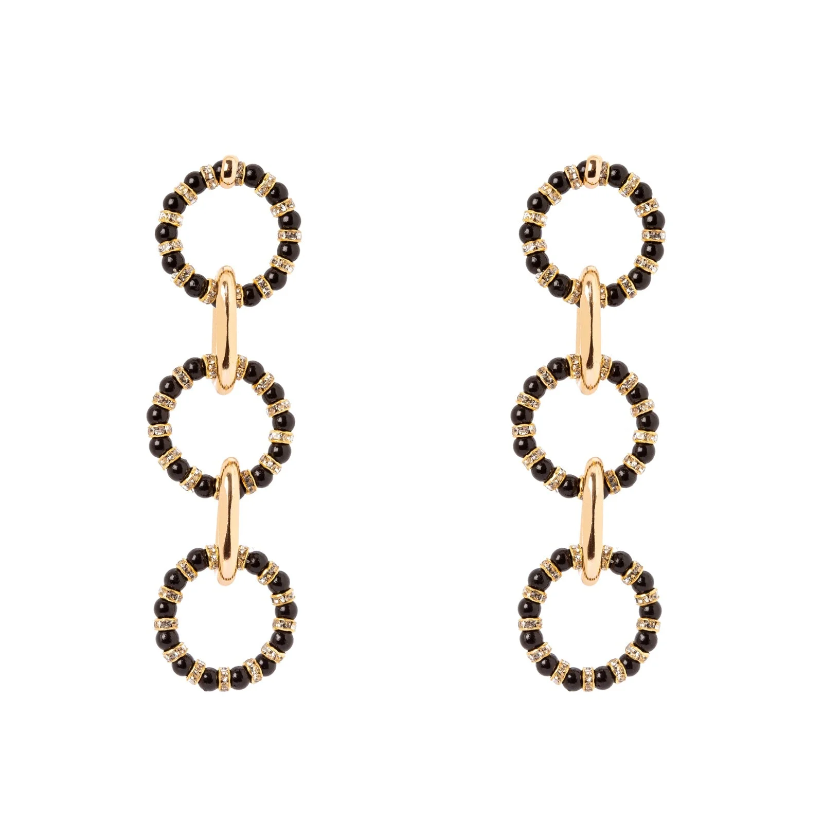Il design è composto da tre cerchi intrecciati verticalmente, collegati da piccoli elementi dorati che creano un movimento armonioso e slanciato. Ogni cerchio è arricchito da micro cristalli neri, sapientemente incastonati per donare luce e profondità senza risultare eccessivi. Il contrasto tra il dorato caldo e il nero brillante rende questi orecchini estremamente versatili e adatti a qualsiasi palette di colori.