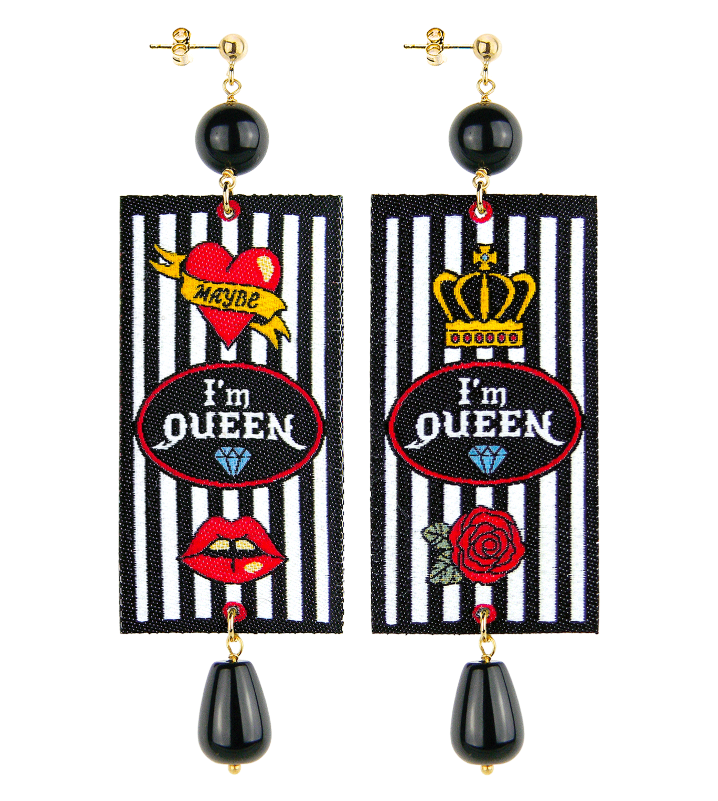 Orecchini con un’ etichetta in tessuto ricamata montata in ottone galvanizzato oro Pietre Dimensioni: Lunghezza 6 cm Made in Italy