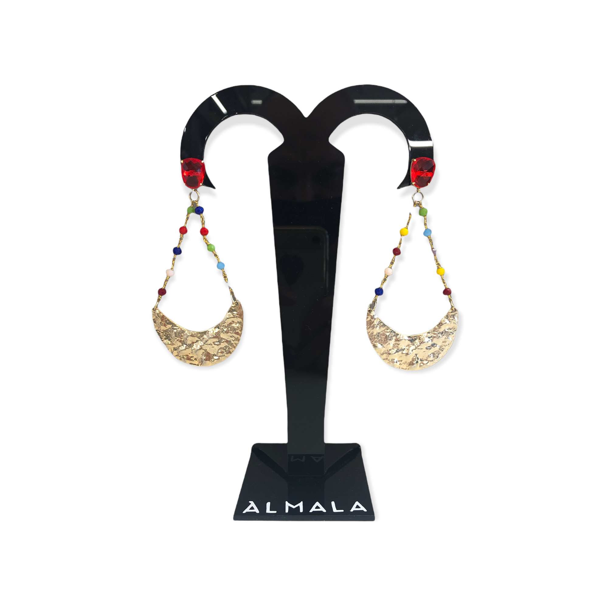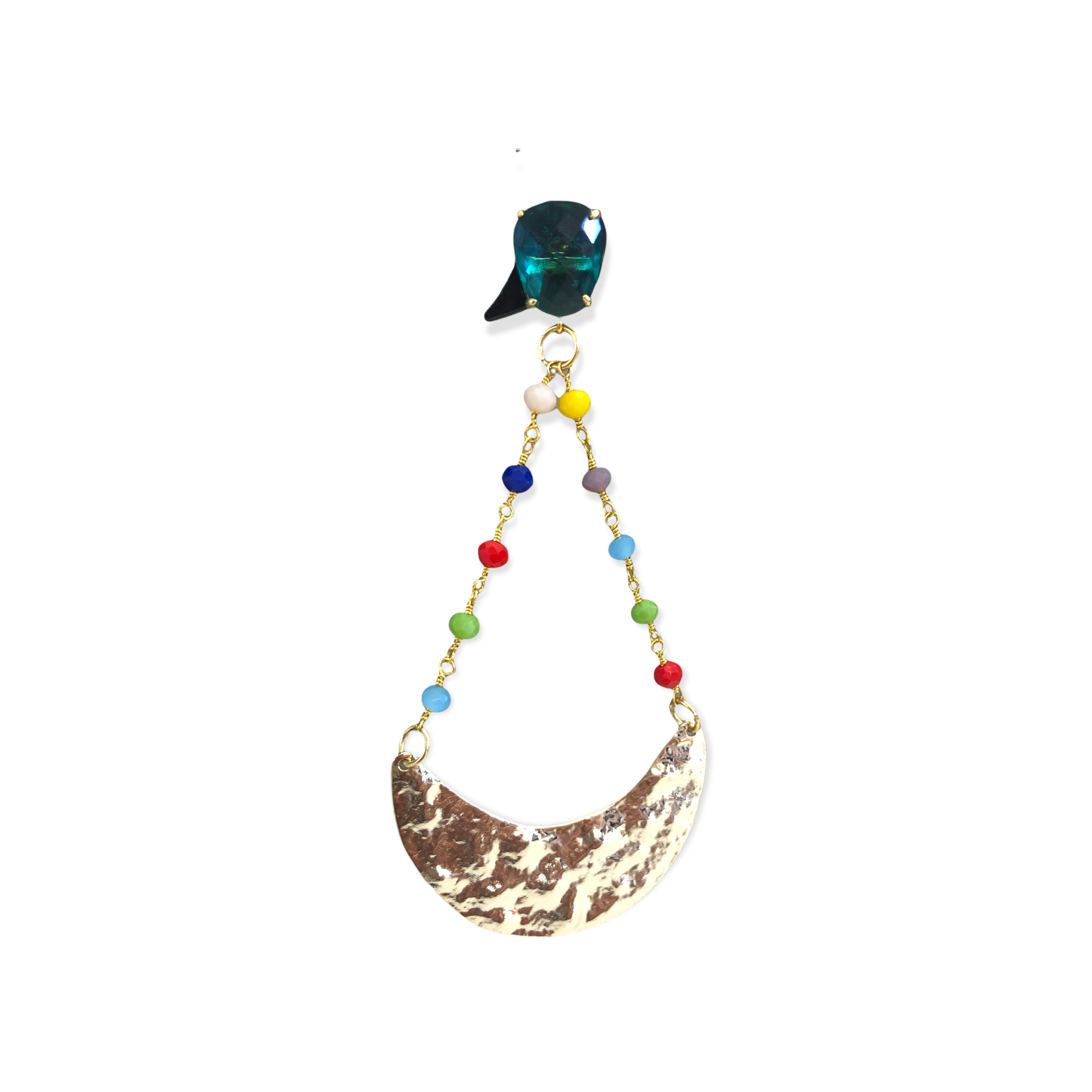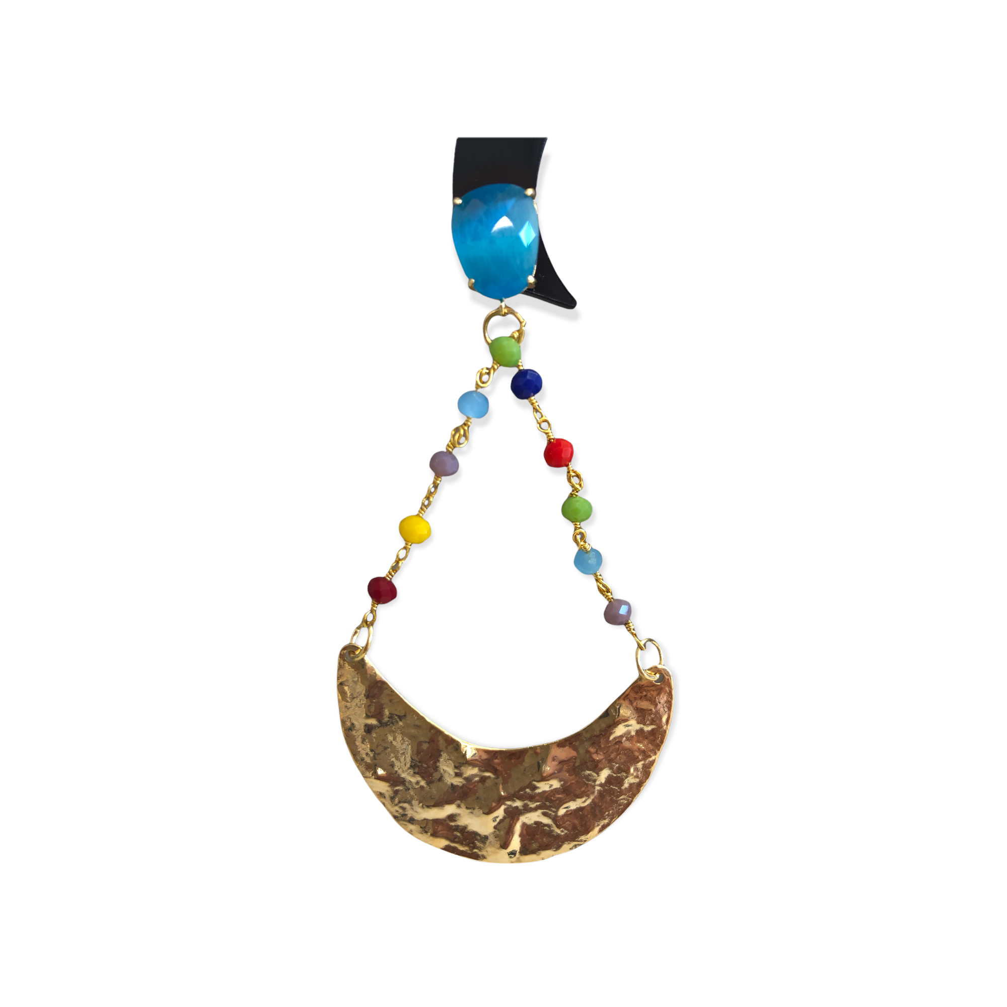 L’orecchino gipsy ALMALA, รจ un orecchino con pendente in ottone lavorato a mezza luna, rifinito con quarzi e cristalli.