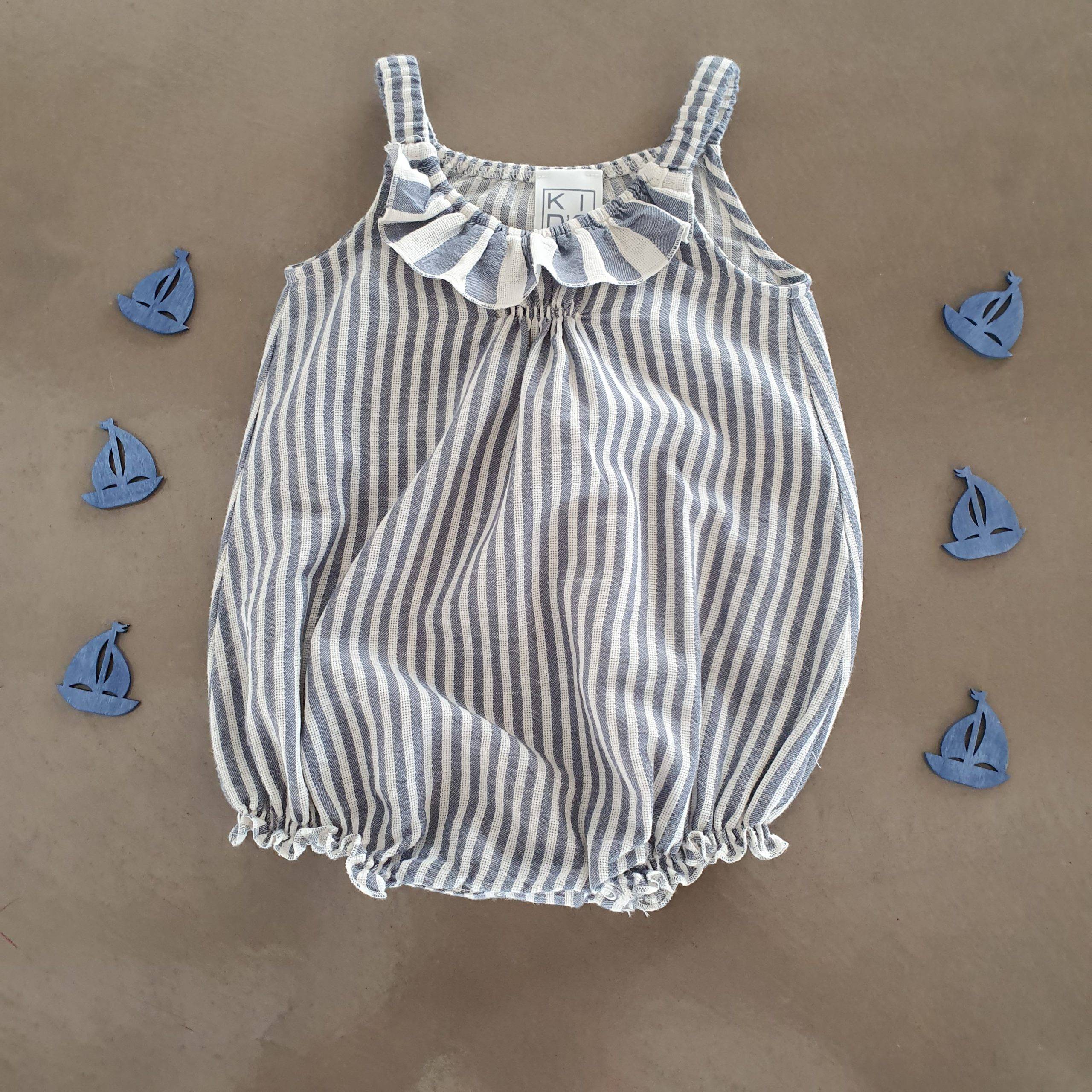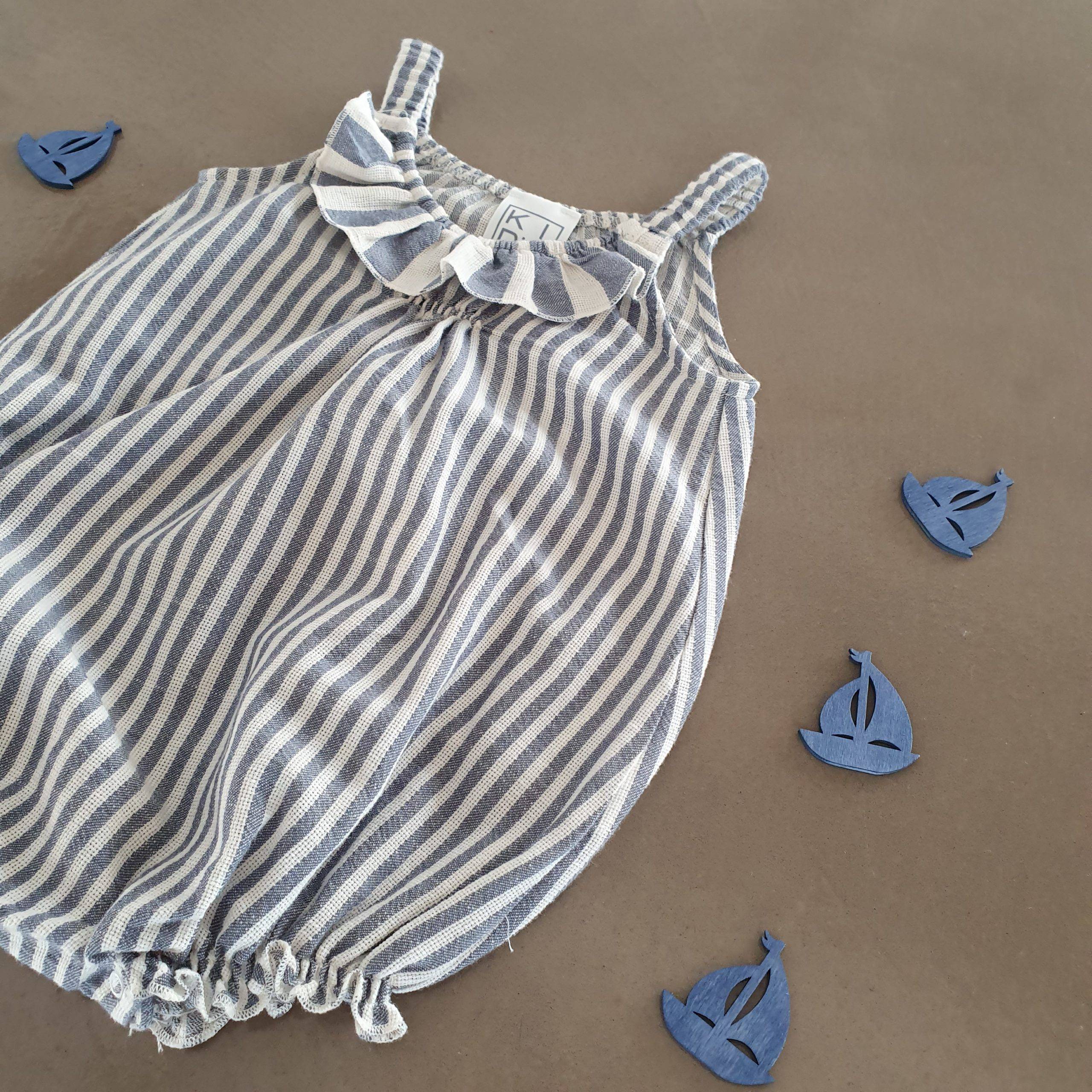 Pagliaccetto neonata in cotoneย a righe bianche e celesti con bretelline. Comoda apertura sotto il cavallo con bottoncini a pressione.