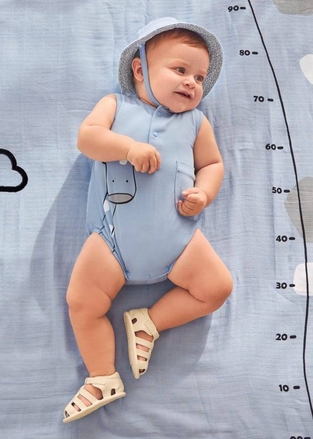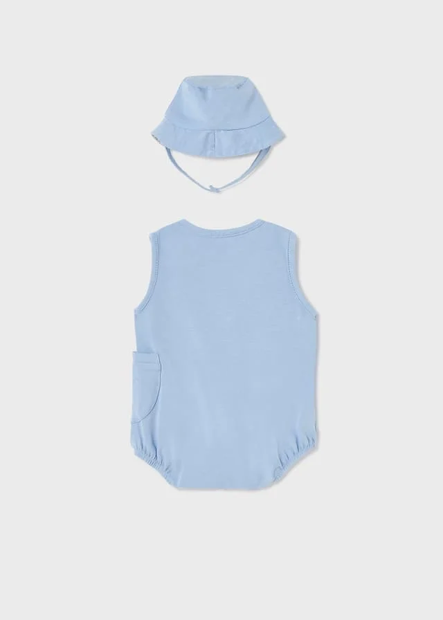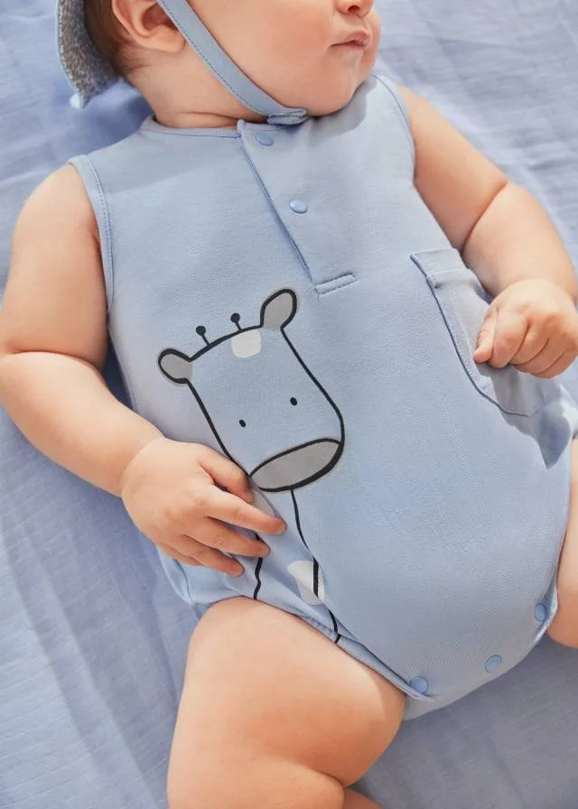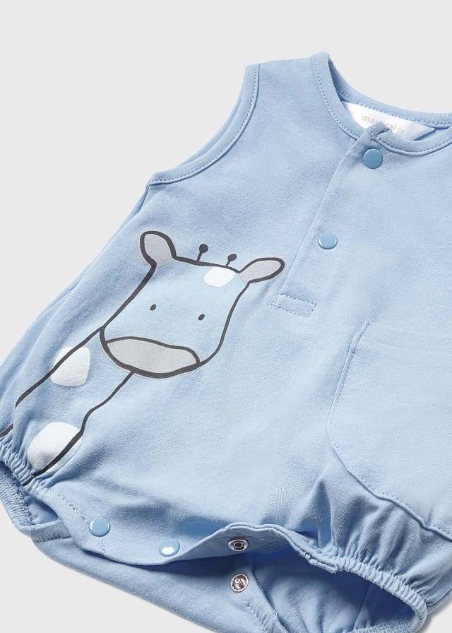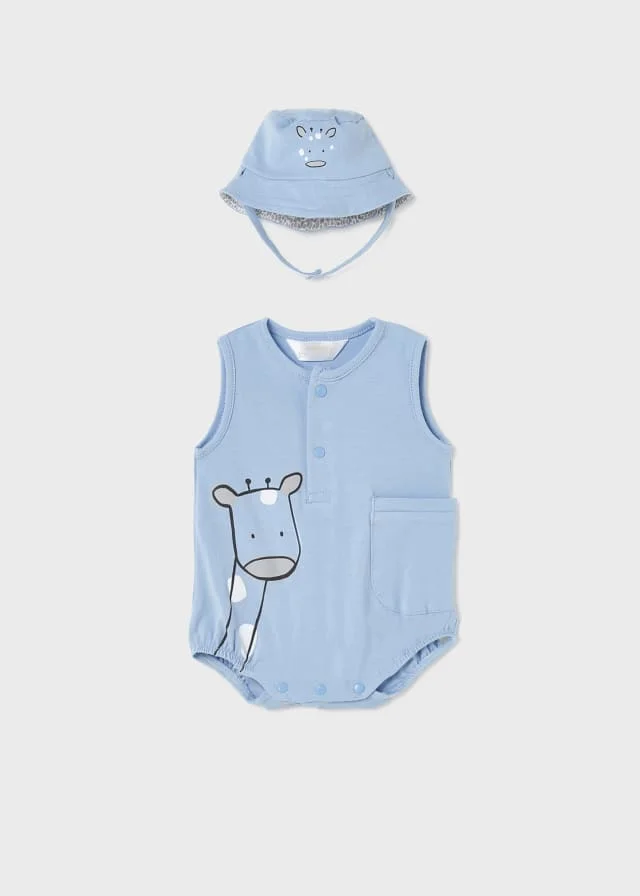Il pagliaccetto Mayoral celeste con cappellino abbinato giraffa potrebbe essere un adorabile capo di abbigliamento per neonati o bambini piccoli.