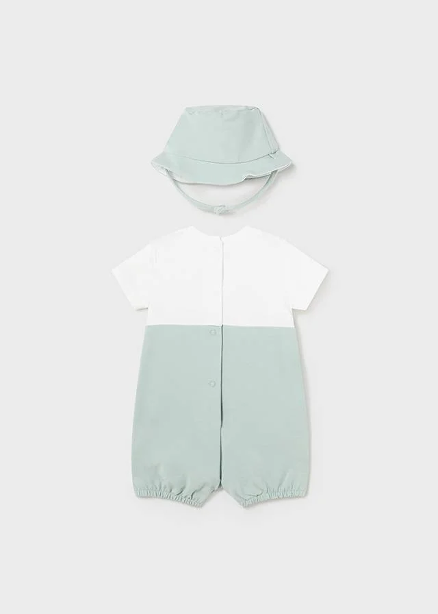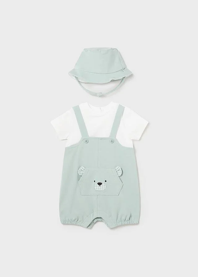 Pratico e comodo pagliaccetto corto con finta salopette e cappello per neonato, nuova collezione primavera estate firmata mayoral. pagliaccetto realizzato a manica corta girocollo, chiusura con bottoni a pressione nella parte posteriore che facilitano la vestibilitร del capo. .