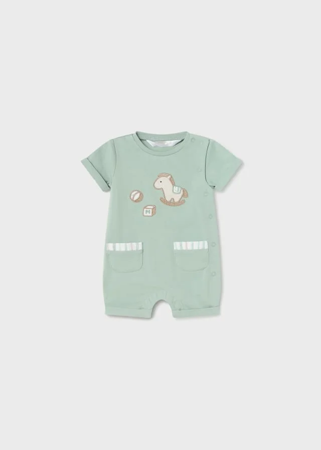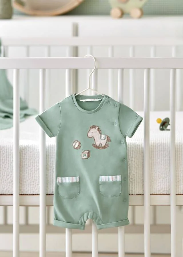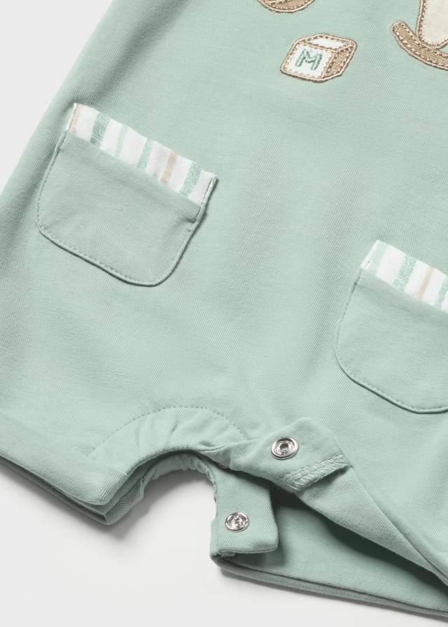 Il design del pagliaccetto Mayoral verde con taschine รจ funzionale e pratico. Si apre facilmente con bottoni automatici sulla parte anteriore e inferiormente, permettendo di vestire e svestire il bambino in modo rapido e semplice. Le taschine sono posizionate sui lati del pagliaccetto, utili per riporre piccoli oggetti come ciucci o bavaglini.