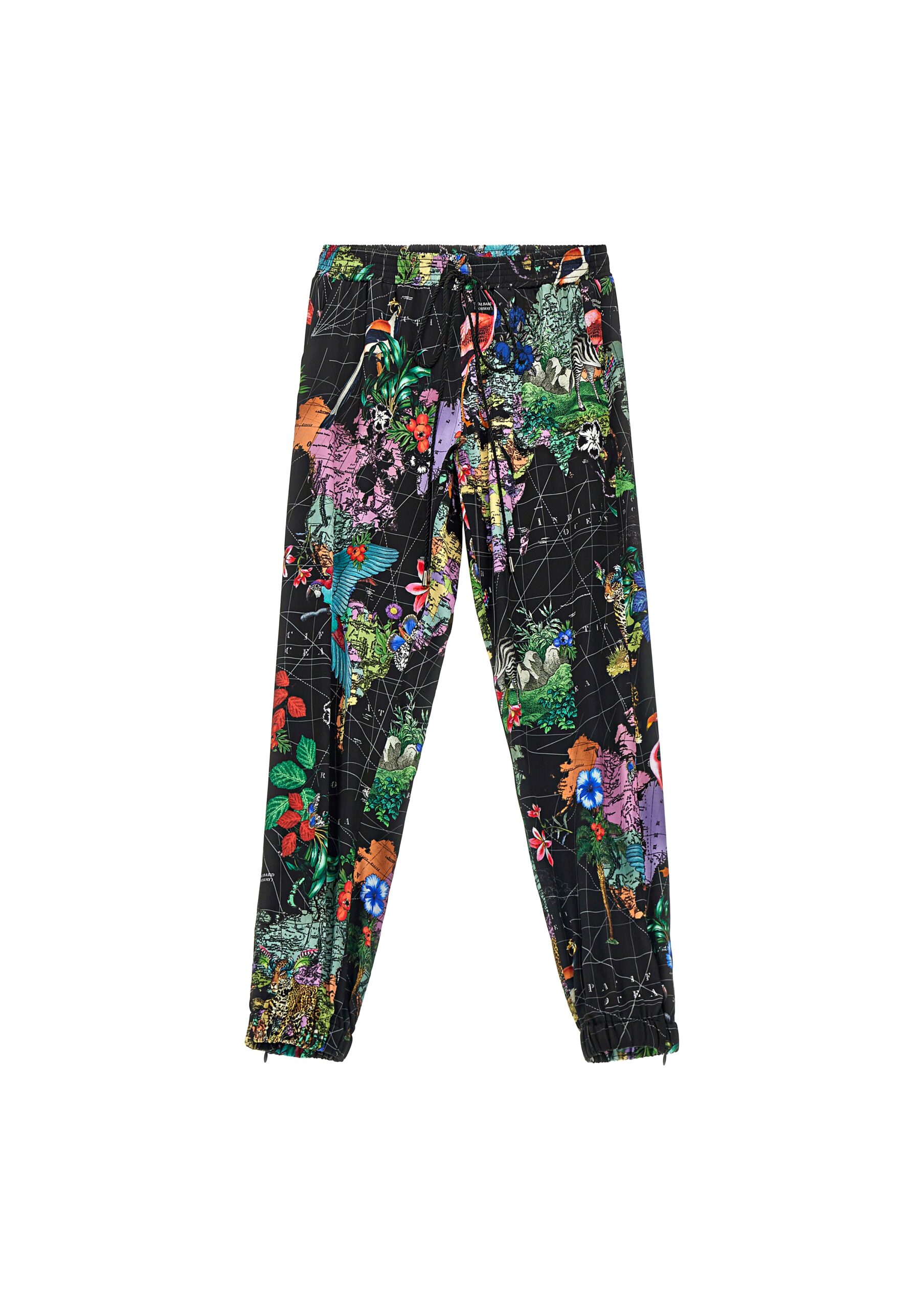 Pantalone fantasia Animalworld in viscosa elasticizzata Tasche laterali Tasca posteriore a filo Vita elasticizzata con coulisse Fondo elasticizzato con zip laterali. Composizione: 97% Viscosa 3% Elastan Made in Italy