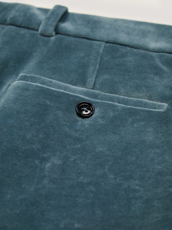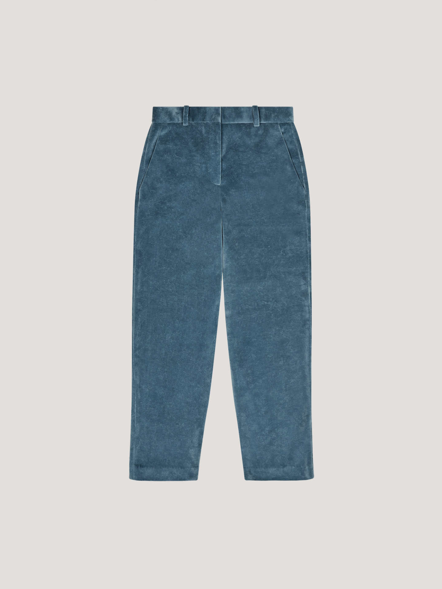 Pantalone carrot in velluto liscio Chiusura ad un bottone interno con zip e gancio Due tasche laterali e una posteriore a filo con bottone Materiale: velluto Composizione: 80% Cotone 20% Poliestere