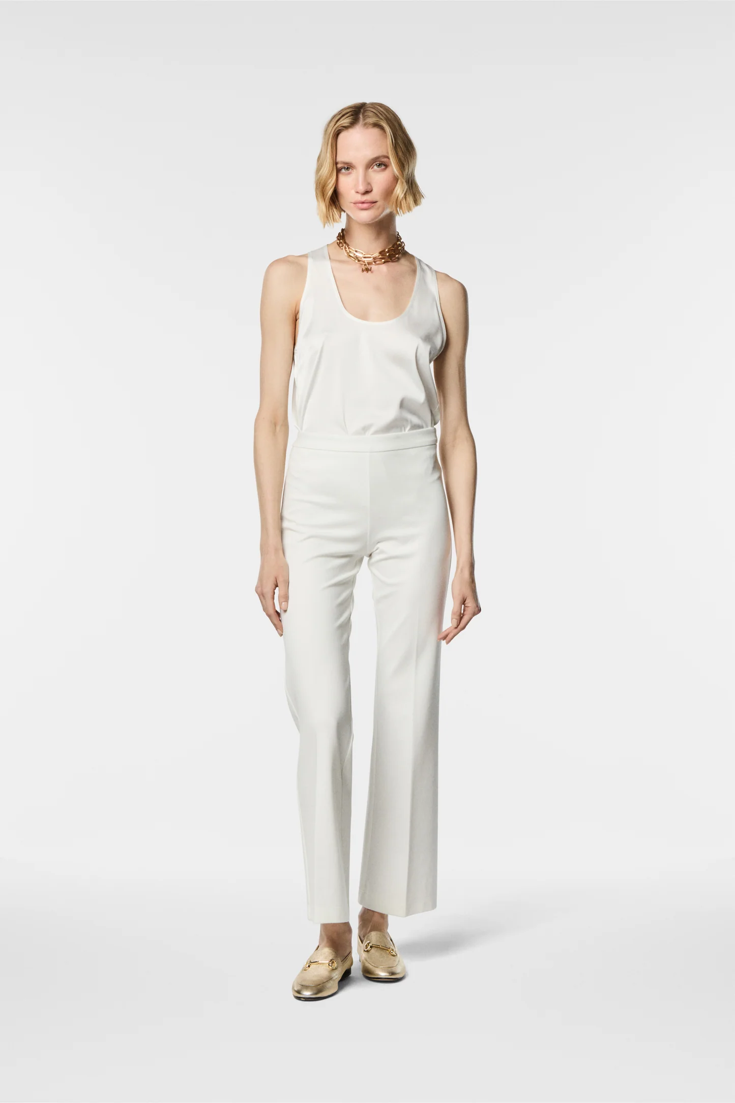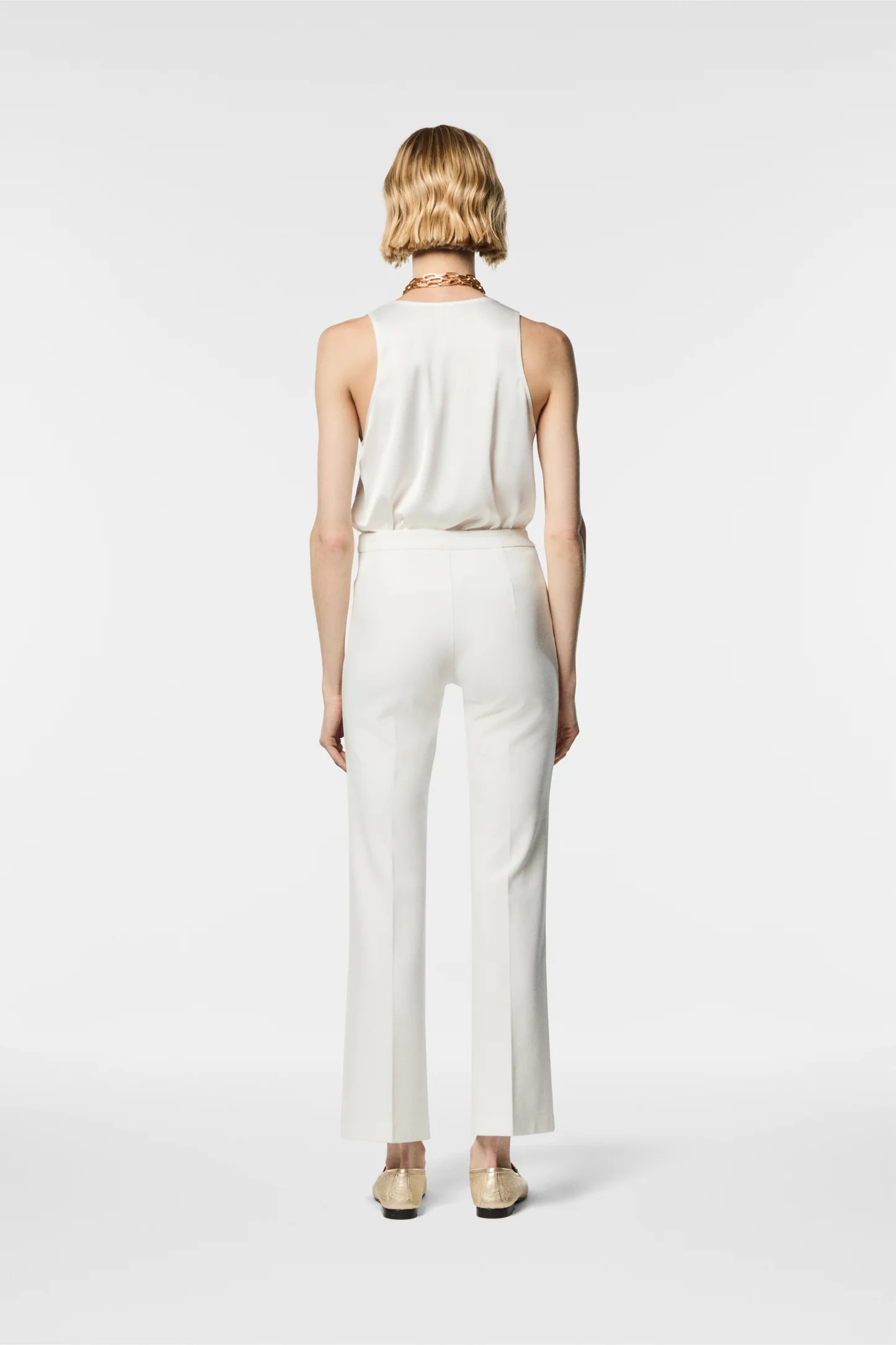 Pantalone trombetta in punto milano Linea a campana leggera crea un look sofisticato, perfetto per il lavoro o le occasioni piรน formali Completo con la giacca BURGOS Composizione: 65% Viscosa 30% Nylon 5% Elastan