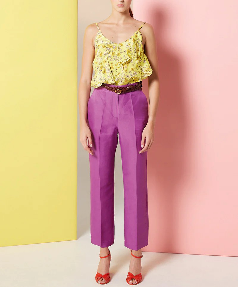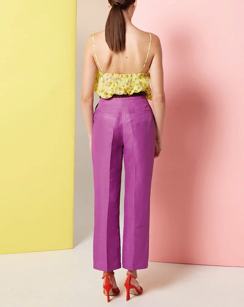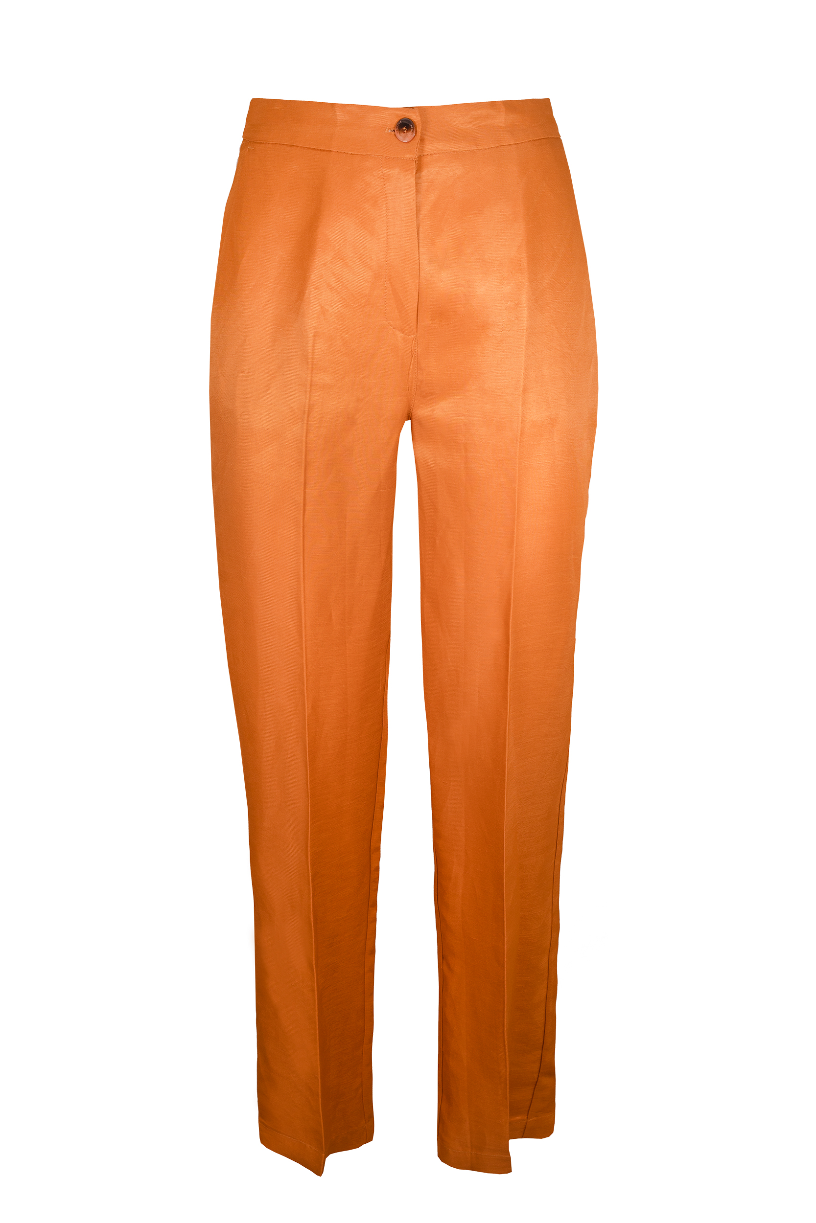 Il Pantalone Eugenia NENETTE, รจ un pantalone chino in twill di lino viscosa lucido. Tasche laterali e due a filo posteriori, Chiusura con bottone e lampo. Completo con la giacca BLEACH.