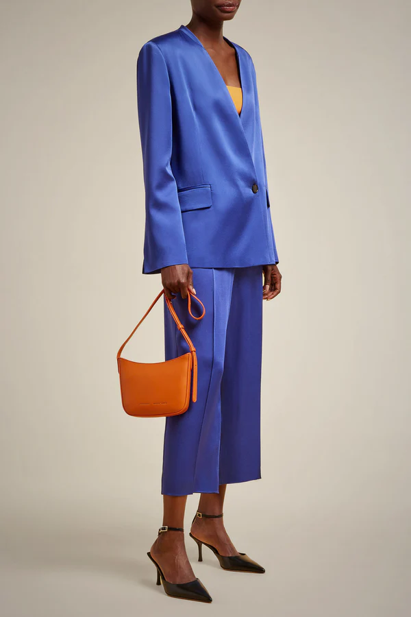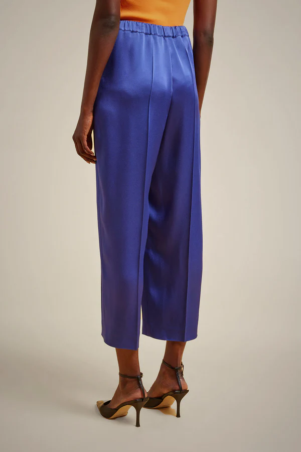 Il Pantalone in raso LIVIANA CONTI, รจ un pantalone in raso fluido, fascione in vita elasticizzato, tasche lungo in fianchi, piega al centro gamba.